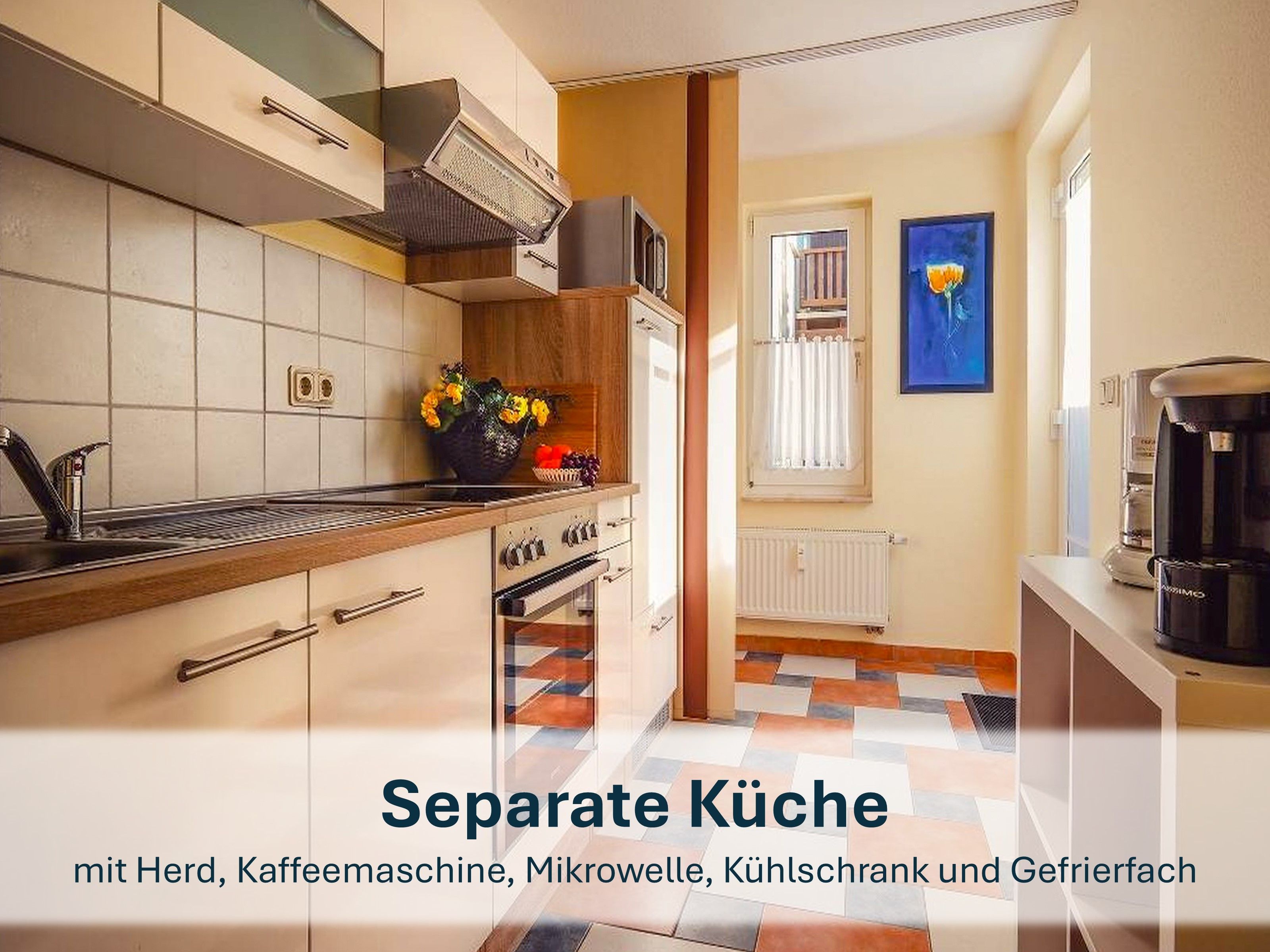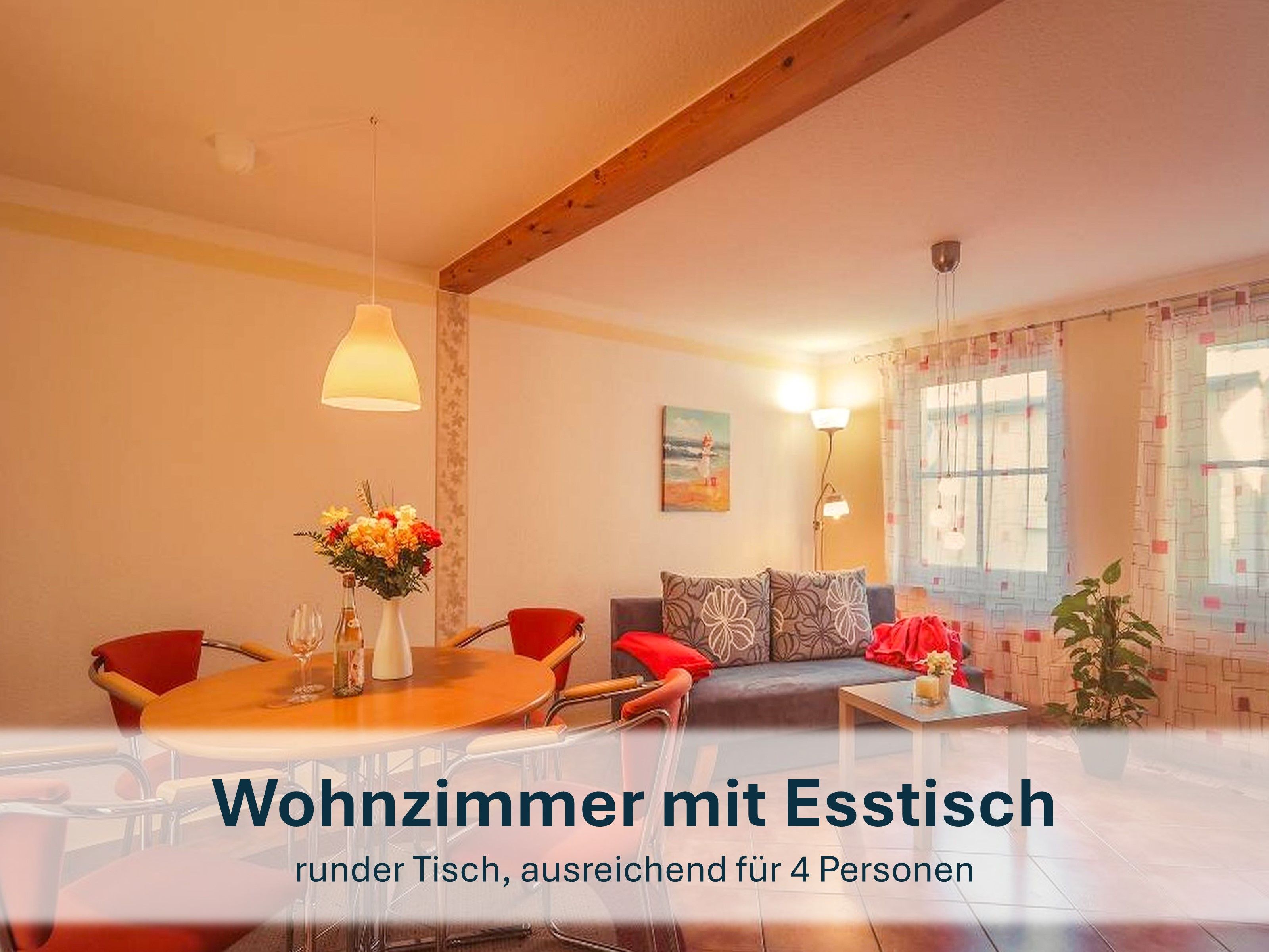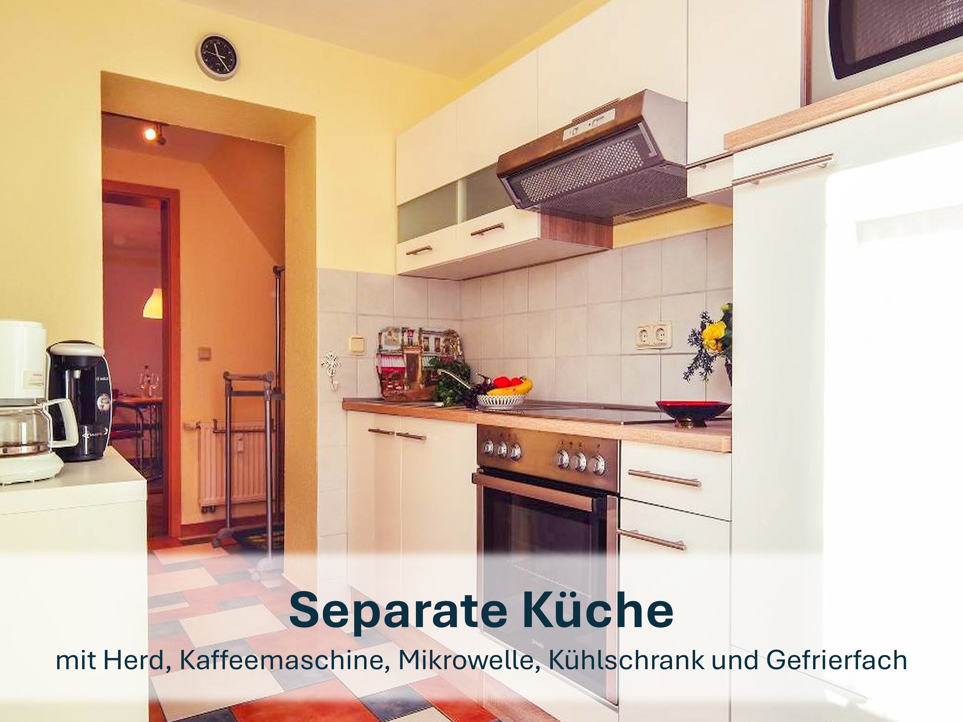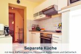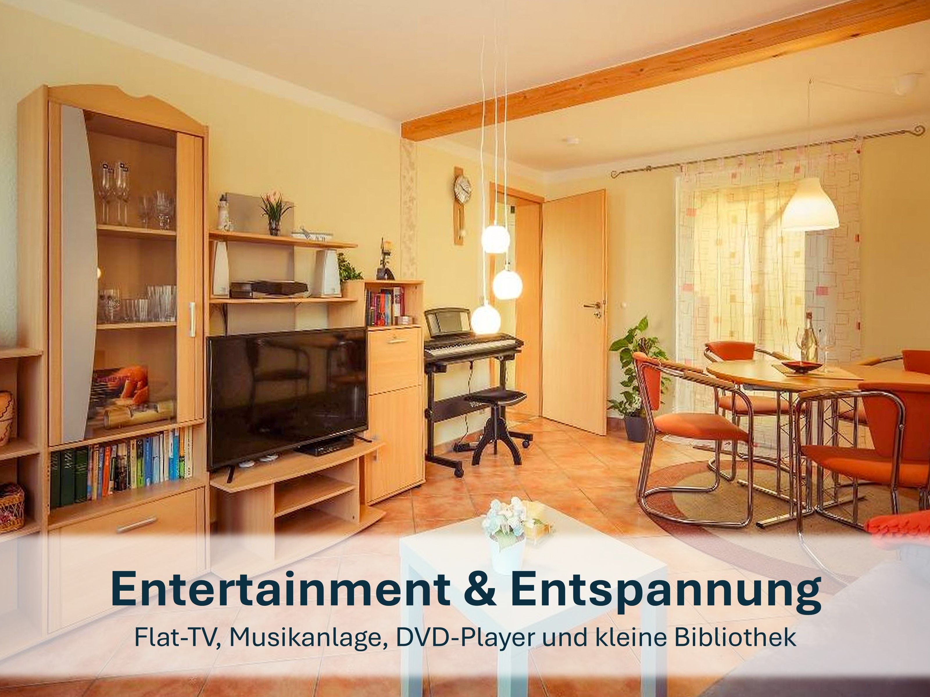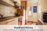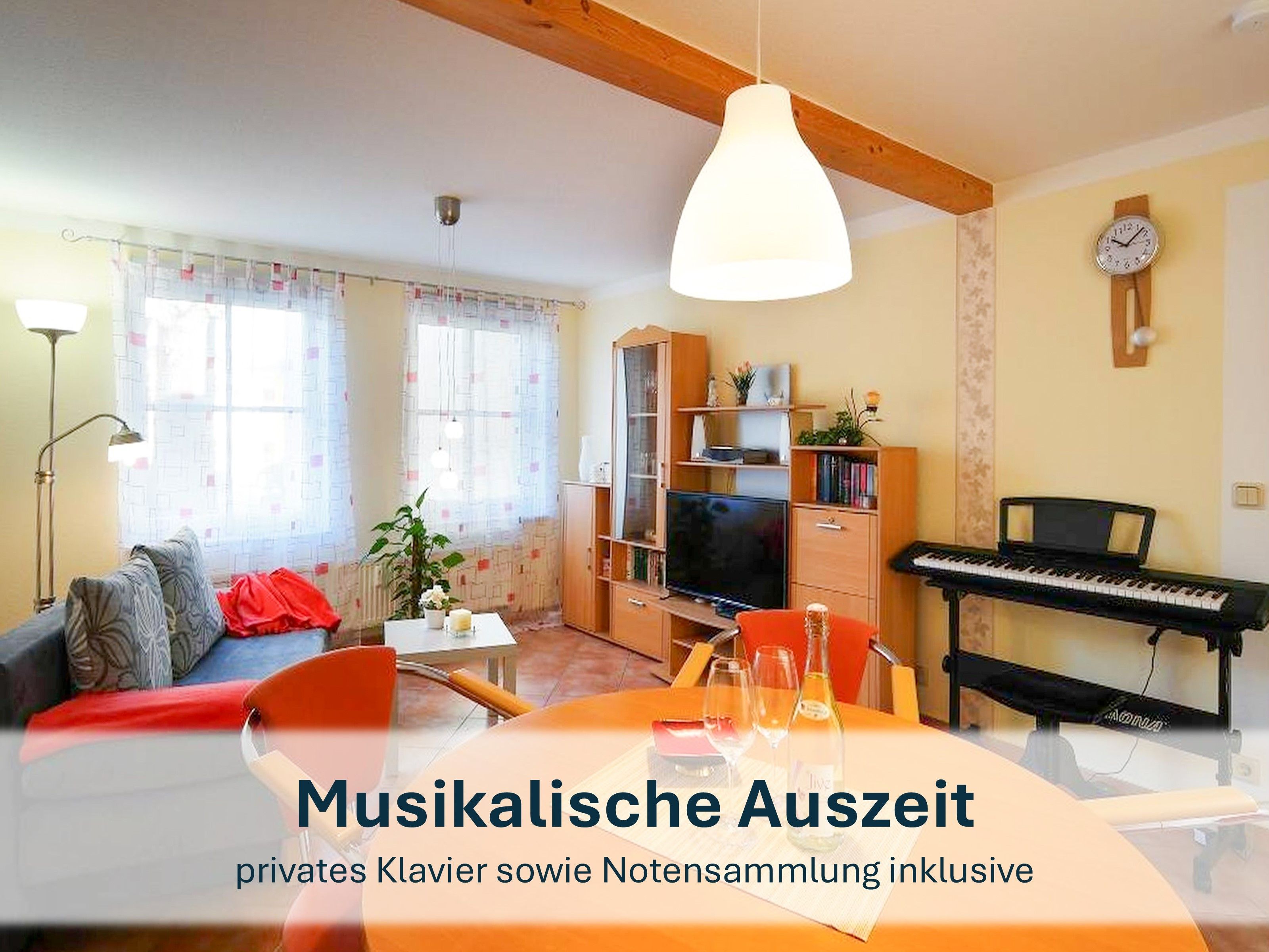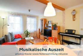 Der großzügige Wohnbereich heißt Sie mit einer gemütlichen Couch willkommen, die bei Bedarf auch in ein komfortables Schlafsofa umgewandelt werden kann. Zudem erwarten Sie ein Flat-TV, eine kleine Bibliothek, ein runder Esstisch für vier Personen und das besondere Highlight - ein Klavier. Die separate, vollständig ausgestattete Küche lässt keine Wünsche offen und bietet alles, was Sie benötigen, um Ihre Lieblingsgerichte zuzubereiten.