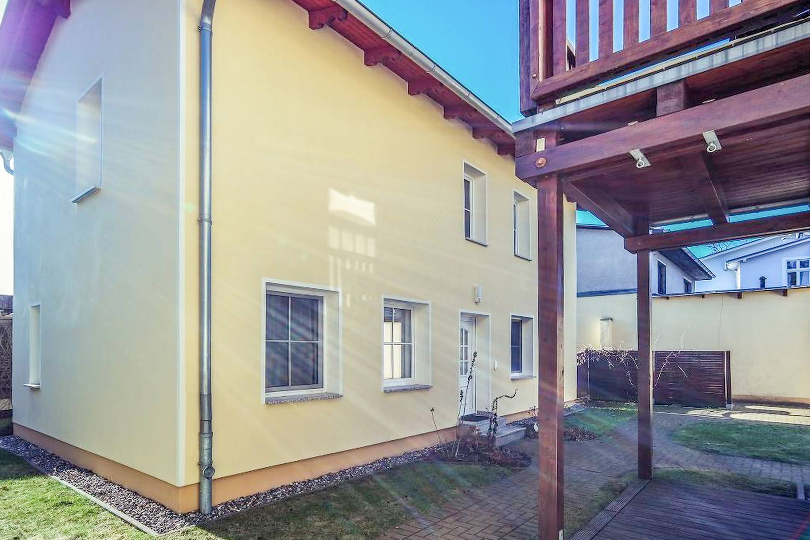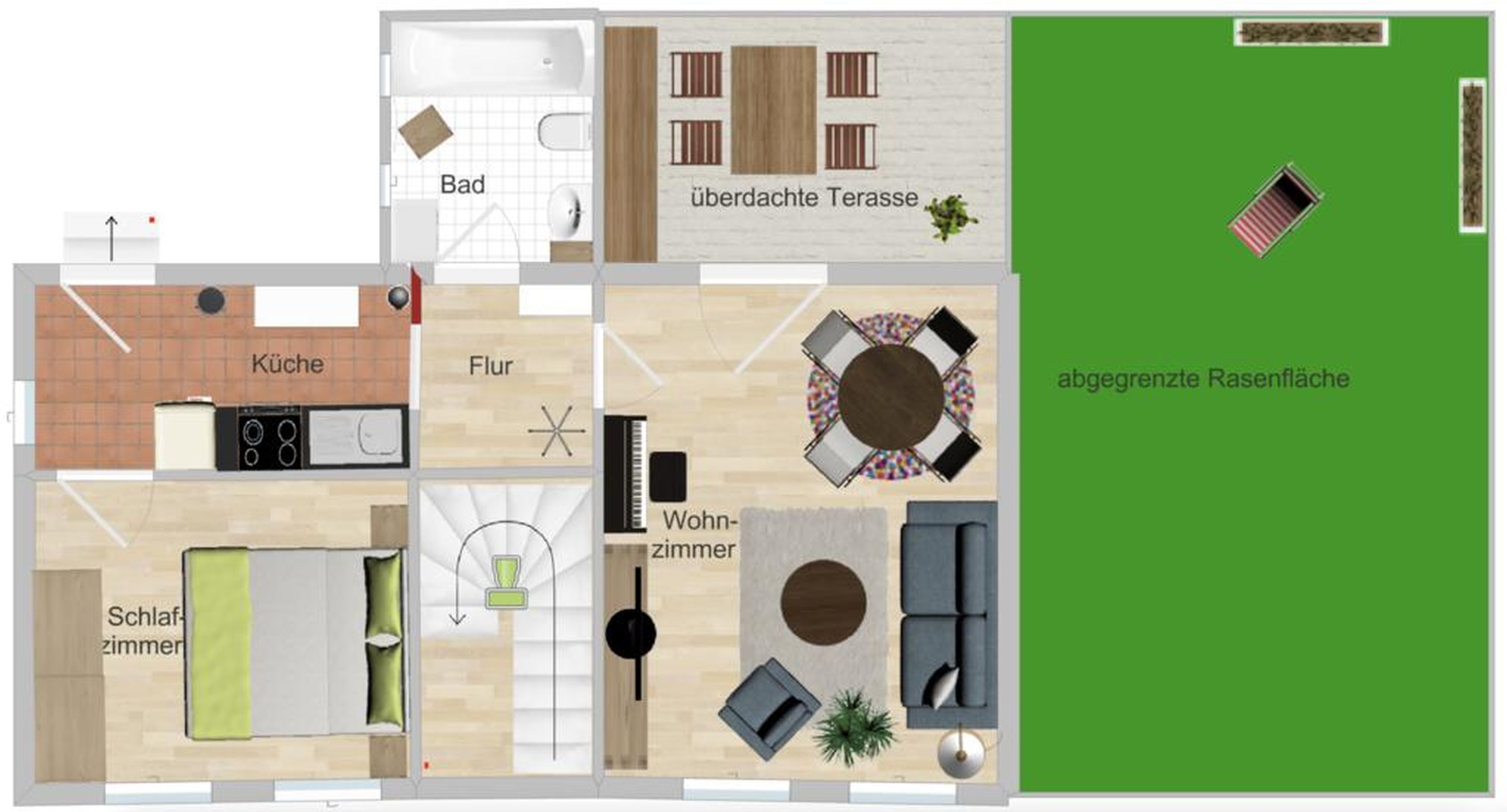 Genießen Sie die sonnige Südlage im überdachten Atrium, das mit gemütlichen Gartenmöbeln ausgestattet ist. Die angrenzende Rasenfläche steht Ihnen ganz privat zur Verfügung und lädt zum Entspannen ein.