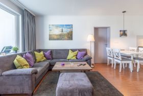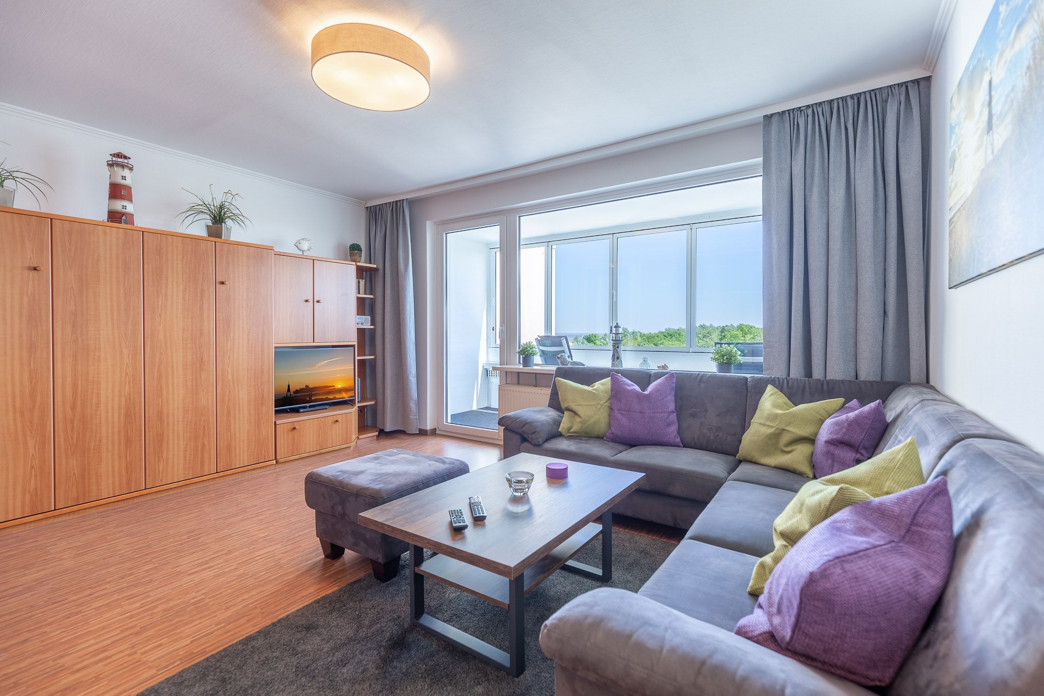 Ein komfortables Ecksofa lädt zum Verweilen ein. Währenddessen sorgen ein Flachbild-TV und kostenloses WLAN für beste Unterhaltung. Den Abend können Sie auf dem verglasten Balkon bei einem Glas Wein mit Blick auf den Weltschifffahrtsweg ausklingen lassen. Die Verglasung des Balkons lässt sich auf Wunsch öffnen. Ein zweiter Balkon ist vom Schlafzimmer aus zugänglich.
