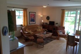 Das Wohnzimmer ist sehr bequem mit Sitz- und Essecke, Sat-TV, Stereoanlage-CD eingerichtet. Eine komplett eingerichtete Küchenzeile ,E-Herd,Toaster, Geschirrspüler, Mikrowelle, Wasserkocher, Kaffeemaschine, Bosch Tassio Kaffemaschine usw. Auf der Gartenterrasse mit Sitzmöbeln können Sie einen herrlichen Blick auf den Garten und die Düne mit Promenade genießen. Direkter Zugang durch den Garten zum eigenen Strandzugang und den Strandkörben. Für Familien mit Kindern. Haustiere erlaubt !