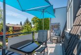 • großer Balkon mit Einsitzer-Strandkorb, Sitzmöbeln und Sonnenschutz