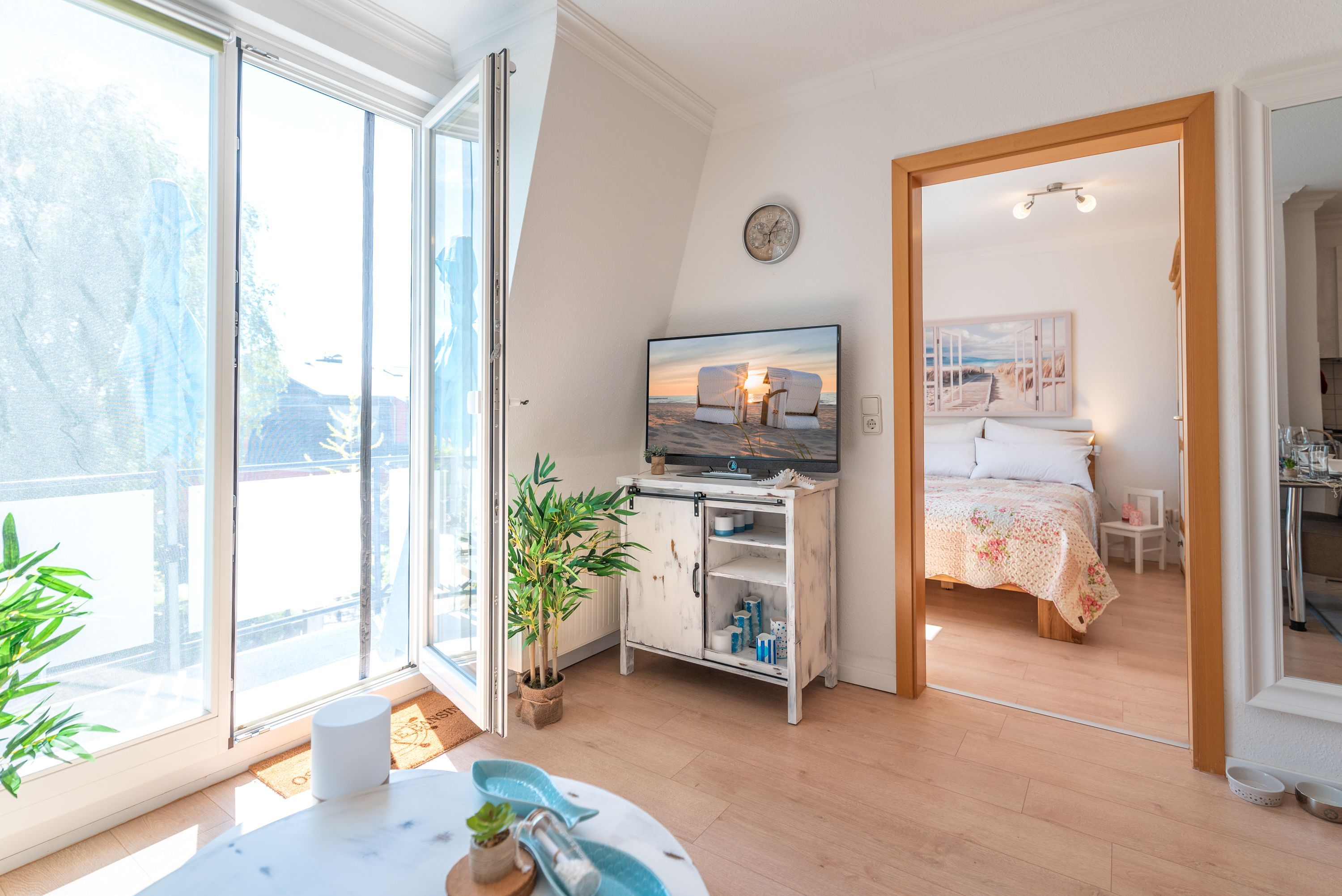 • Schlafmöglichkeiten: Schlafsofa (1,60 x 2,00 m) im Wohnbereich und ein gemütliches Schlafzimmer mit Doppelbett. Beide Bereiche sind mit Flat-TVs ausgestattet.