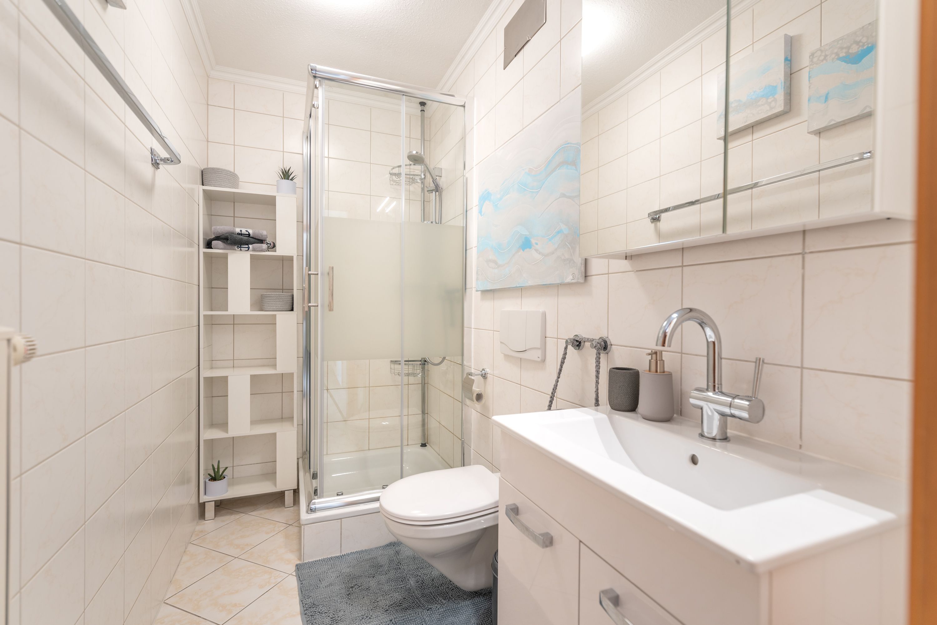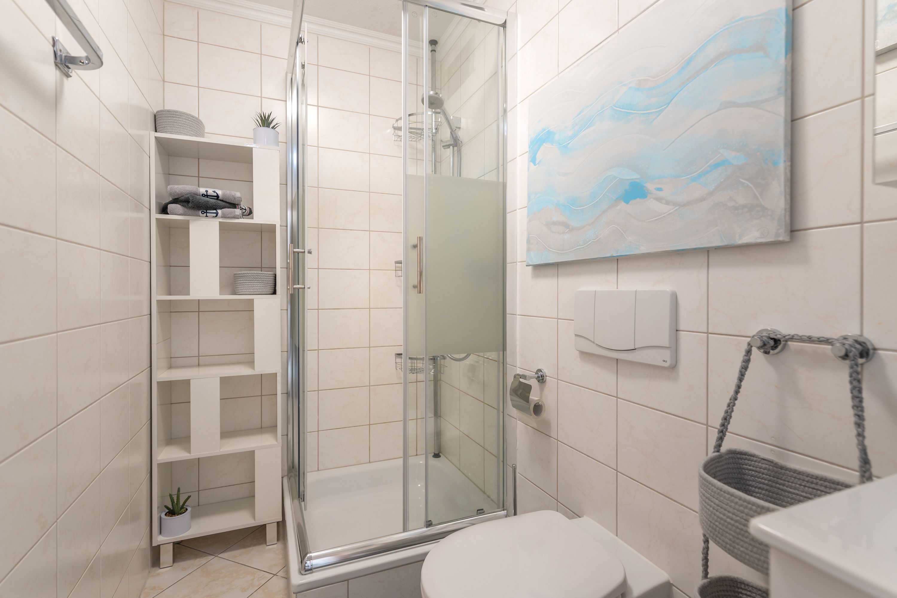 • Badezimmer: Modernes Badezimmer mit Ganzglasdusche und WC.
