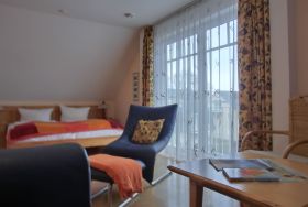 Die 1-Zimmer-Ferienwohnung, im 2. Obergeschoss, erstreckt sich über eine großzügige Fläche von 36 m² und verfügt über einen geschmackvoll eingerichteten Wohn- und Schlafraum. Die liebevoll gestaltete Einrichtung sorgt dafür, dass Sie sich sofort wie zu Hause fühlen werden. Hier finden Sie alles, was Sie benötigen: eine gut ausgestattete Küche mit Spülmaschine, Mikrowelle, Backofen, Herd, Kaffeemaschine, Kühlschrank mit Gefrierteil und Toaster.