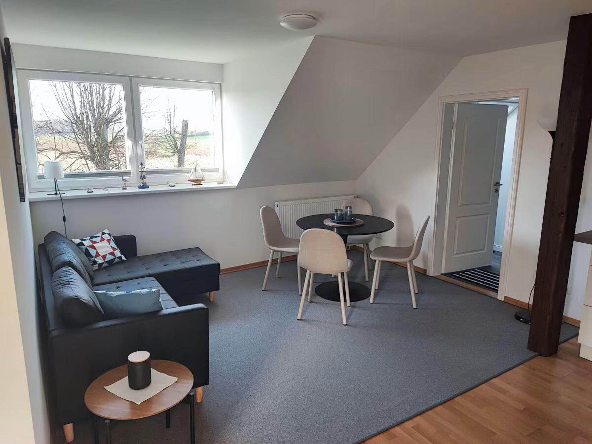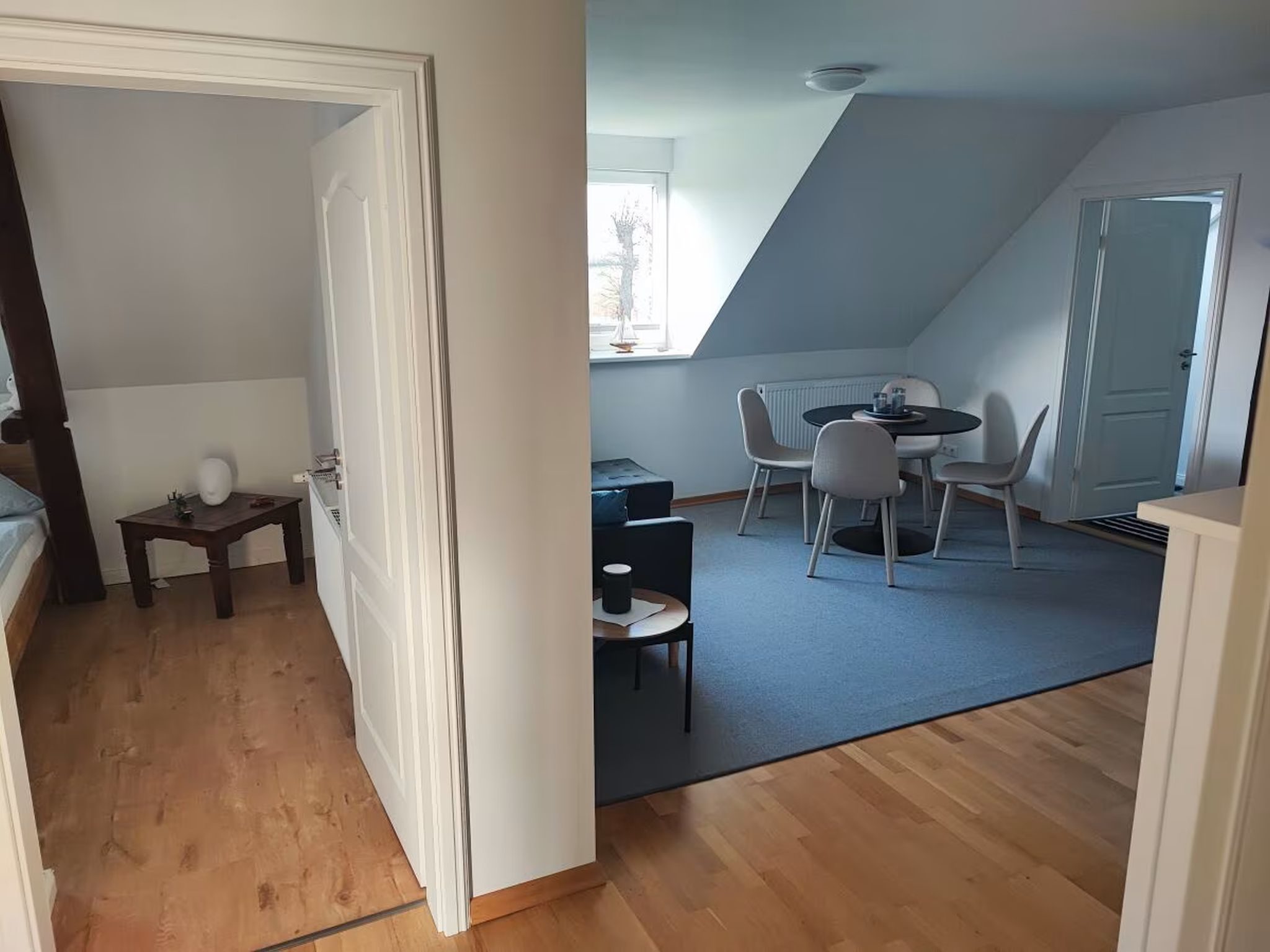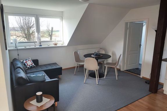 Die Ferienwohnung auf dem Lande für bis zu 4 Personen (plus 1 Kleinkind bis 2 Jahren) befindet sich im Obergeschoss des Haupthauses. Alte freiliegende Balken und eine moderne Einrichtung sorgen für ein charmantes Ambiente.