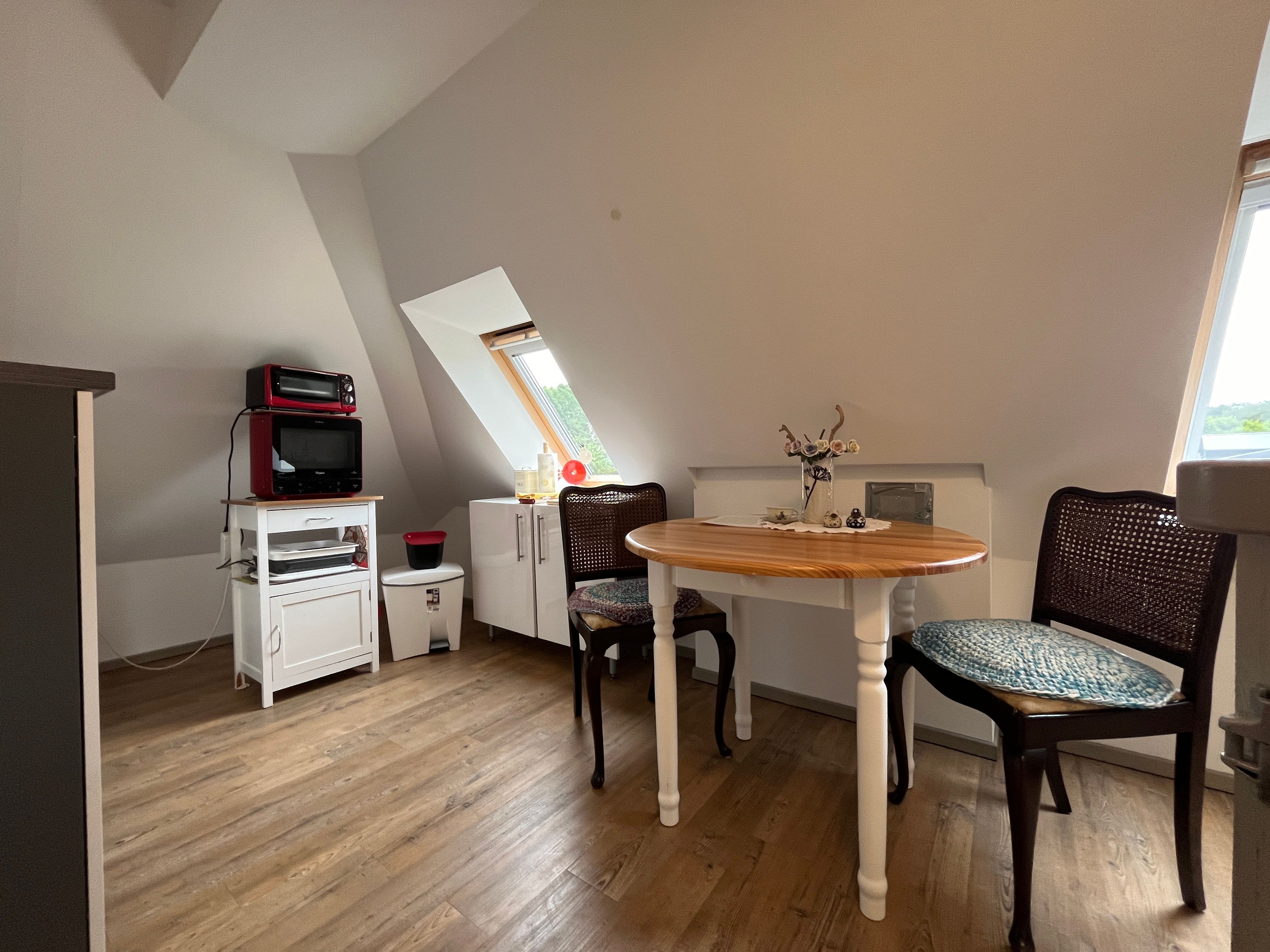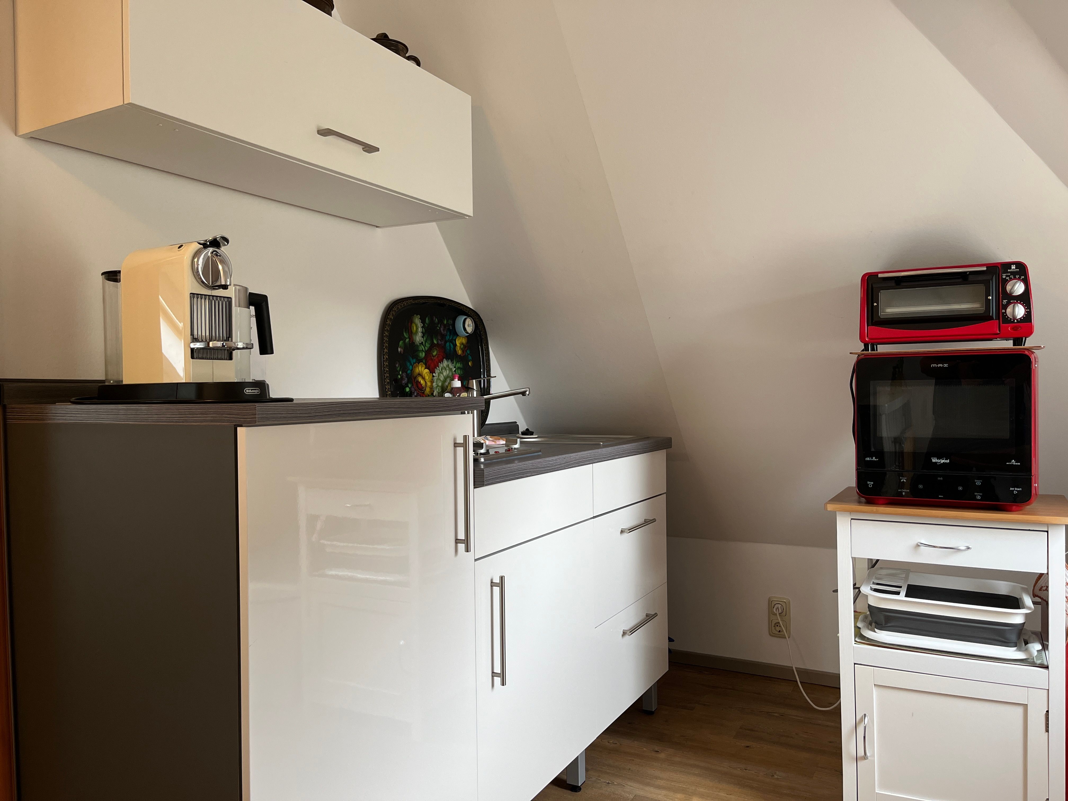 - Miniküche mit Kühlschrank/ Gefrierfach, Mikrowelle inklusive Mini-Backofen, Toaster, 2er Ceran-Herd, Pad-/Kapsel-Kaffeemaschine, Wasserkocher, Esstisch für 2 Personen