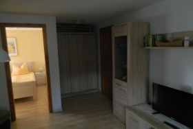 Sie besteht aus einem Schlafraum mit Doppelbett, einem Wohnraum mit Sitzecke und TV, einer abgeschlossenen komplett eingerichteten Küche mit Geschirrspüler, Mikrowelle, Kochplatte, Wasserkocher, Toaster und Kaffeemaschine, Bad mit Dusche/ WC und einem kleinen Flur.