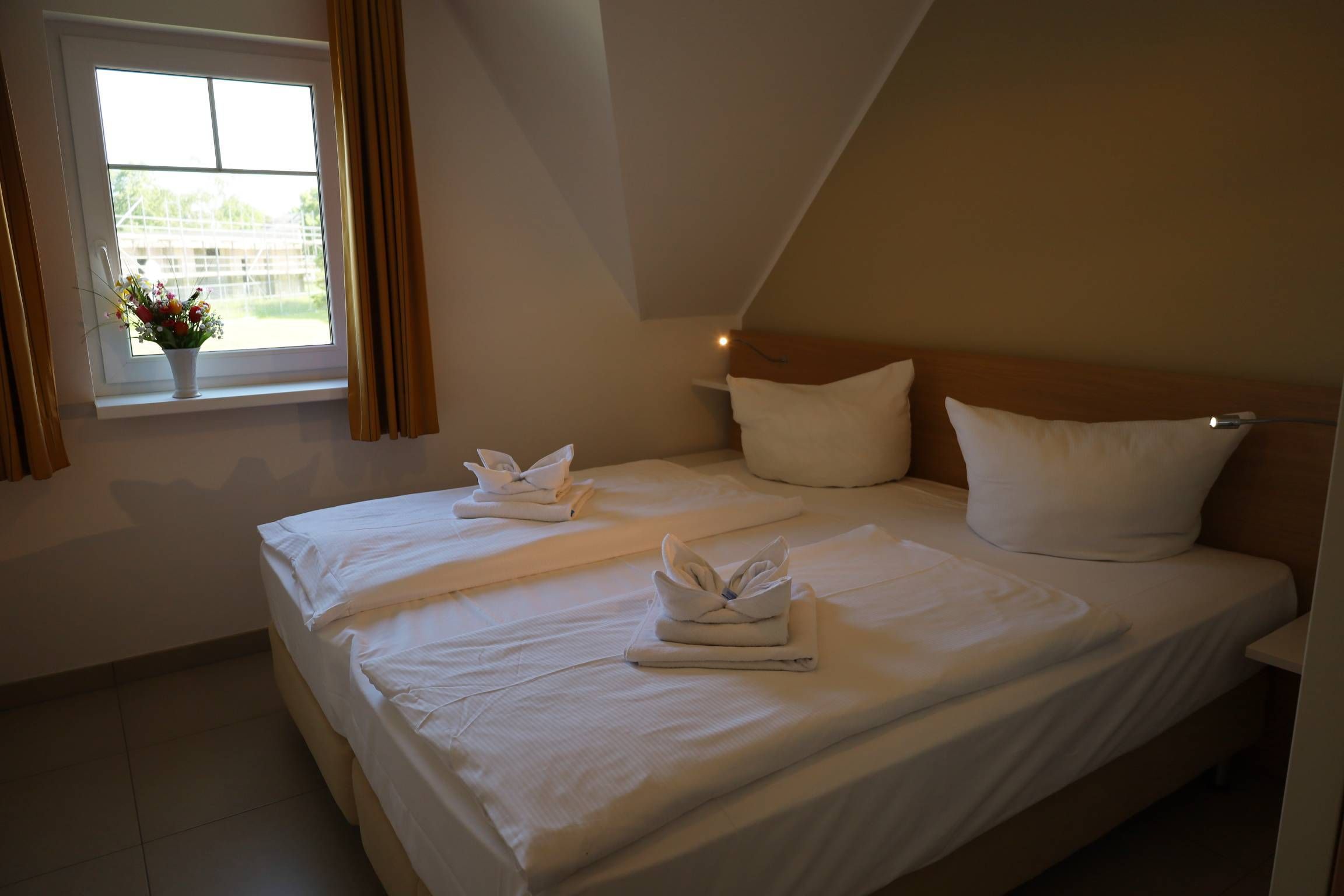 Im Obergeschoss befinden sich zwei separate Schlafzimmer. Eines ist mit einem Doppelbett und einem Kleiderschrank ausgestattet, das andere mit einem Einzelbett und einer großzügigen Kommode. Das dritte Schlafzimmer mit Doppelbett befindet sich im Dachgeschoss und verfügt über einen zusätzlichen Fernseher. Beide Badezimmer verfügen über eine ebenerdige Dusche.