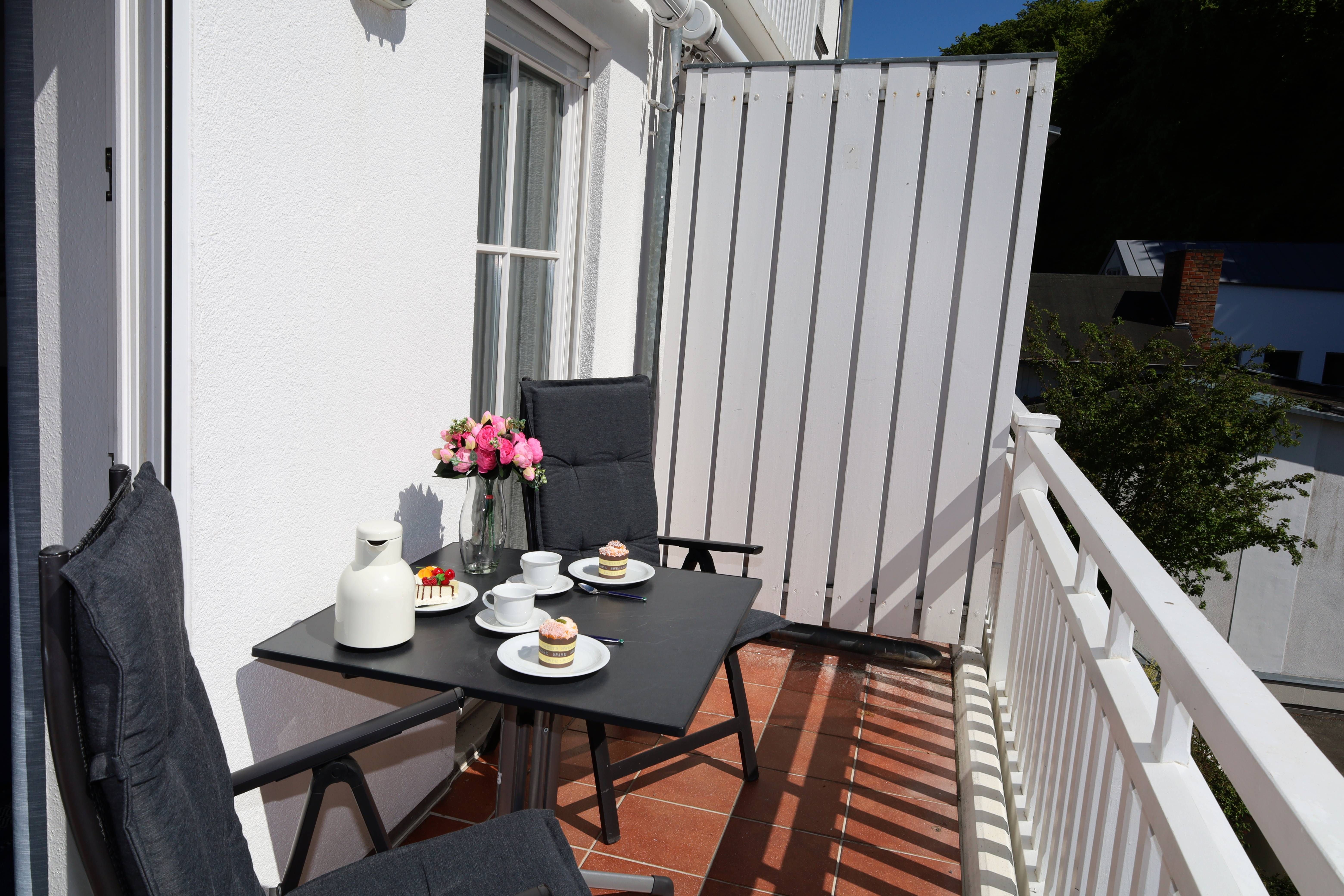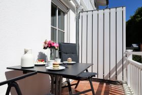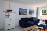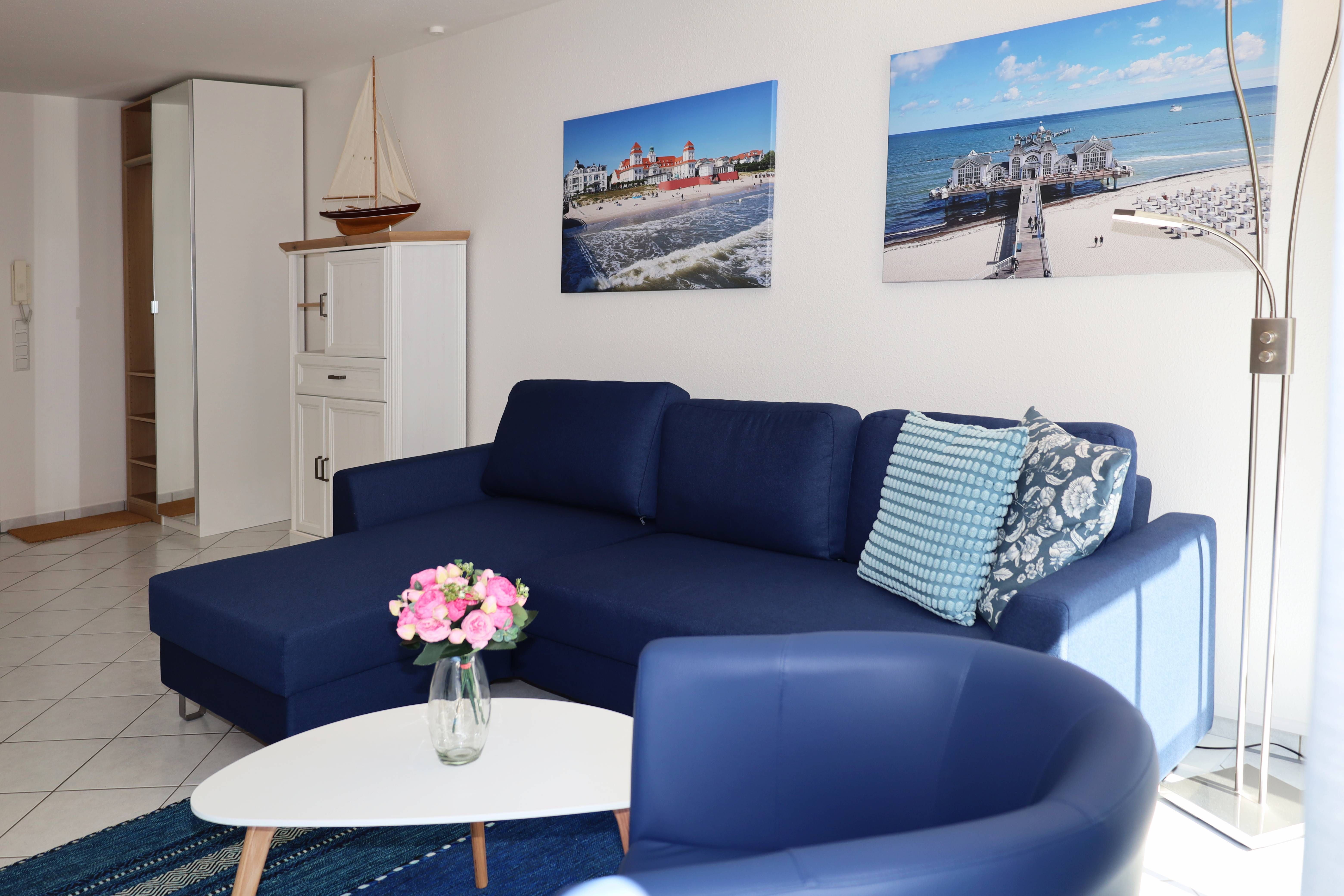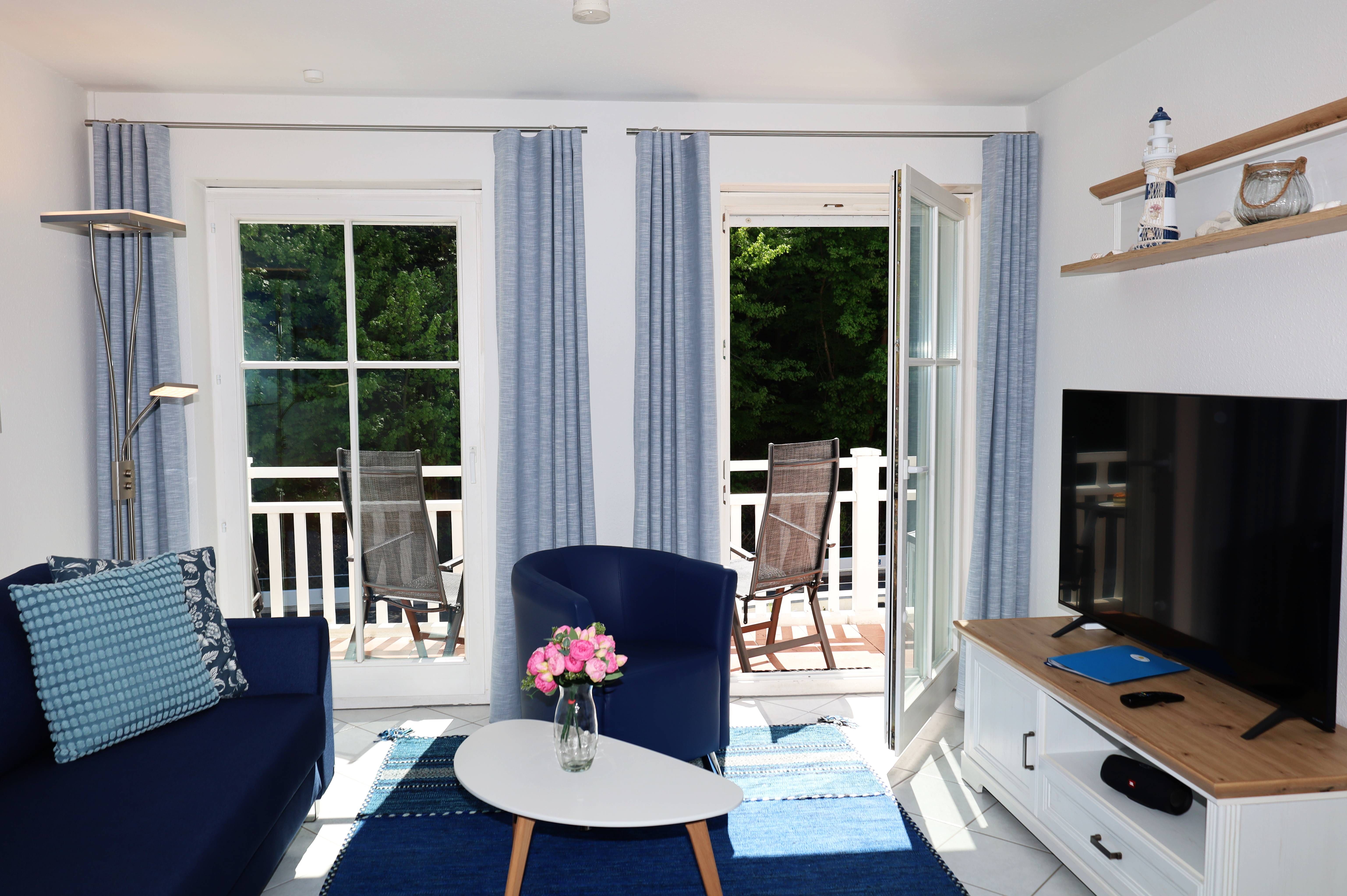 Der helle Wohnbereich lädt mit einer gemütlichen Sitzgruppe zum Entspannen ein. Für Unterhaltung sorgt ein 55-Zoll-Flachbildfernseher, und ein mobiler Bluetooth-Lautsprecher bringt bei Bedarf Ihre Lieblingsmusik ins Urlaubsambiente. Das moderne Schlafsofa kann bei Bedarf als komfortable Aufbettung für eine dritte Person genutzt werden. Vom Wohnzimmer wie auch vom Schlafzimmer gelangen Sie direkt auf den sonnigen Südbalkon der ideale Platz für ein Frühstück an der frischen Luft oder einen entspannten Abend.