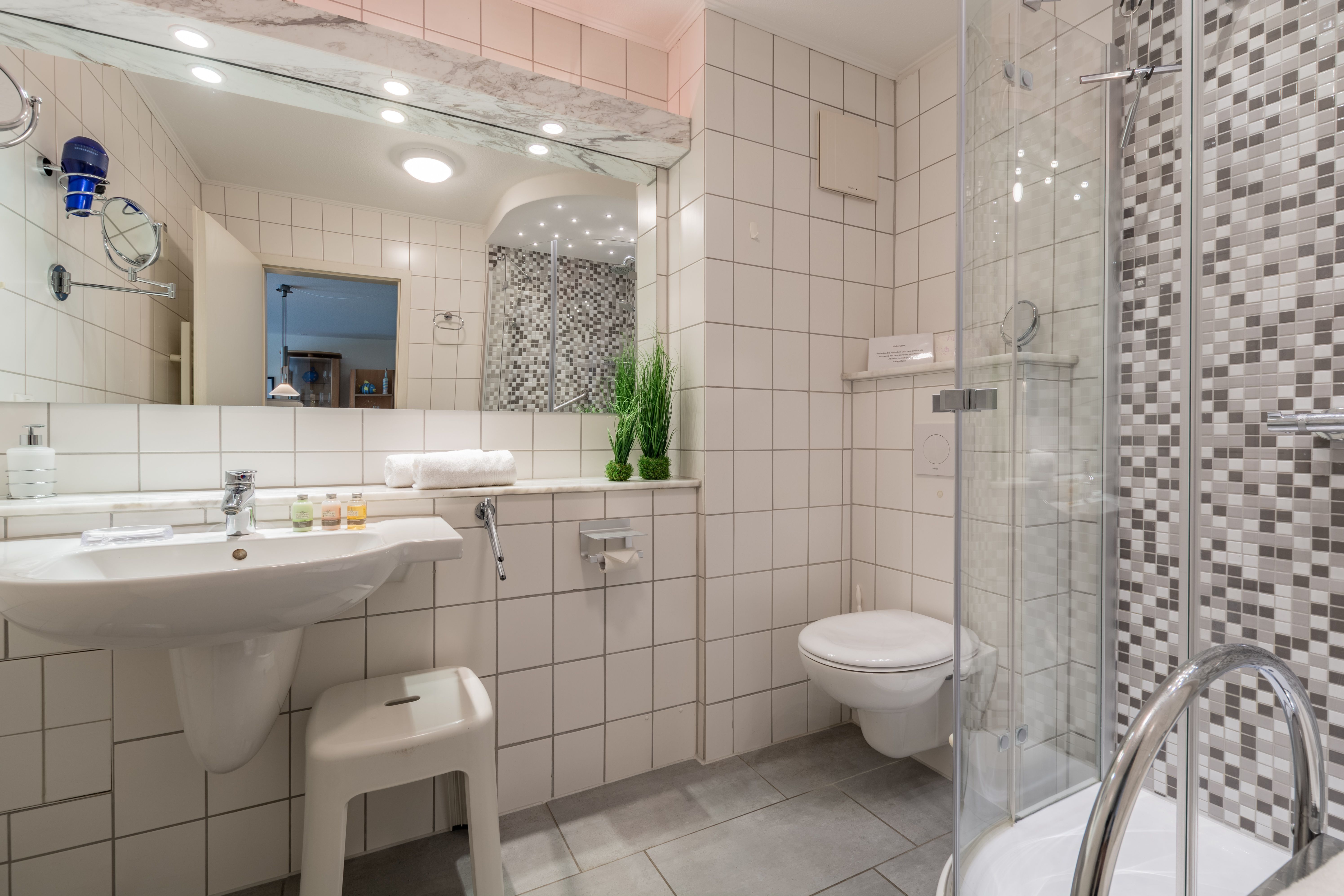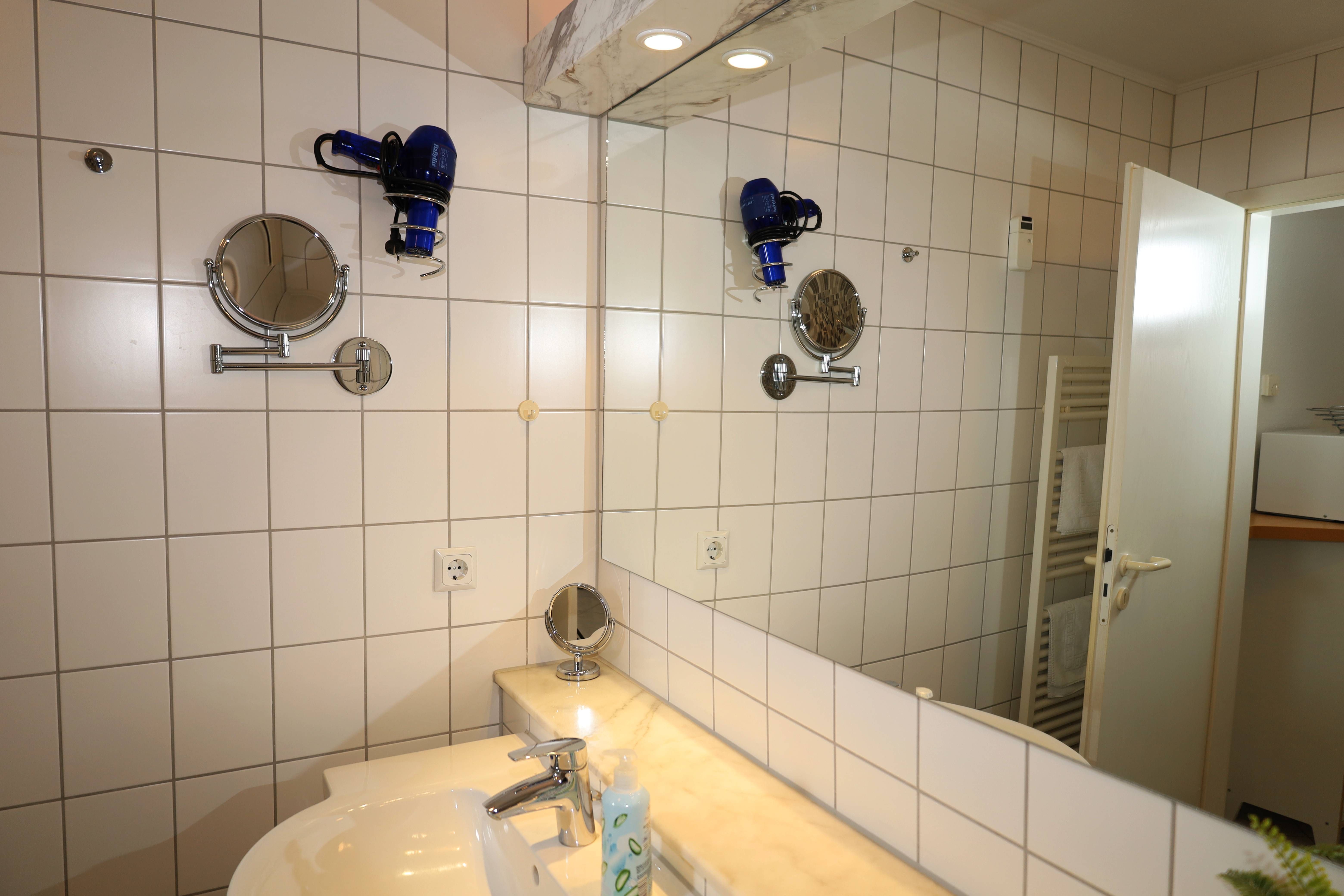 Das lichtdurchflutete Bad ist mit Dusche und WC, einem beleuchteten Waschtisch, Föhn sowie einem beheizbaren Handtuchtrockner ausgestattet. In allen Räumen sorgt eine Fußbodenheizung ganzjährig für angenehme Wärme.