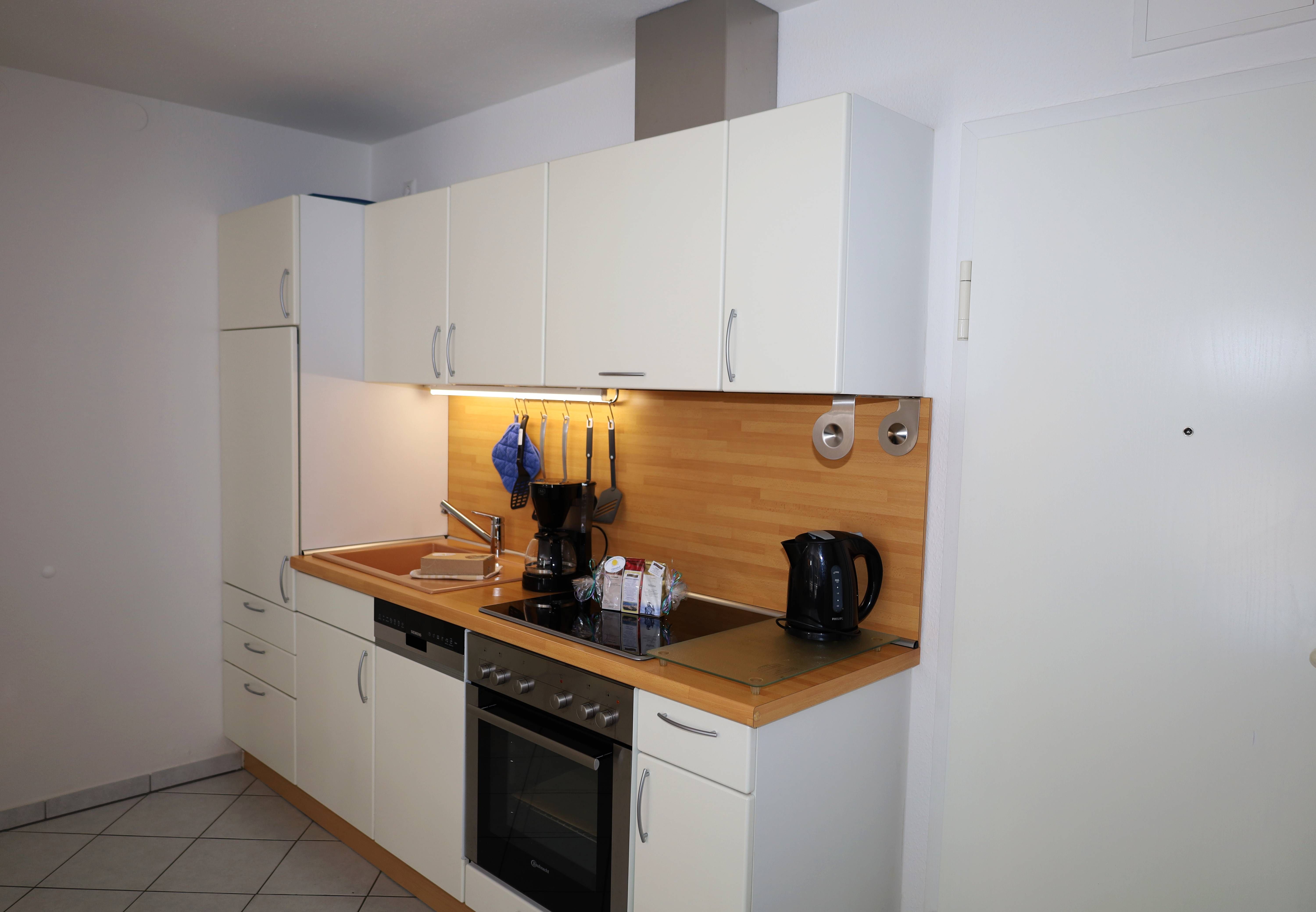 Im Schlafzimmer erwartet Sie ein großzügiges Boxspringbett im Maß 180 × 200 cm, das für erholsame Nächte sorgt, sowie ein geräumiger Kleiderschrank. Die voll ausgestattete Küchenzeile verfügt über einen Kühlschrank mit Gefrierfach, Mikrowelle, Cerankochfeld mit Backofen sowie weitere praktische Geräte wie Wasserkocher, Kaffeemaschine und Toaster perfekt für gemütliche Mahlzeiten in Ihrer Ferienwohnung.