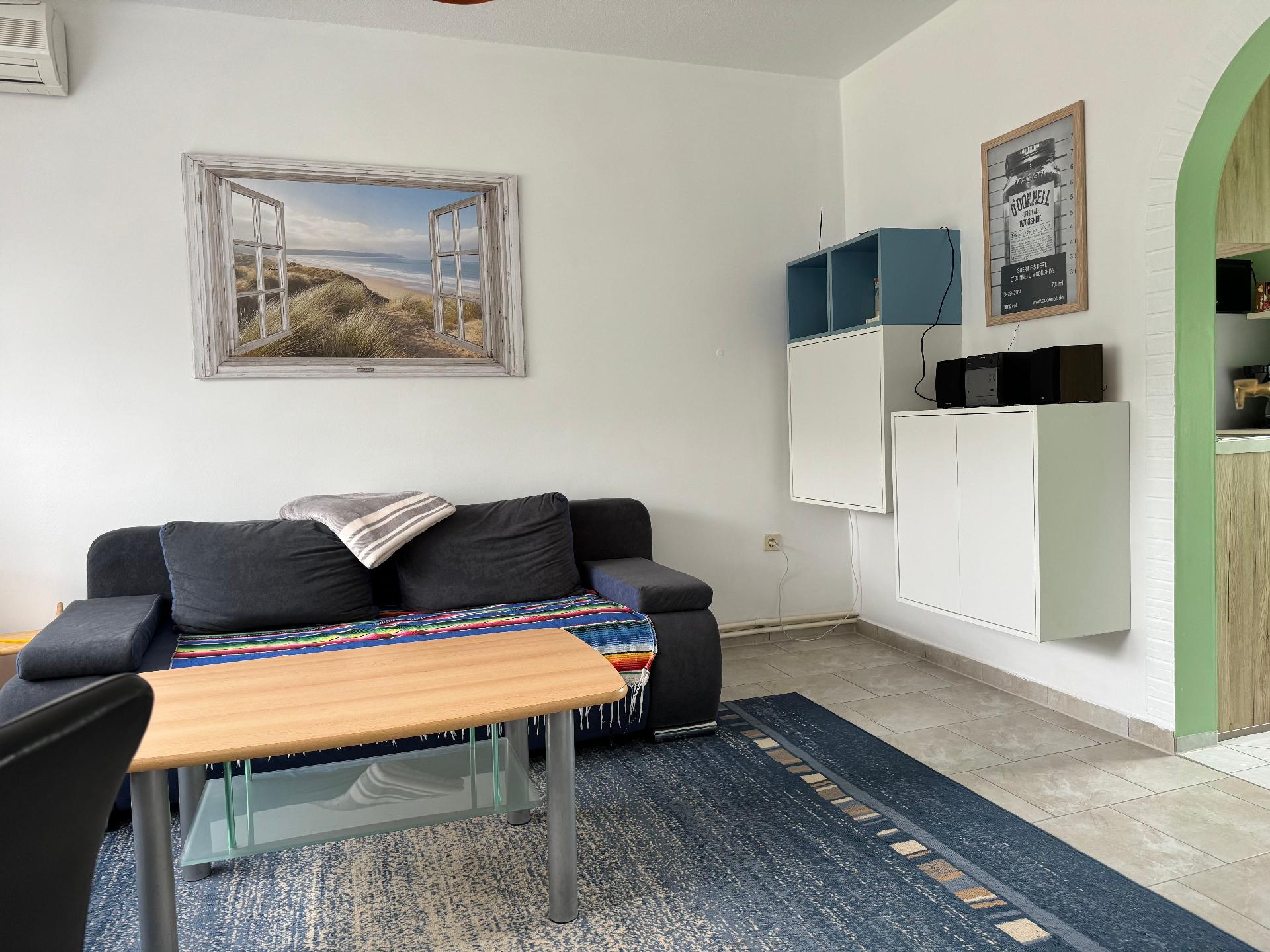 Das Ferienhaus, etwa 45 m² groß, besteht aus folgenden Zimmern: Ein Wohnzimmer, Flatscreen-Fernseher und Schlafcouch; ein Schlafzimmer daneben gelegen mit Doppelbett; eine vollausgestattete Küche mit Herd, Backofen, Mikrowelle, Kaffeemaschine sowie ein angrenzendes Bad mit Dusche und WC.