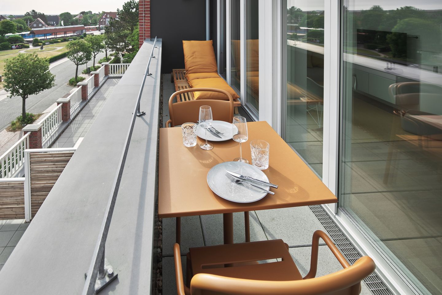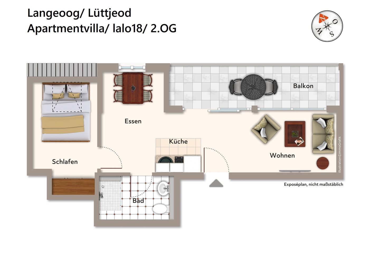 Das Badezimmer bietet Handtuchwärmer, Regendusche, WC, Waschtisch, Föhn und Kosmetikspiegel. Die behagliche Wohnung verfügt über eine tolle, geschützte Loggia mit Gartenmöbeln und Sonnenliege. Nordseefeeling pur!