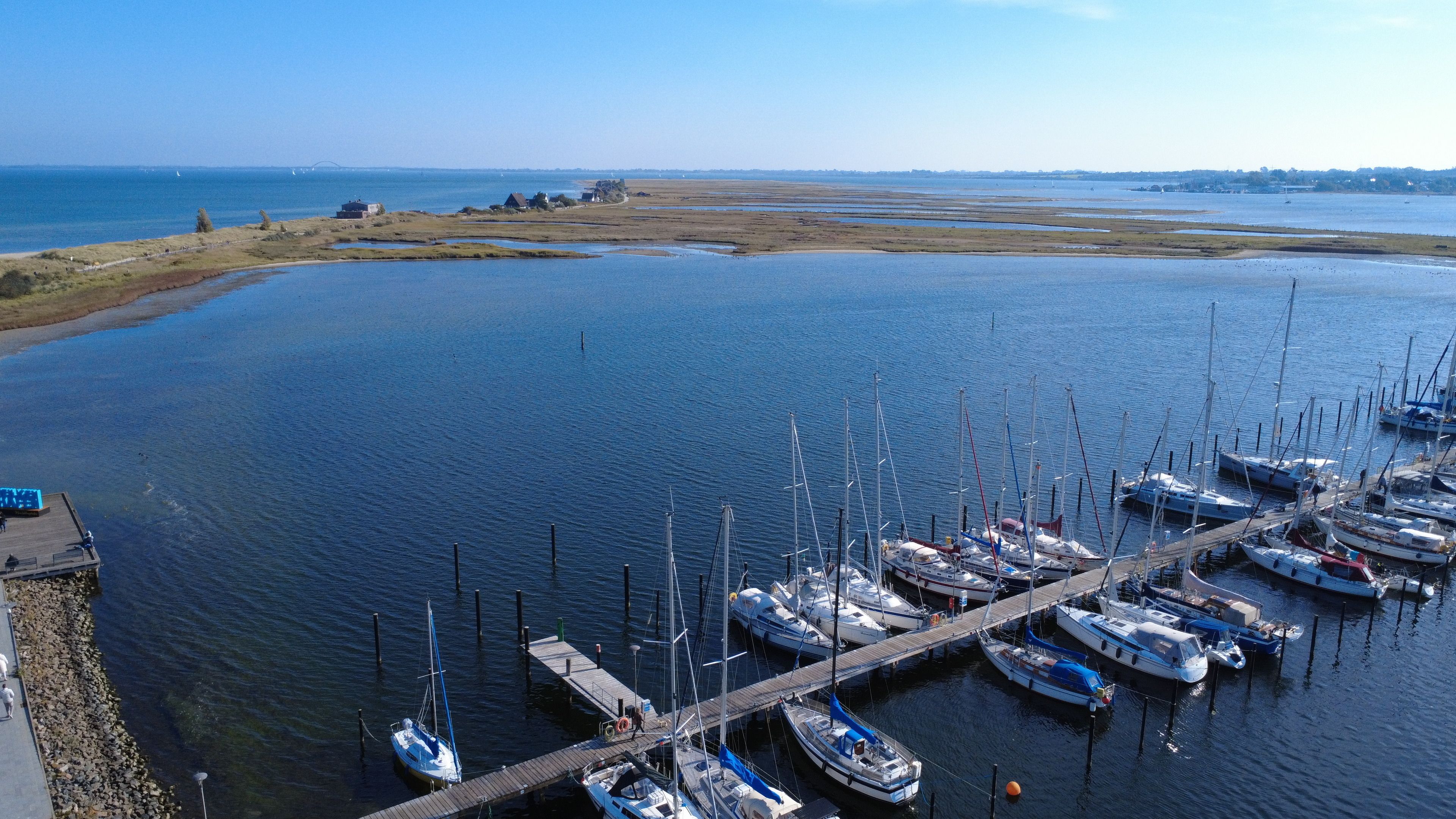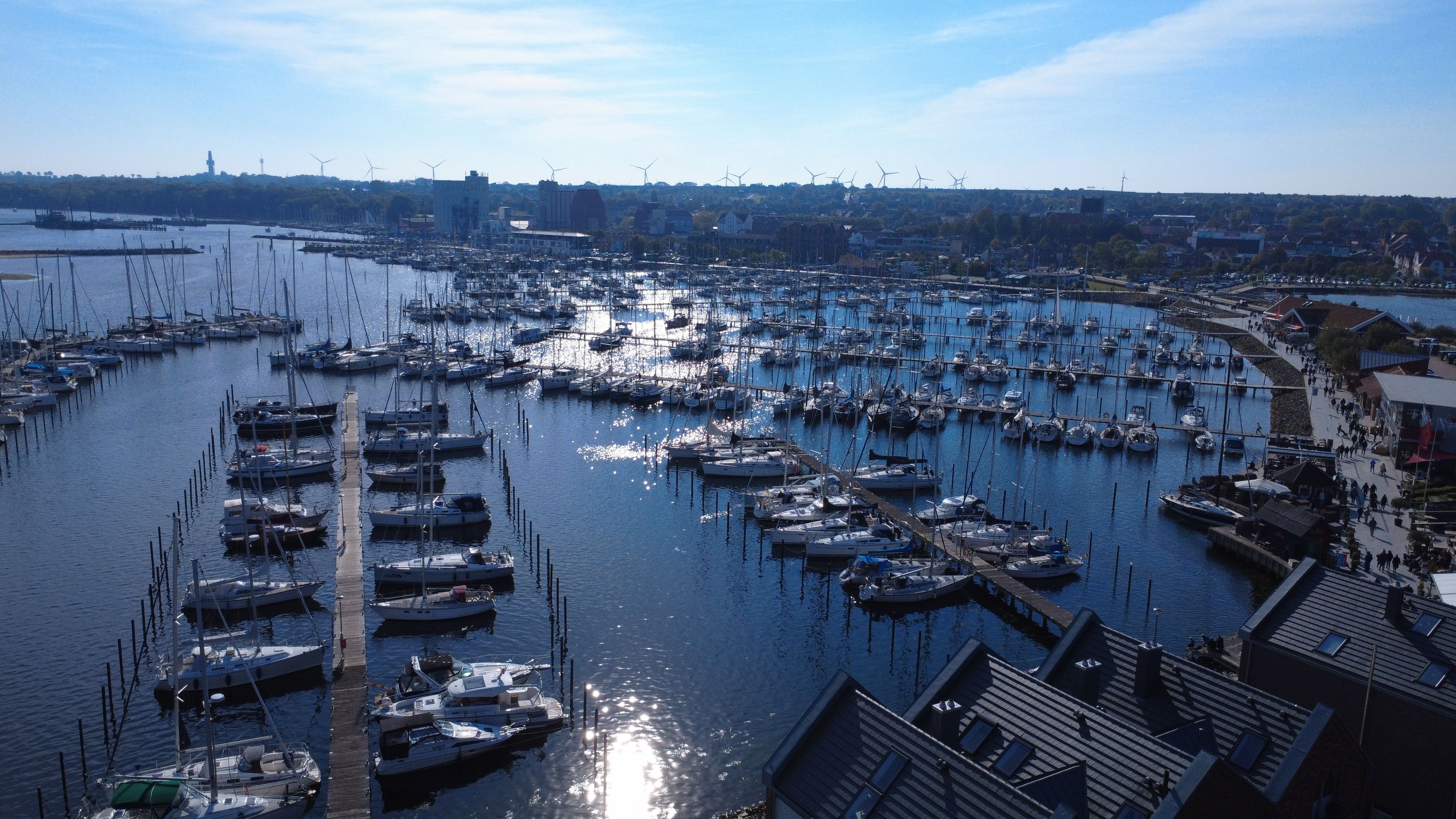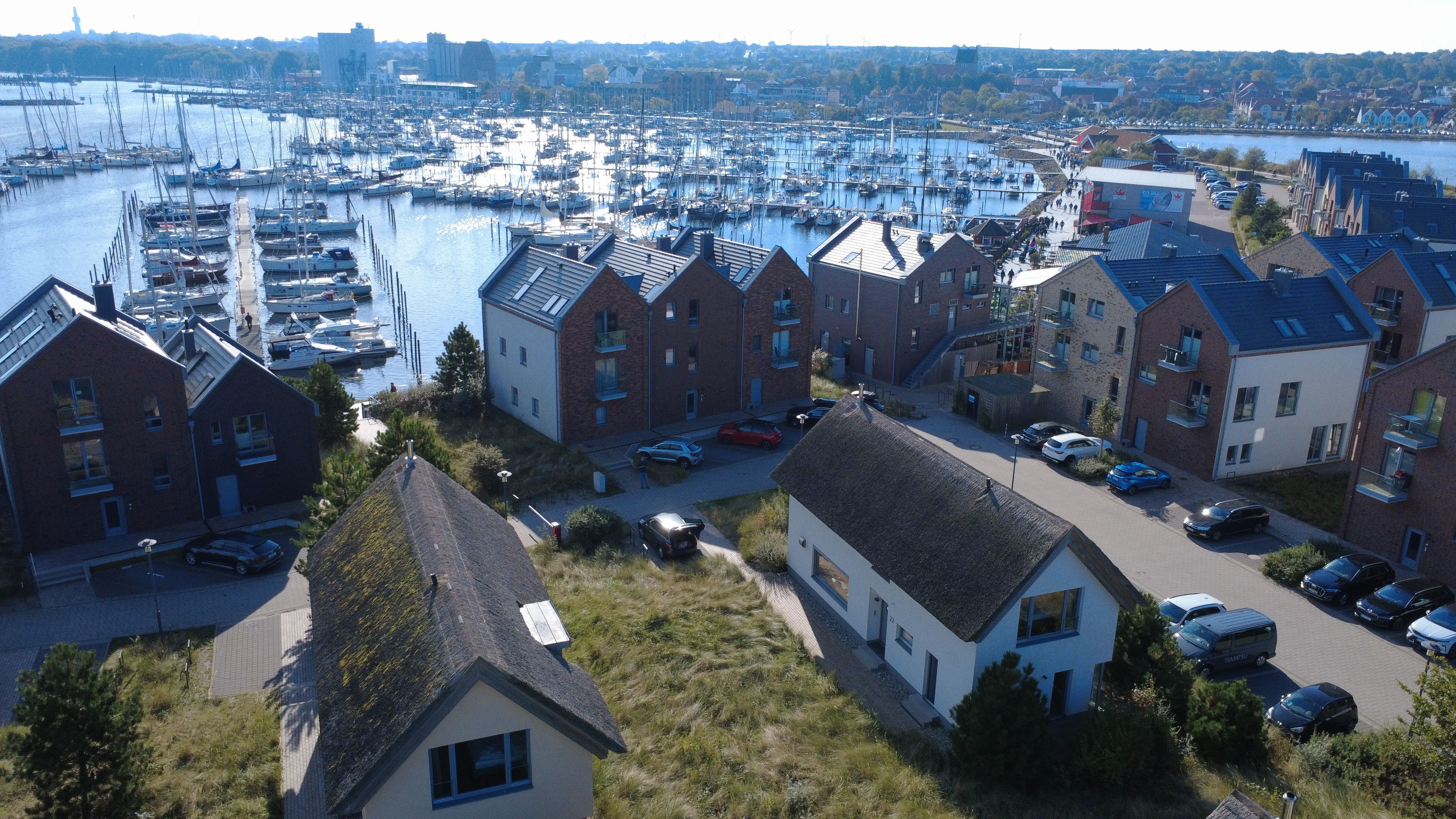 In den Sommermonaten erwartet Sie die sonnige Terrasse mit Strandkorb, Gartenmöbeln, großem Sonnenschirm und Blick auf die Marina. Eine weitere, kleine Terrasse versteckt sich noch hinter dem Haus.