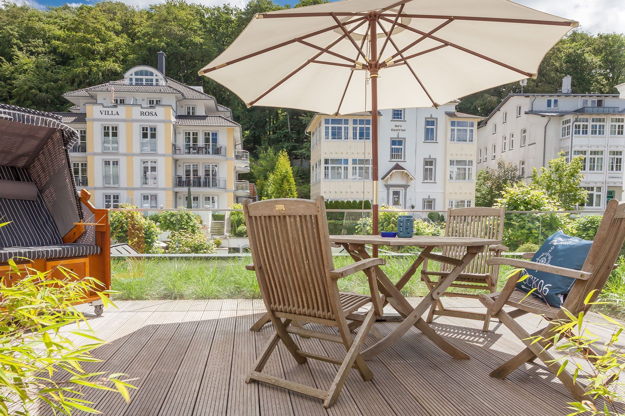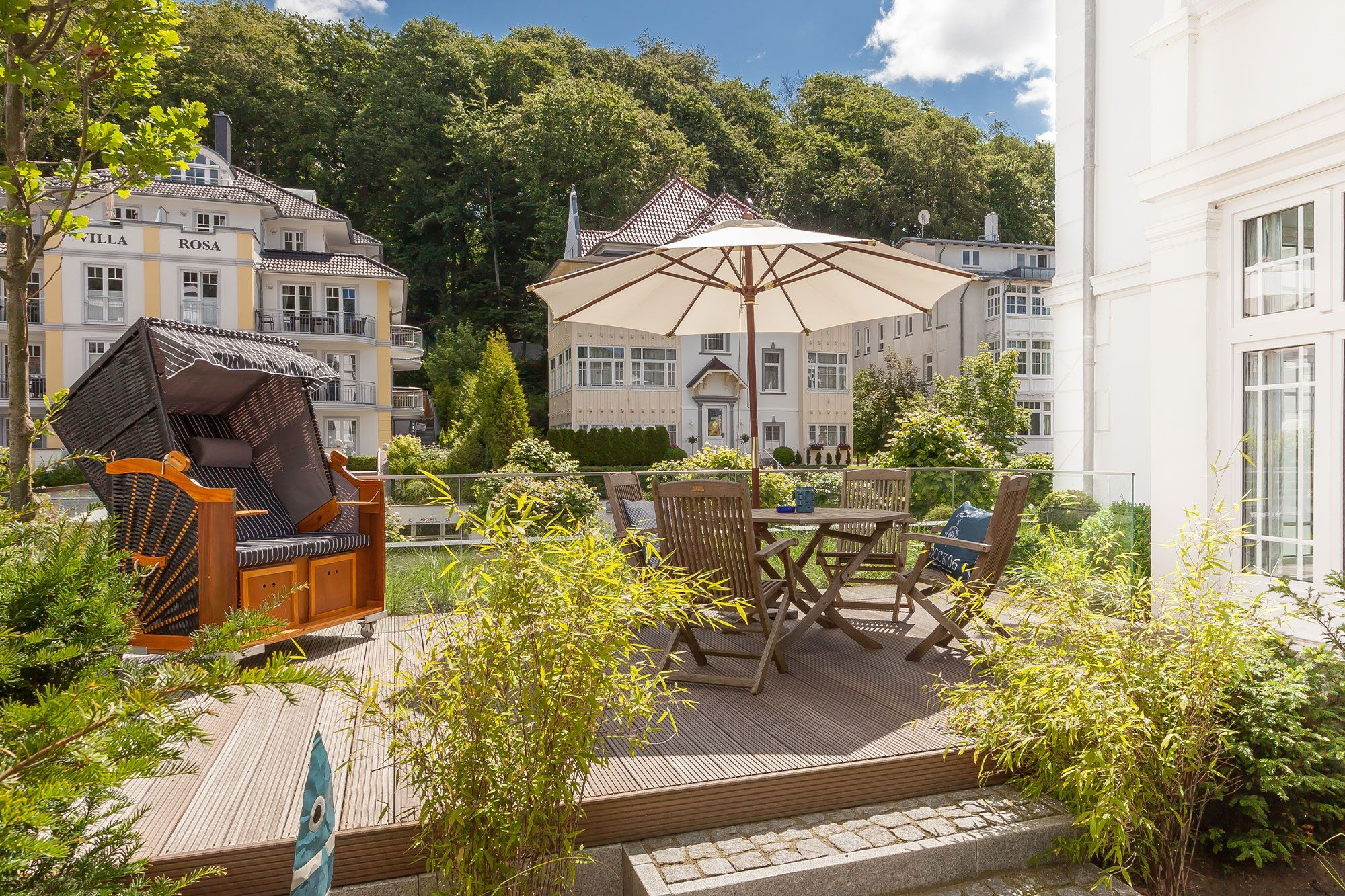 In der warmen Jahreszeit lädt Sie vor der FeWo Ihre private, schön begrünte Terrasse mit Teakholzmöbeln und Strandkorb zum gemütlichen Sitzen an der frischen Ostseeluft ein. Durch die erhöhte Lage sind Sie dabei vor neugierigen Blicken von der Wilhelmstraße geschützt und genießen trotzdem selbst quasi einen Logenplatz mit Aussicht.