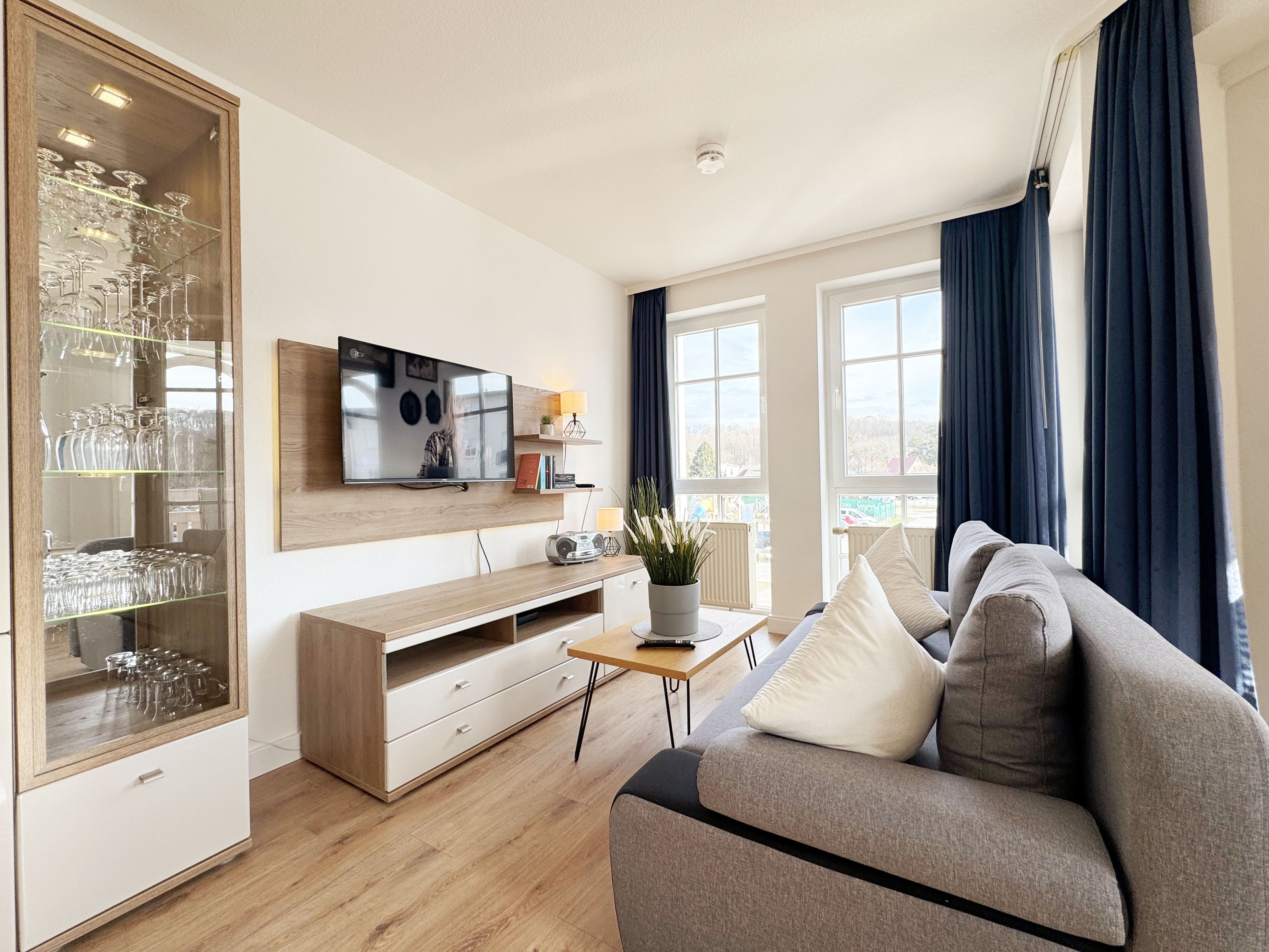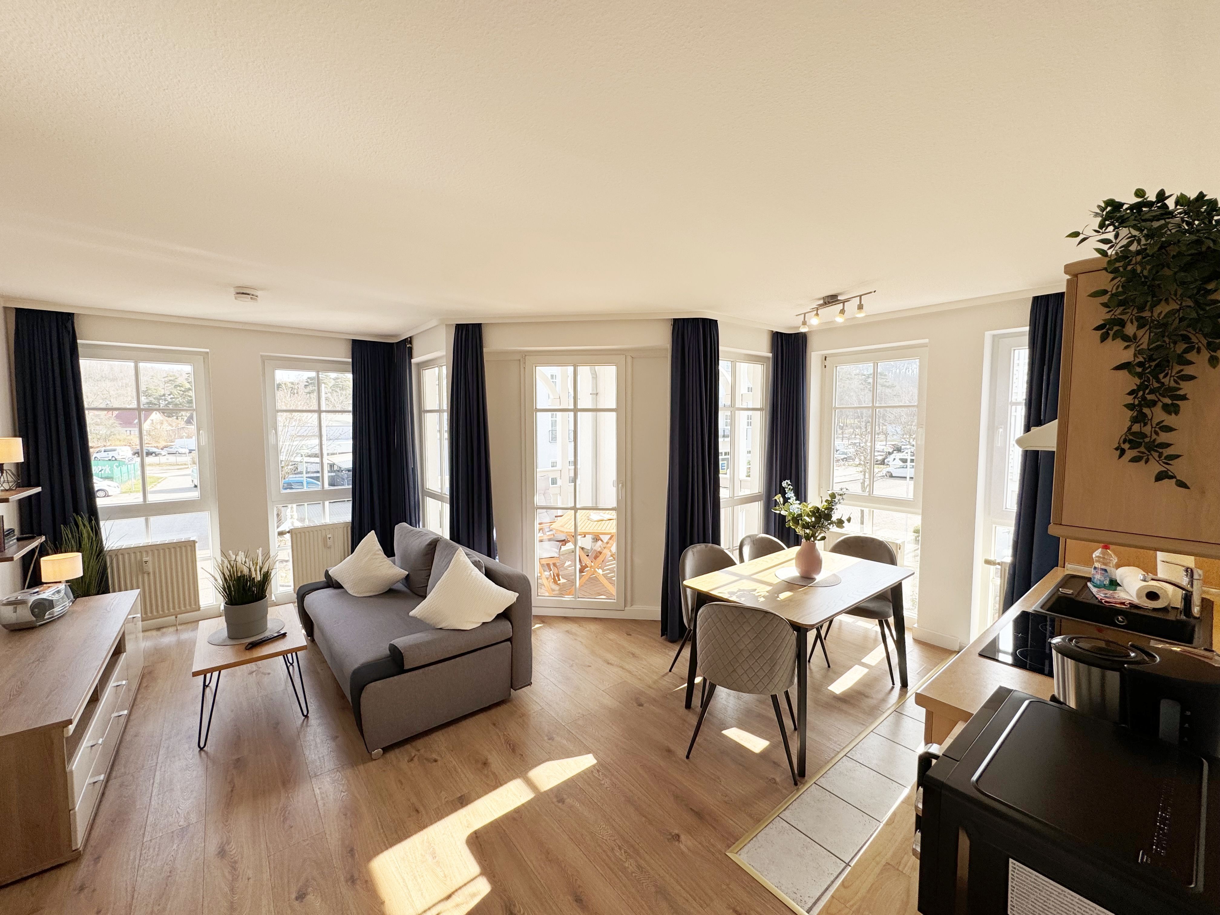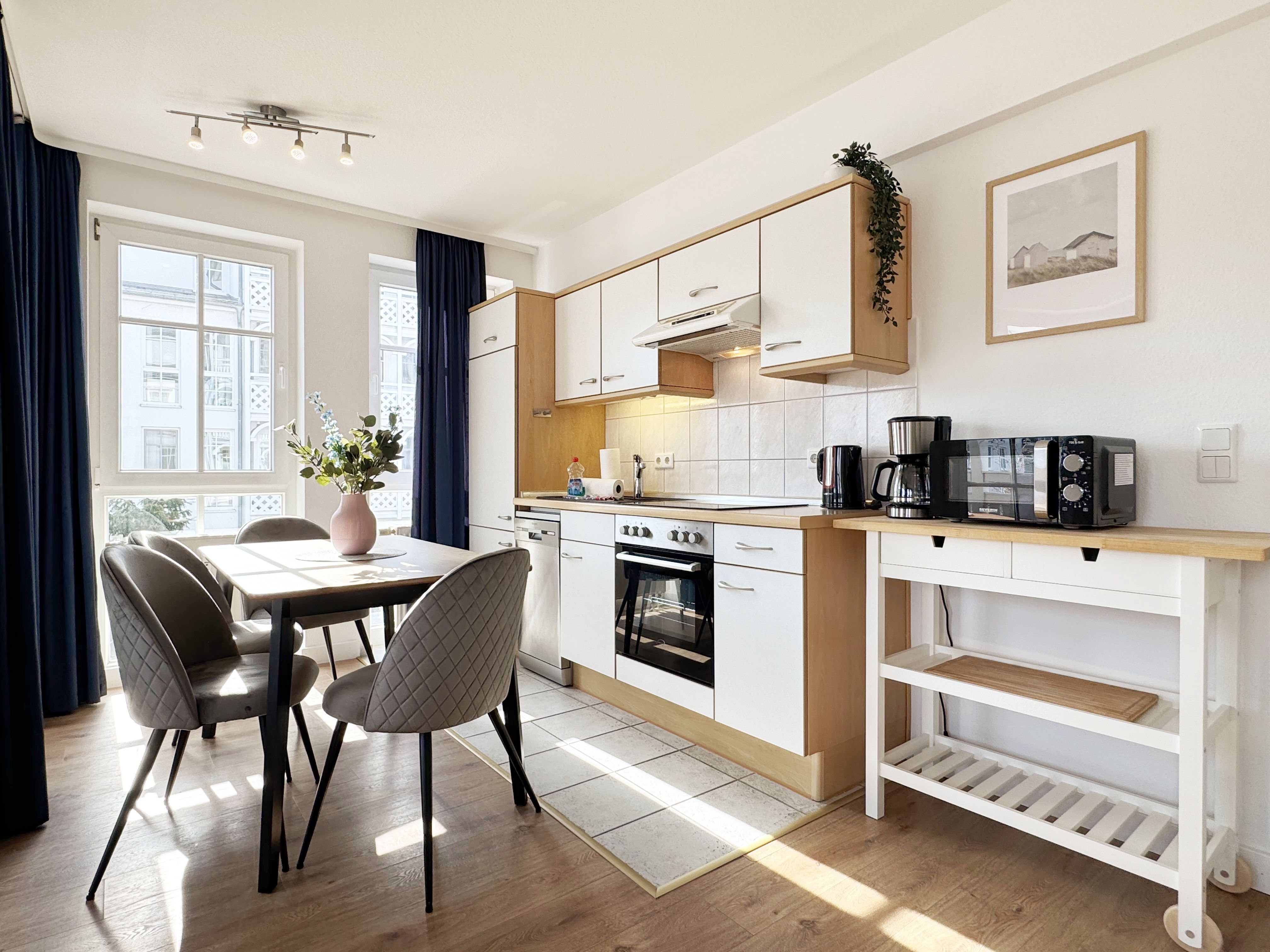 Die lichtdurchflutete Nichtraucherwohnung verfügt über eine hochwertige Ausstattung und bietet auf ca. 50 qm in der 1. Etage des Hauses „Altensien“ eine harmonische Kombination aus klassischem Design und zeitgemäßer Funktionalität. Sie ist für max. 2 bis 4 Personen ausgelegt und eignet sich somit ideal für Paare, kleine Familien oder Freunde, die einen entspannten Urlaub an der Ostsee verbringen möchten. Der Eingangsbereich empfängt Sie mit einer Garderobe welche ausreichend Platz für Ihre Kleidung bietet. Die durchdachte Raumaufteilung sorgt für eine angenehme und freie Atmosphäre. Der große Wohn-/Essbereich mit bodentiefen Fenstern sorgt für eine angenehme Atmosphäre und gewährt einen herrlichen Blick auf die Umgebung. Die gemütliche Couch mit Ausziehfunktion (1,50m x 1,95m) bietet Ihnen die Aufbettungsmöglichkeit für die 3. und 4. Person. Ein Couchtisch sowie eine beleuchtete Vitrine runden den Wohnbereich ab und bietet Platz für persönliche Akzente. Ein elegantes TV-Board mit einem Smart-TV, einem Radio und ein WLAN-Zugang (50 Mbits/5 Mbits) sorgt für eine praktische und optisch ansprechende Aufbewahrung Ihrer Unterhaltungselektronik. Der in Richtung Osten liegende Wohnbereich hat direkten Zugang zum überdachten und bestuhlten Balkon, welcher besonders in den Morgenstunden mit Sonnenwärme zu einem entspannten Frühstück einlädt. Die offene, angrenzende und komplett eingerichtete Küchenzeile lässt keine Wünsche offen. Sie ist ausgestattet mit einem Kühlschrank mit Eisfach, Backofen, Spülmaschine, Cerankochfeld, Dunstabzug, Mikrowelle, Kaffeemaschine, Nespresso-Maschine, Wasserkocher und Toaster. Diverse Küchenutensilien sind vorhanden, sodass Sie Ihre Mahlzeiten bequem zubereiten können. Das Schlafzimmer bietet Ihnen ein komfortables Doppelbett (1,80 m x 2,00 m), verstellbare Lattenroste, Nachttischablagen mit Beleuchtung und einen großzügigen Kleiderschrank. Nach einem Tag am Meer finden Sie hier einen erholsamen Rückzugsort. Das frisch ausgestattete Tageslichtbad ist mit einer bodengleichen Dusche, einem Waschplatz, einem Fön und einem WC ausgestattet. Die Ferienwohnung ist komplett mit pflegeleichten Böden ausgestattet, die für eine angenehme Wohlfühlatmosphäre sorgen. Ein Haustier dürfen Sie gerne gegen eine Gebühr mitbringen. Für Ihren PKW steht Ihnen in der Tiefgarage der Platz Nr. 82 zur Verfügung (Einfahrtshöhe max. 1,80 m). Im Gemeinschaftskeller des Hauses können Sie Ihre geliehenen oder mitgebrachten Fahrräder unterstellen. Die Erstausstattung eines Wäschepaketes (komplette Bettwäsche, 1 Duschhandtuch, 2 kleine Handtücher) können Sie bis 14 Tage vor Anreise gegen einen Aufpreis dazu buchen oder durch eigenes Ergänzen. Ab 2 gebuchten Paketen erhalten Sie einmalig 1 Geschirrhandtuch und 1 Duschvorleger hinzu. Wir freuen uns darauf, Sie als Gast in unserer Wohnung willkommen zu heißen.