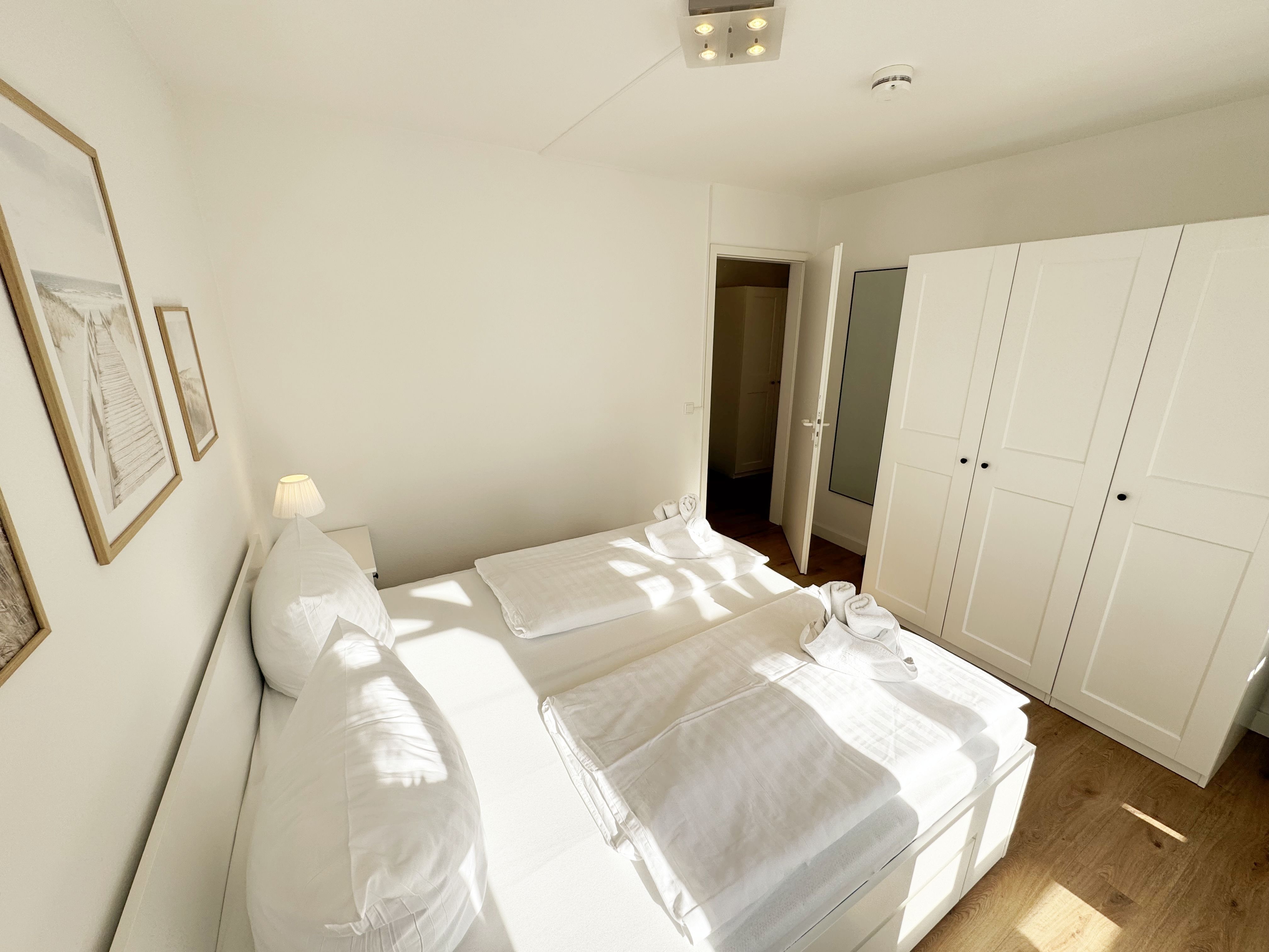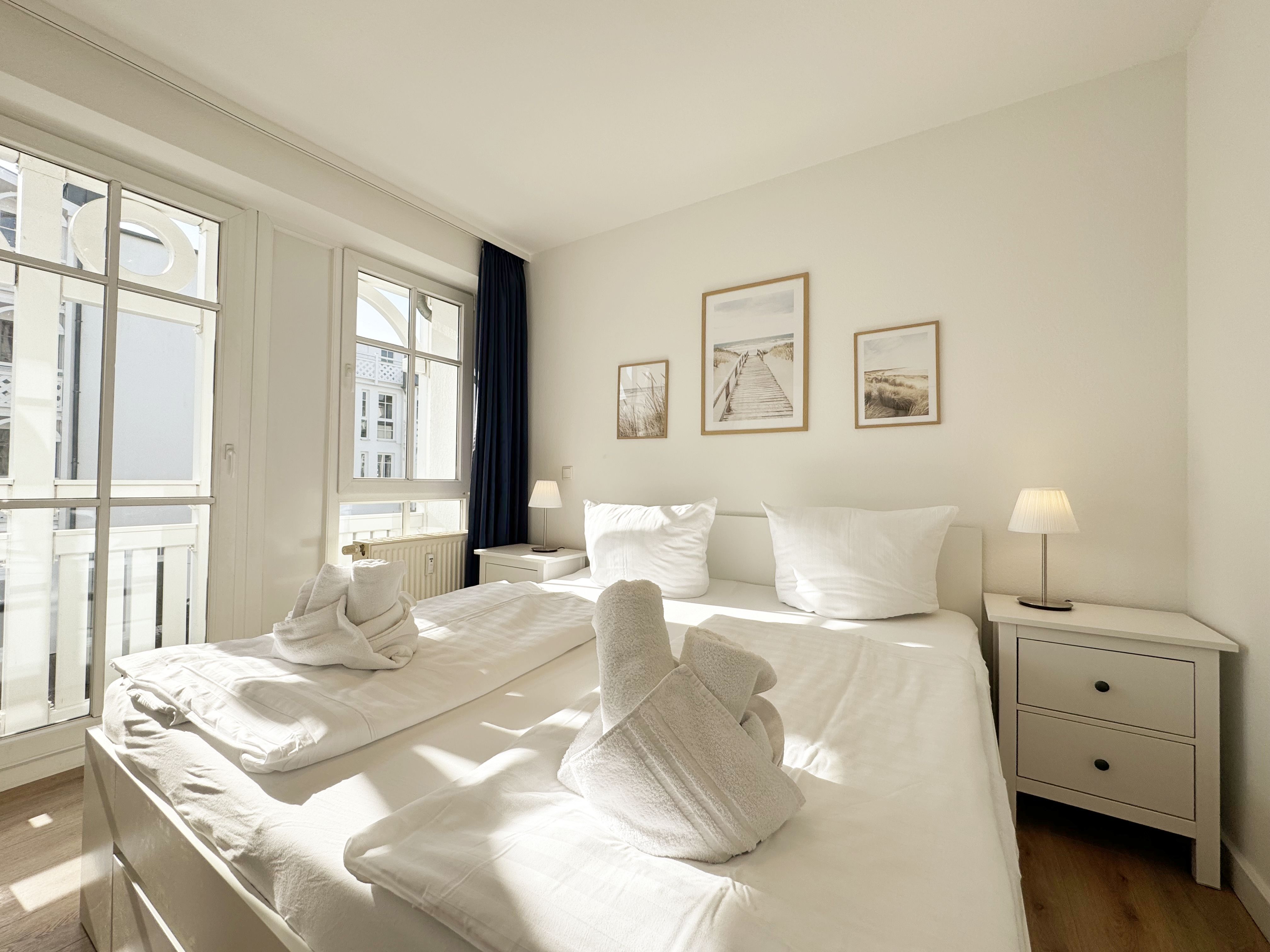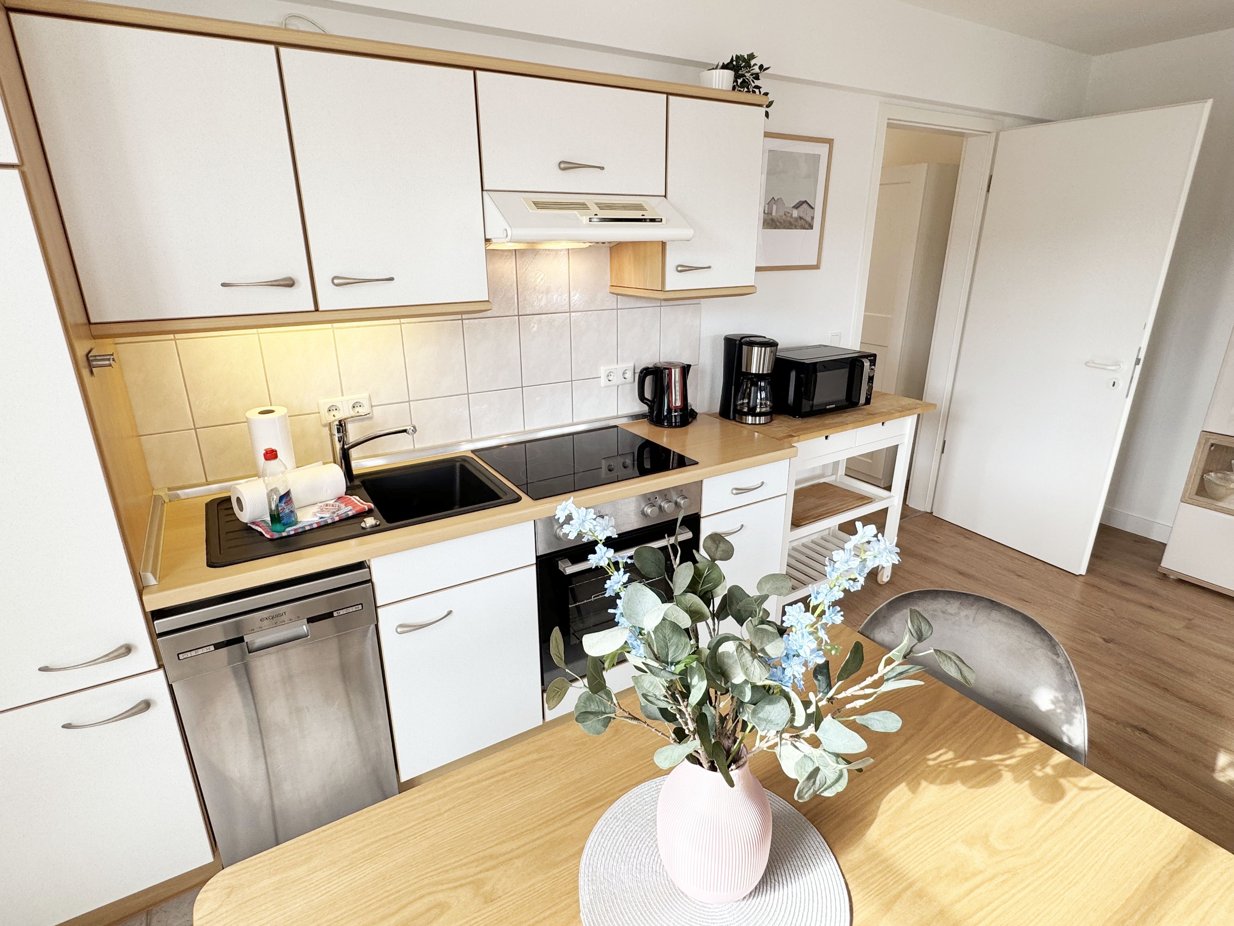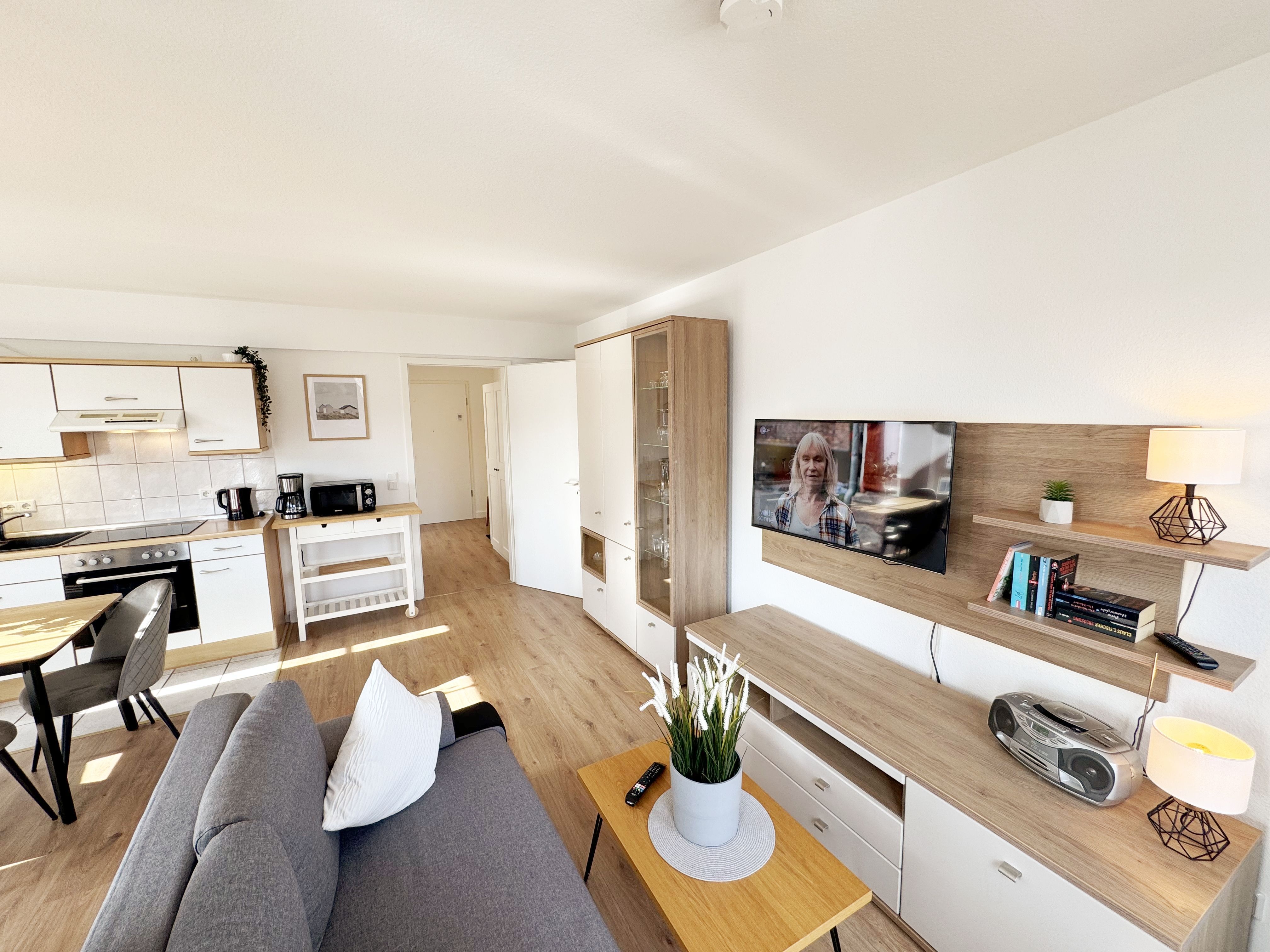 Die lichtdurchflutete Nichtraucherwohnung verfügt über eine hochwertige Ausstattung und bietet auf ca. 50 qm in der 1. Etage des Hauses „Altensien“ eine harmonische Kombination aus klassischem Design und zeitgemäßer Funktionalität. Sie ist für max. 2 bis 4 Personen ausgelegt und eignet sich somit ideal für Paare, kleine Familien oder Freunde, die einen entspannten Urlaub an der Ostsee verbringen möchten. Der Eingangsbereich empfängt Sie mit einer Garderobe welche ausreichend Platz für Ihre Kleidung bietet. Die durchdachte Raumaufteilung sorgt für eine angenehme und freie Atmosphäre. Der große Wohn-/Essbereich mit bodentiefen Fenstern sorgt für eine angenehme Atmosphäre und gewährt einen herrlichen Blick auf die Umgebung. Die gemütliche Couch mit Ausziehfunktion (1,50m x 1,95m) bietet Ihnen die Aufbettungsmöglichkeit für die 3. und 4. Person. Ein Couchtisch sowie eine beleuchtete Vitrine runden den Wohnbereich ab und bietet Platz für persönliche Akzente. Ein elegantes TV-Board mit einem Smart-TV, einem Radio und ein WLAN-Zugang (50 Mbits/5 Mbits) sorgt für eine praktische und optisch ansprechende Aufbewahrung Ihrer Unterhaltungselektronik. Der in Richtung Osten liegende Wohnbereich hat direkten Zugang zum überdachten und bestuhlten Balkon, welcher besonders in den Morgenstunden mit Sonnenwärme zu einem entspannten Frühstück einlädt. Die offene, angrenzende und komplett eingerichtete Küchenzeile lässt keine Wünsche offen. Sie ist ausgestattet mit einem Kühlschrank mit Eisfach, Backofen, Spülmaschine, Cerankochfeld, Dunstabzug, Mikrowelle, Kaffeemaschine, Nespresso-Maschine, Wasserkocher und Toaster. Diverse Küchenutensilien sind vorhanden, sodass Sie Ihre Mahlzeiten bequem zubereiten können. Das Schlafzimmer bietet Ihnen ein komfortables Doppelbett (1,80 m x 2,00 m), verstellbare Lattenroste, Nachttischablagen mit Beleuchtung und einen großzügigen Kleiderschrank. Nach einem Tag am Meer finden Sie hier einen erholsamen Rückzugsort. Das frisch ausgestattete Tageslichtbad ist mit einer bodengleichen Dusche, einem Waschplatz, einem Fön und einem WC ausgestattet. Die Ferienwohnung ist komplett mit pflegeleichten Böden ausgestattet, die für eine angenehme Wohlfühlatmosphäre sorgen. Ein Haustier dürfen Sie gerne gegen eine Gebühr mitbringen. Für Ihren PKW steht Ihnen in der Tiefgarage der Platz Nr. 82 zur Verfügung (Einfahrtshöhe max. 1,80 m). Im Gemeinschaftskeller des Hauses können Sie Ihre geliehenen oder mitgebrachten Fahrräder unterstellen. Die Erstausstattung eines Wäschepaketes (komplette Bettwäsche, 1 Duschhandtuch, 2 kleine Handtücher) können Sie bis 14 Tage vor Anreise gegen einen Aufpreis dazu buchen oder durch eigenes Ergänzen. Ab 2 gebuchten Paketen erhalten Sie einmalig 1 Geschirrhandtuch und 1 Duschvorleger hinzu. Wir freuen uns darauf, Sie als Gast in unserer Wohnung willkommen zu heißen.