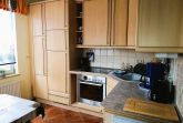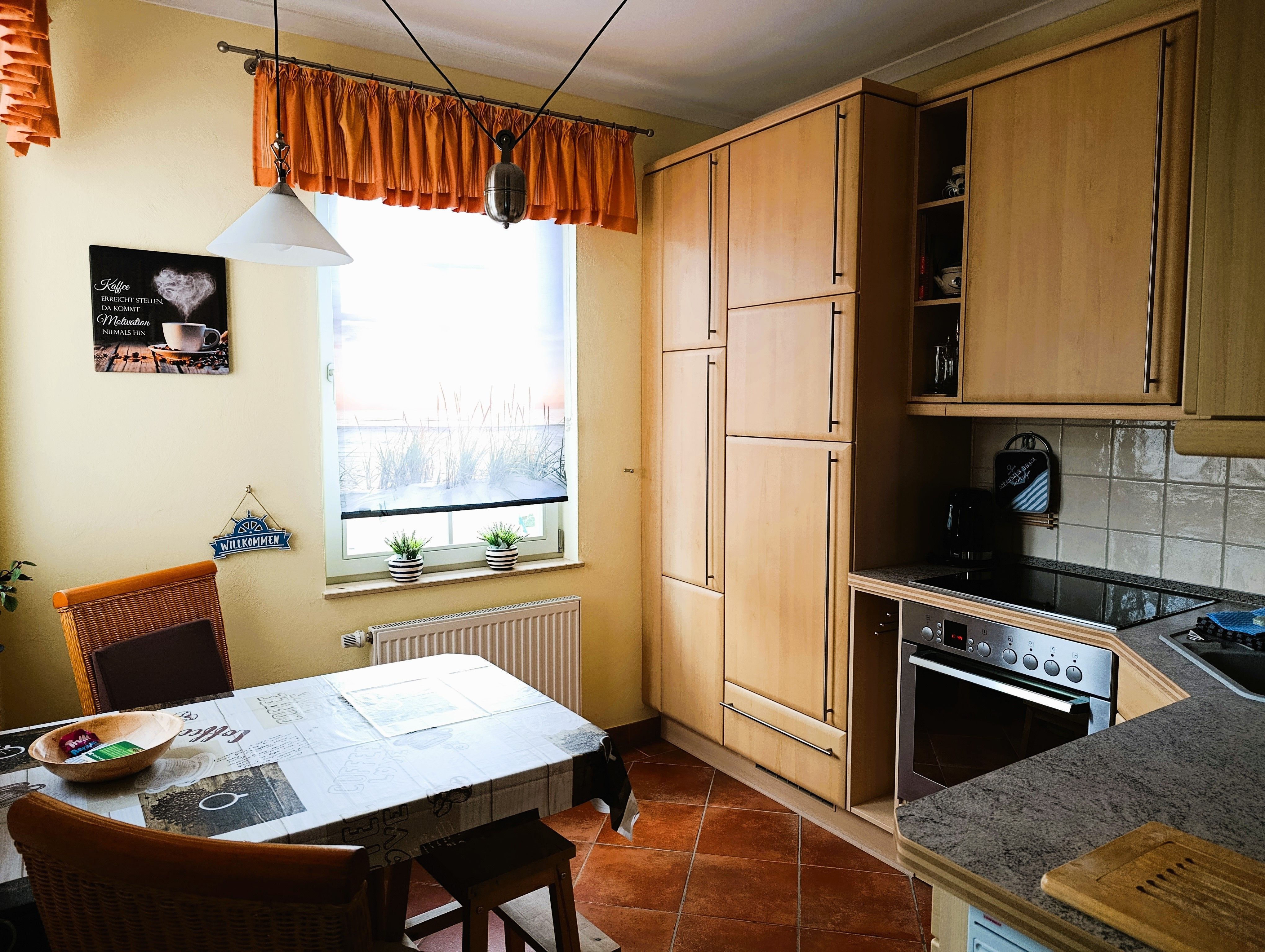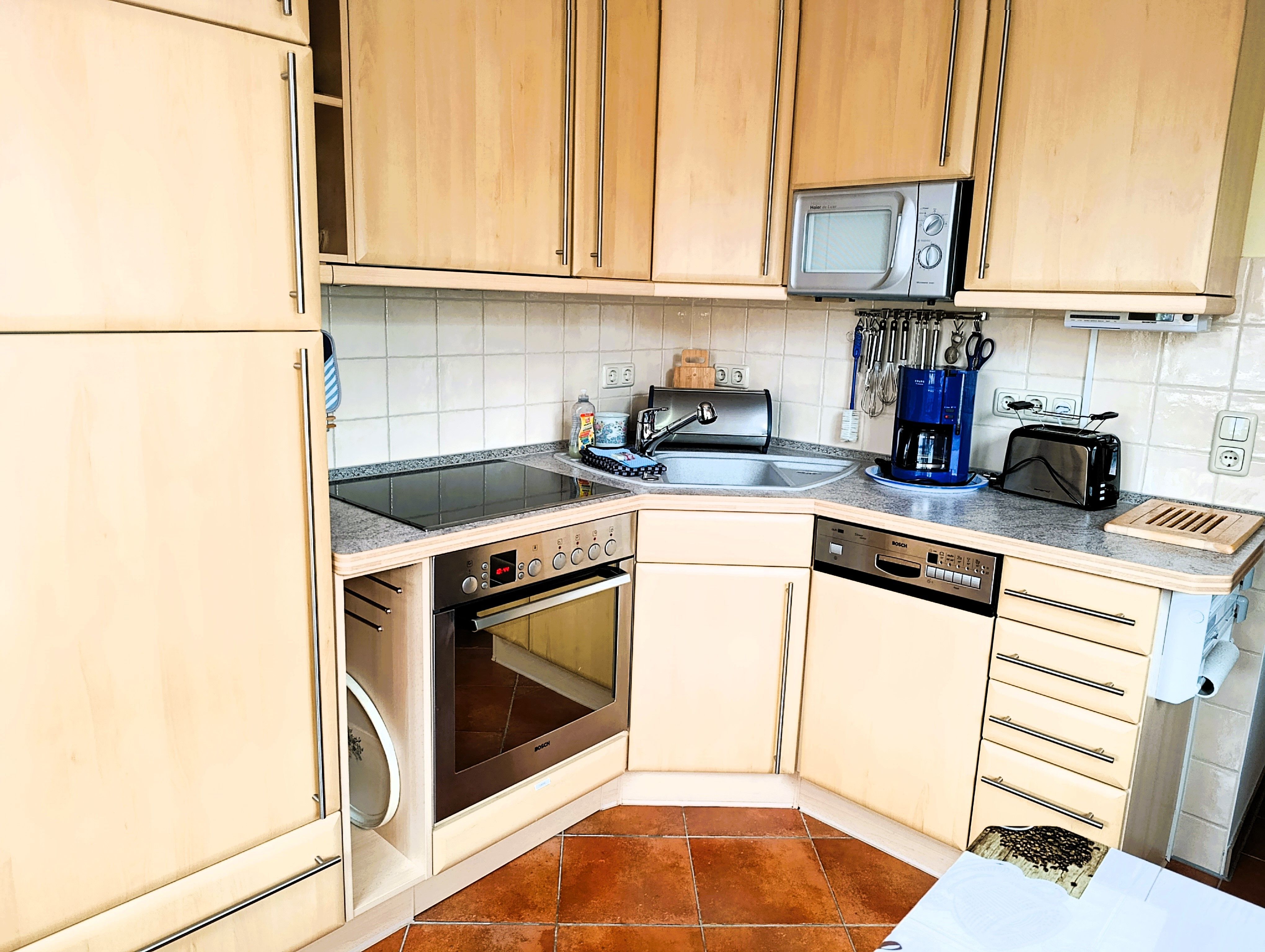 Küche komplett mit Ceranfeld, Kühlschrank, Gefrierfach, Mikrowelle und Geschirrspüler.