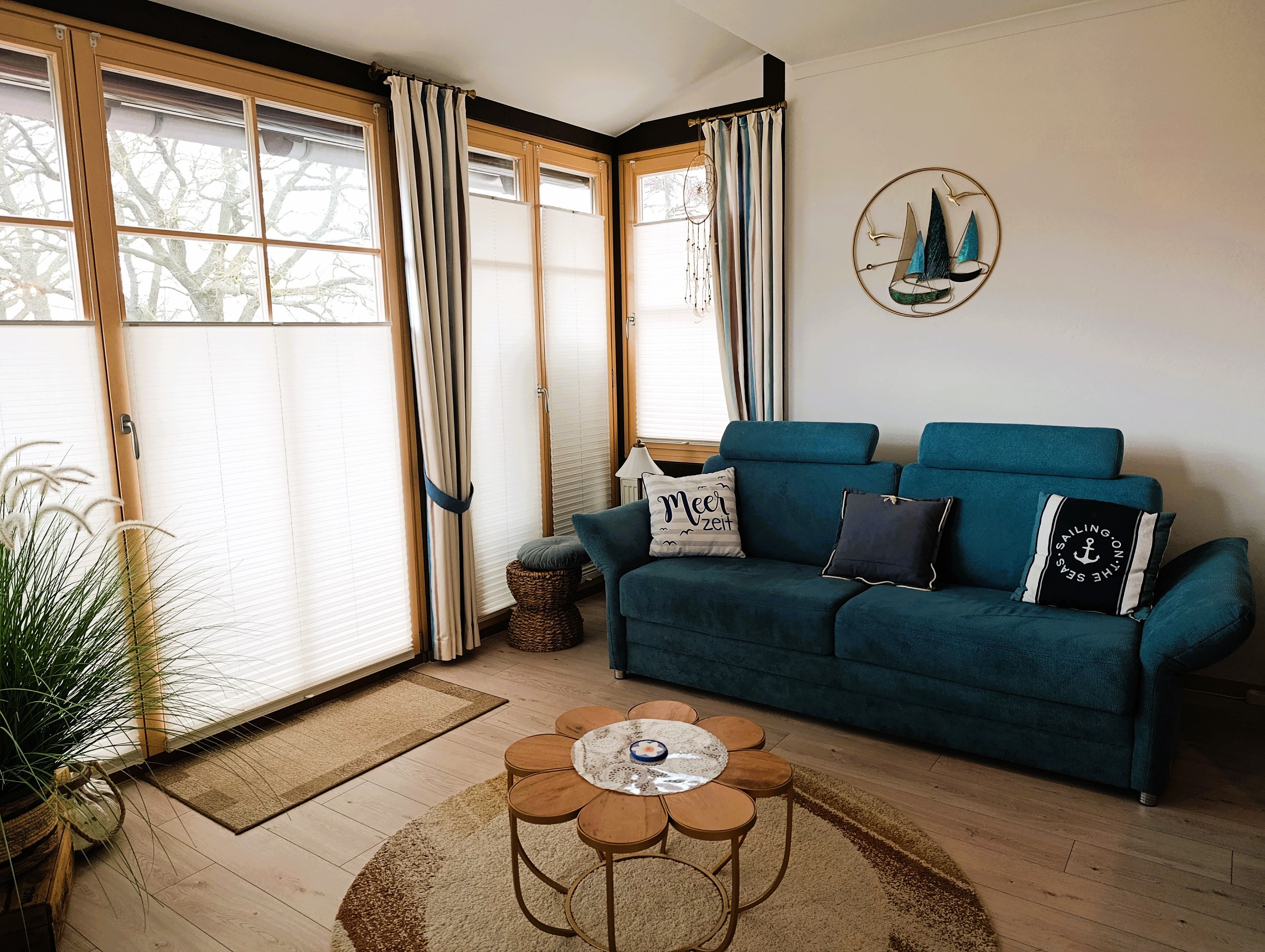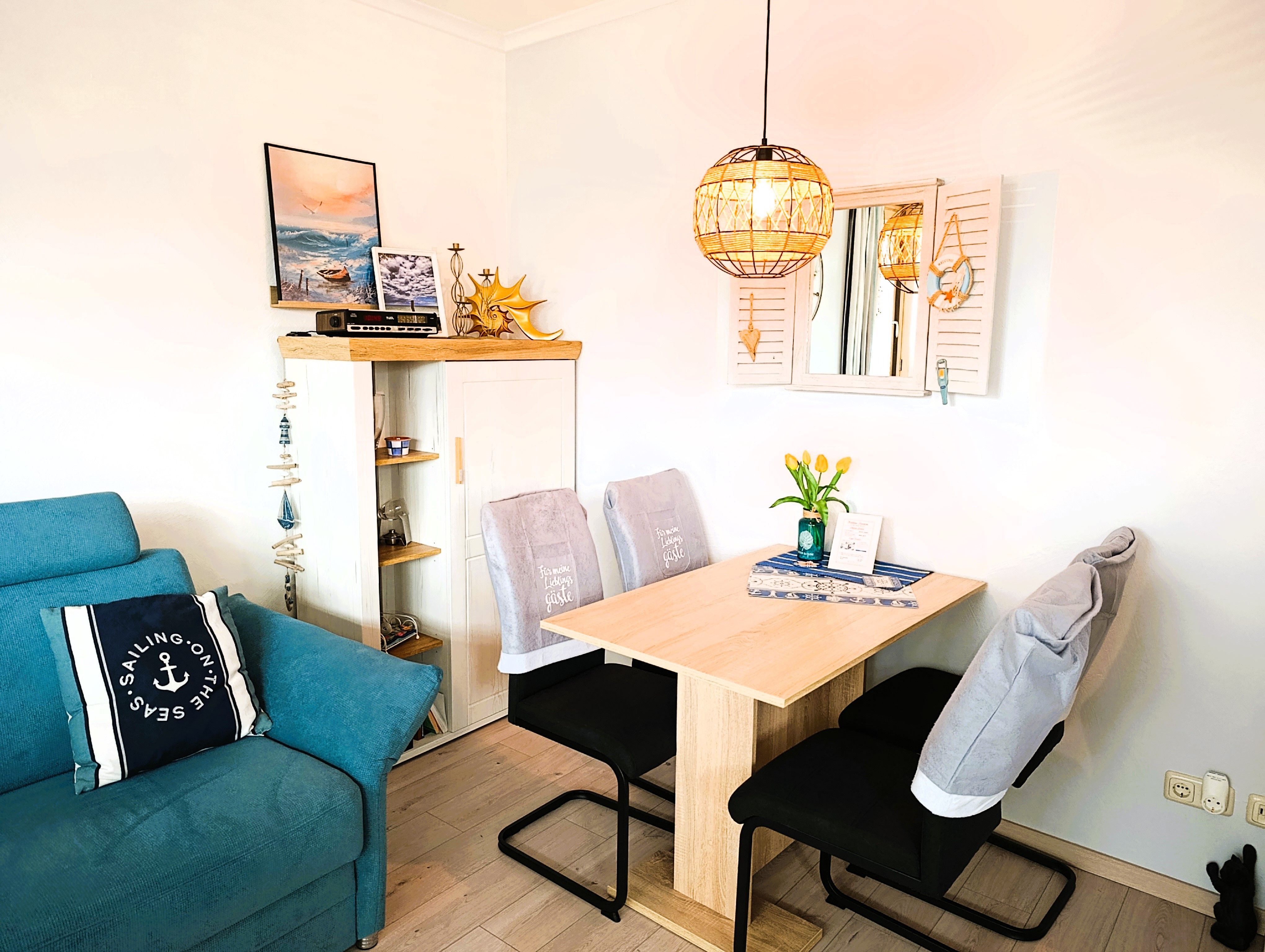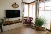 Gemütliches Wohnzimmer mit Deckenventilator, Essplatz für 2-4 Personen. 20 qm großer Balkon mit Strandkorb, Balkonmöbel und tollen Ausblick.