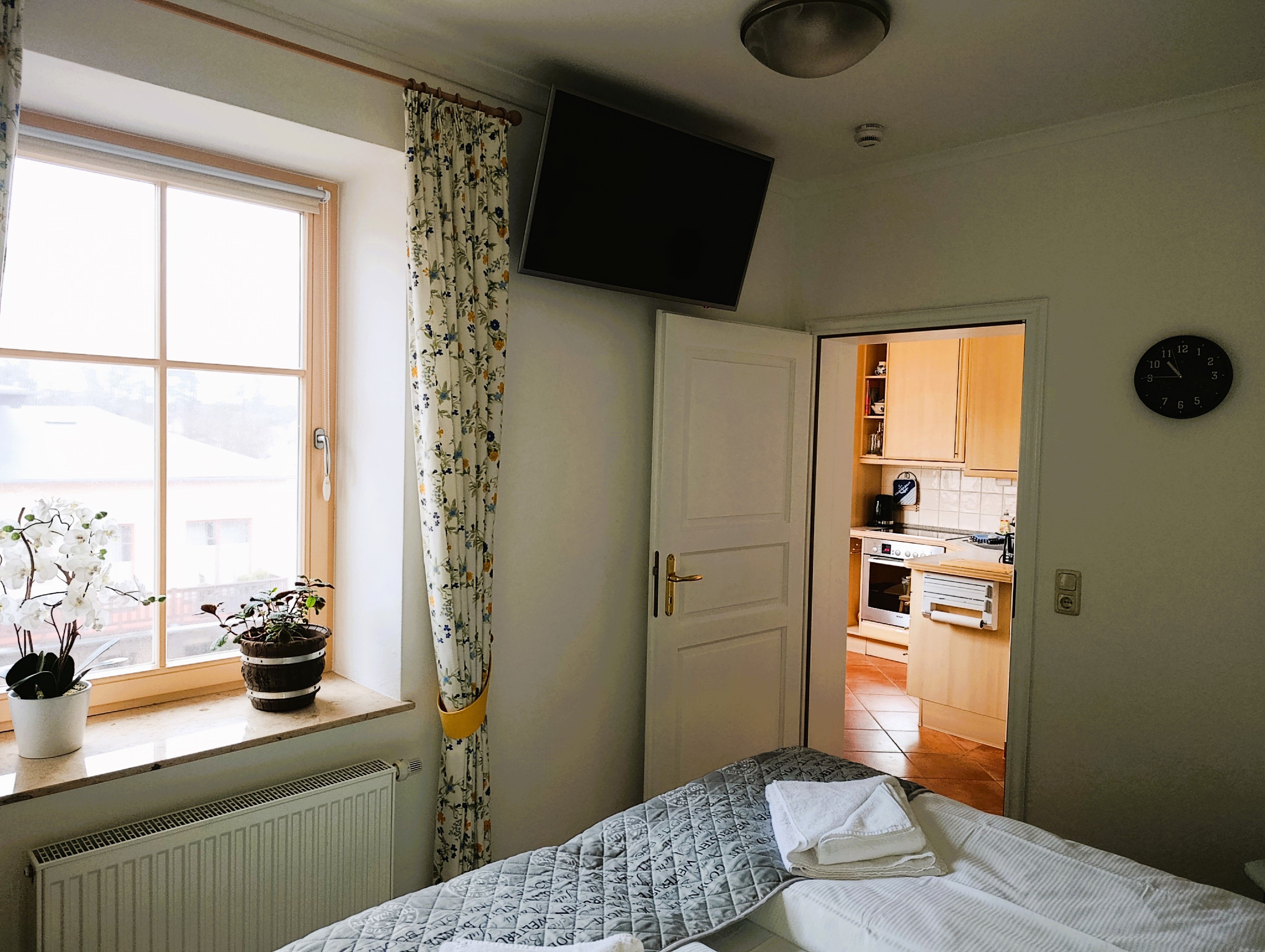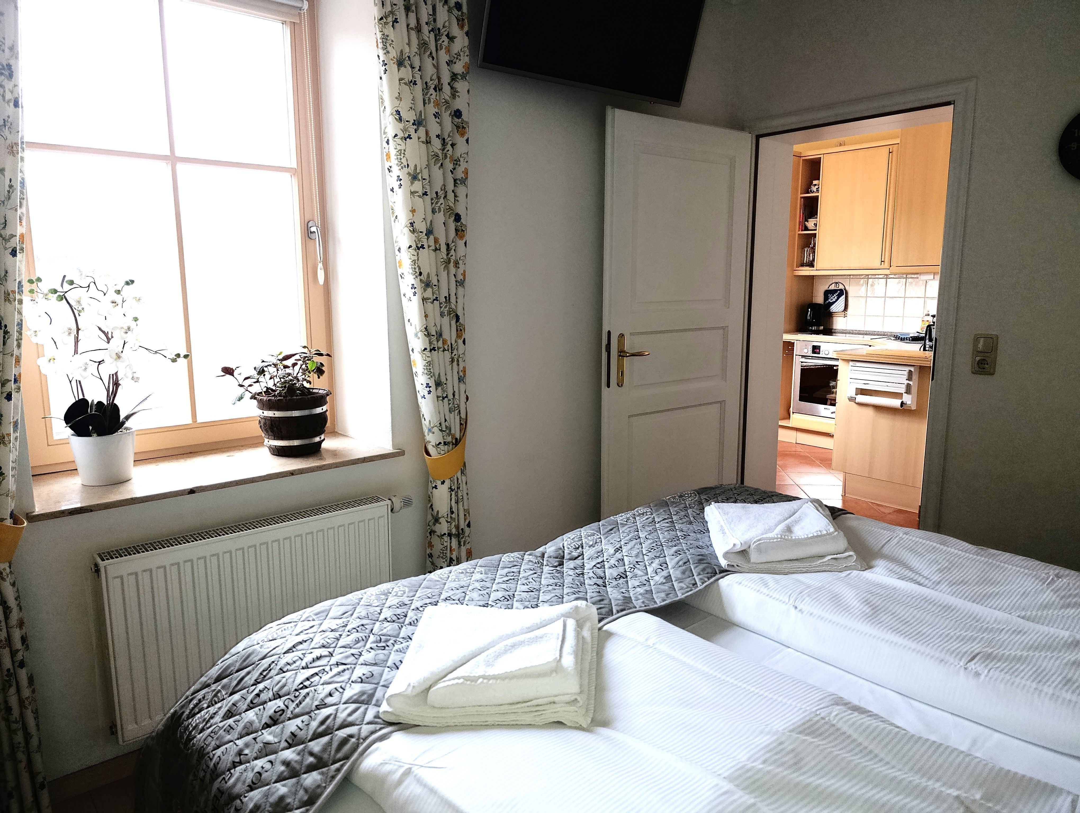 Schlafzimmer mit Fenster, Doppelbett, Kleiderschrank und Tv.