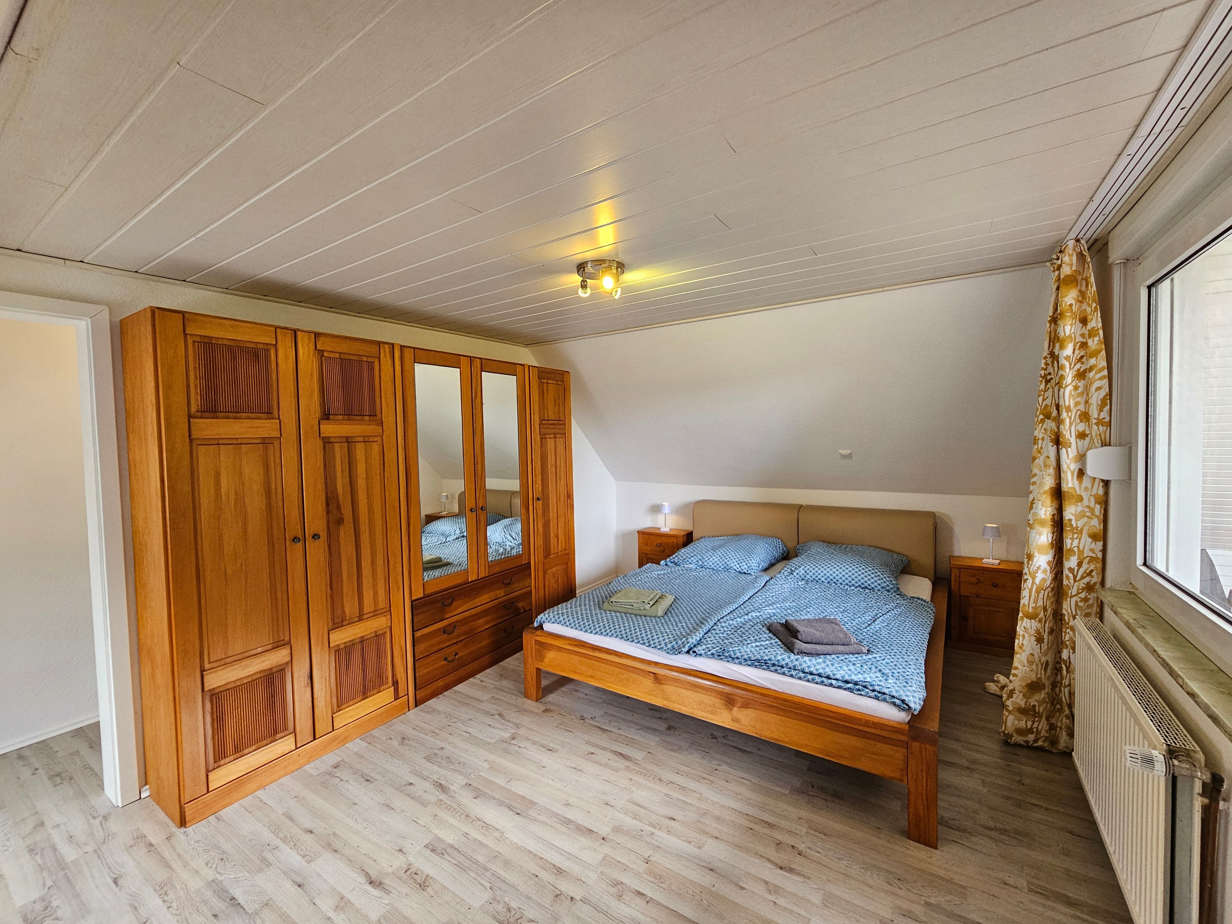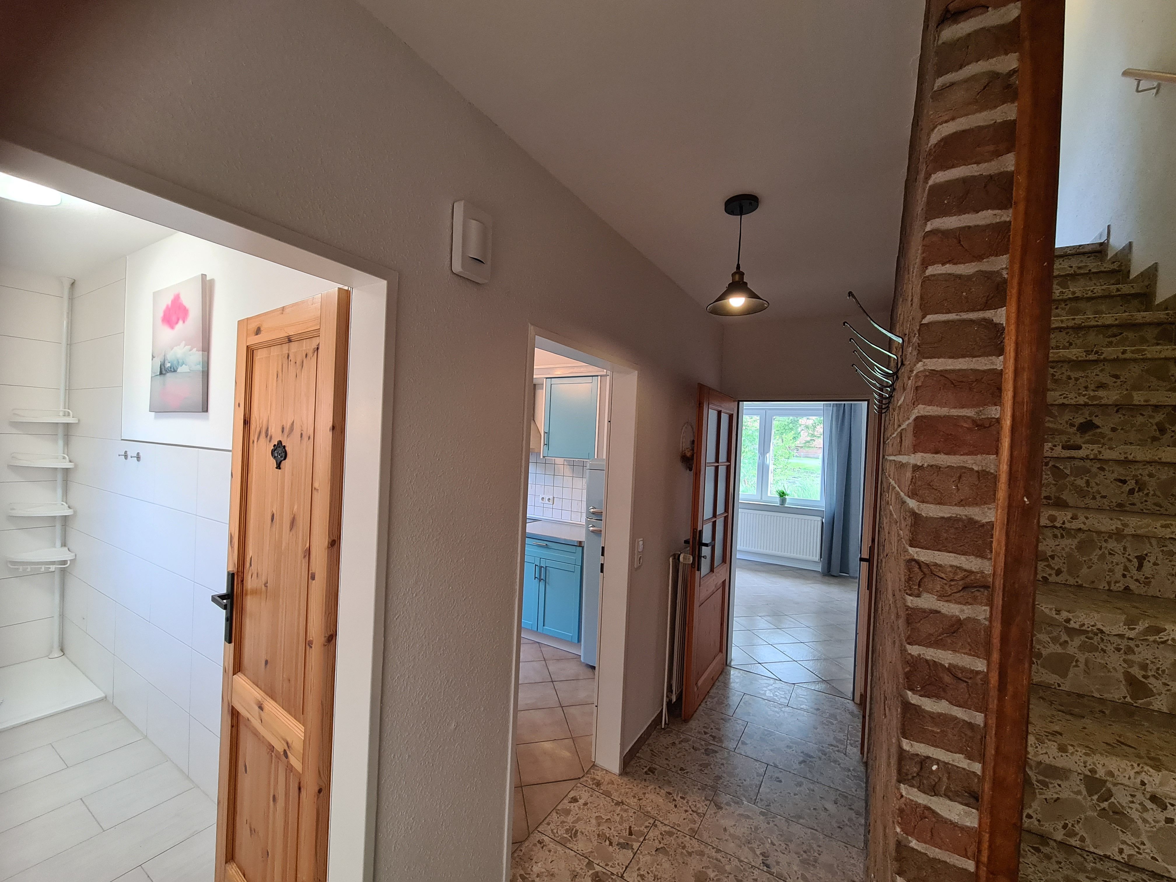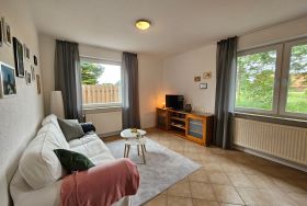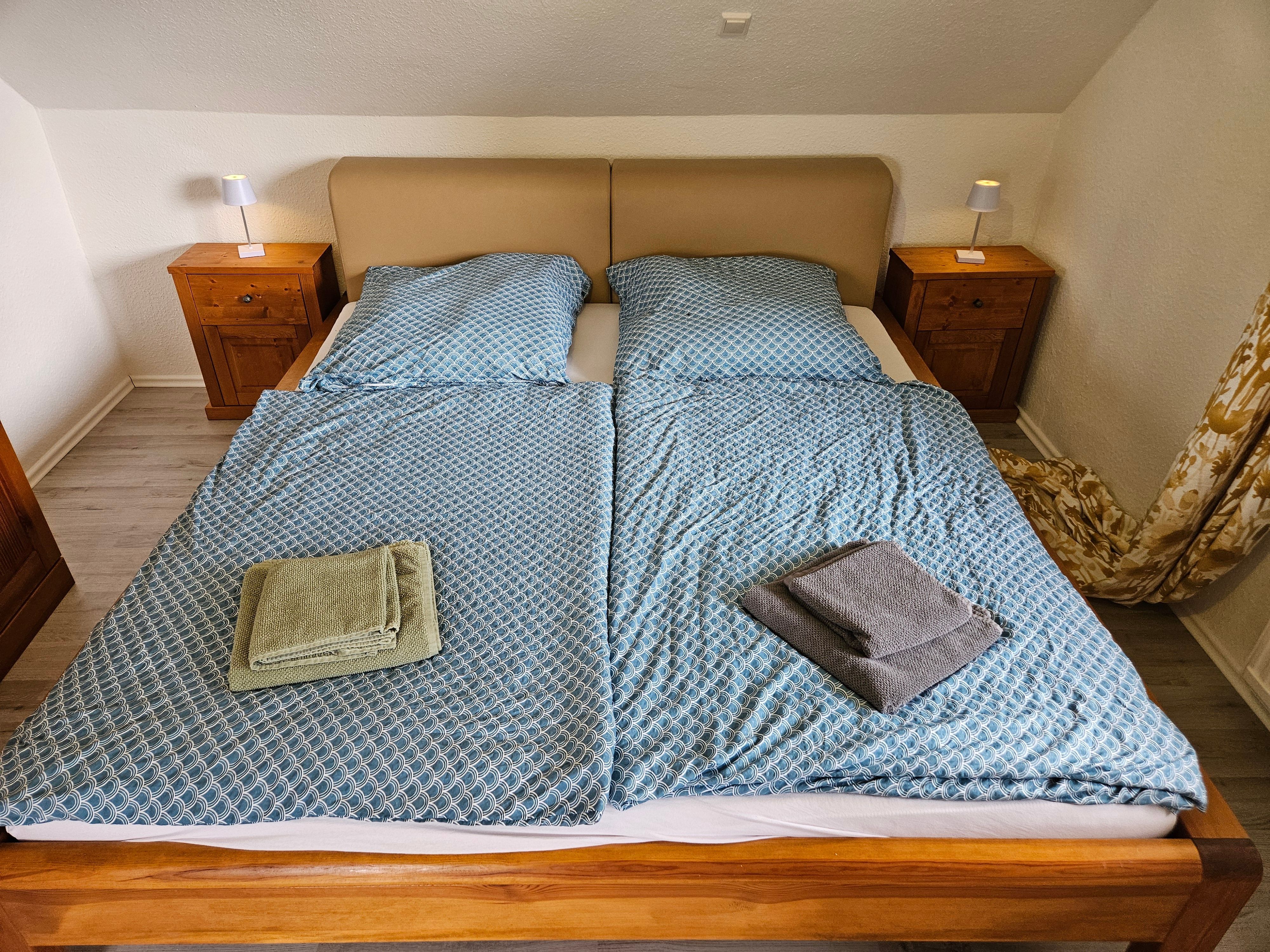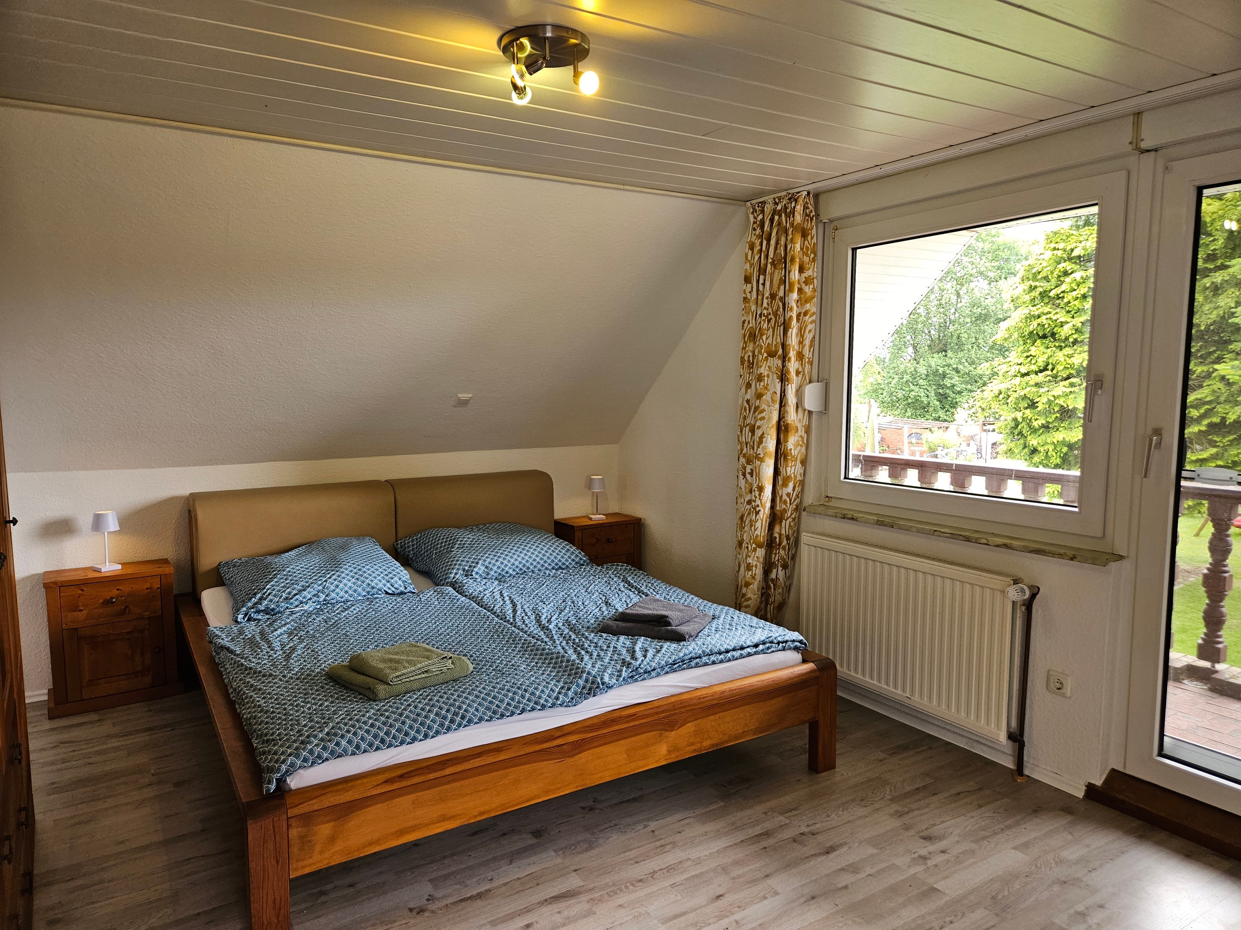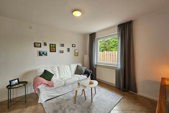 Schöne, Doppelhaus-Ferienwohnung auf zwei Etagen mit separaten Eingang und Stellplatz. Die 57qm Ferienwohnung bietet für zwei Personen genügend Platz für einen entspannten Urlaub. Im Erdgeschoss erwartet Sie eine vollausgestattete Küche mit Geschirrspühler, ein Badezimmer mit Dusche und WC sowie ein Wohnzimmer mit einer gemütlichen Couch und TV sowie eine kleine Essecke. Im Obergeschoss befindet sich das offene Schlafzimmer mit einem Doppelbett (1,80x2,00m) mit angrenzendem Balkon. Bettwäsche, Handtücher sowie WLAN sind inklusive. In der Wohnung sind Haustiere herzlich willkommen (Aufpreis).