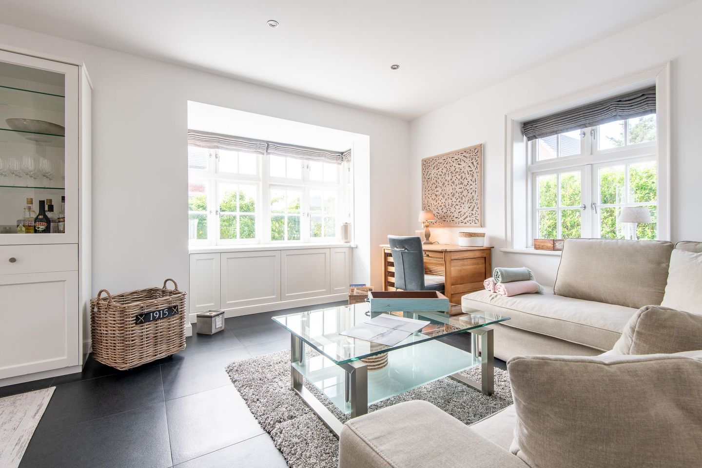 Der großzügige Wohnbereich des Hauses lädt mit seinem gemütlichen Kamin zu entspannten Abenden ein. Große Fenster lassen viel Licht in den Raum und bieten direkten Zugang zum Garten mit möblierter Terrasse. Hier können Sie die frische Nordseeluft genießen, sich entspannen und die Ruhe der Umgebung auf sich wirken lassen – perfekt für ein Frühstück im Freien oder einen Grillabend.
