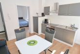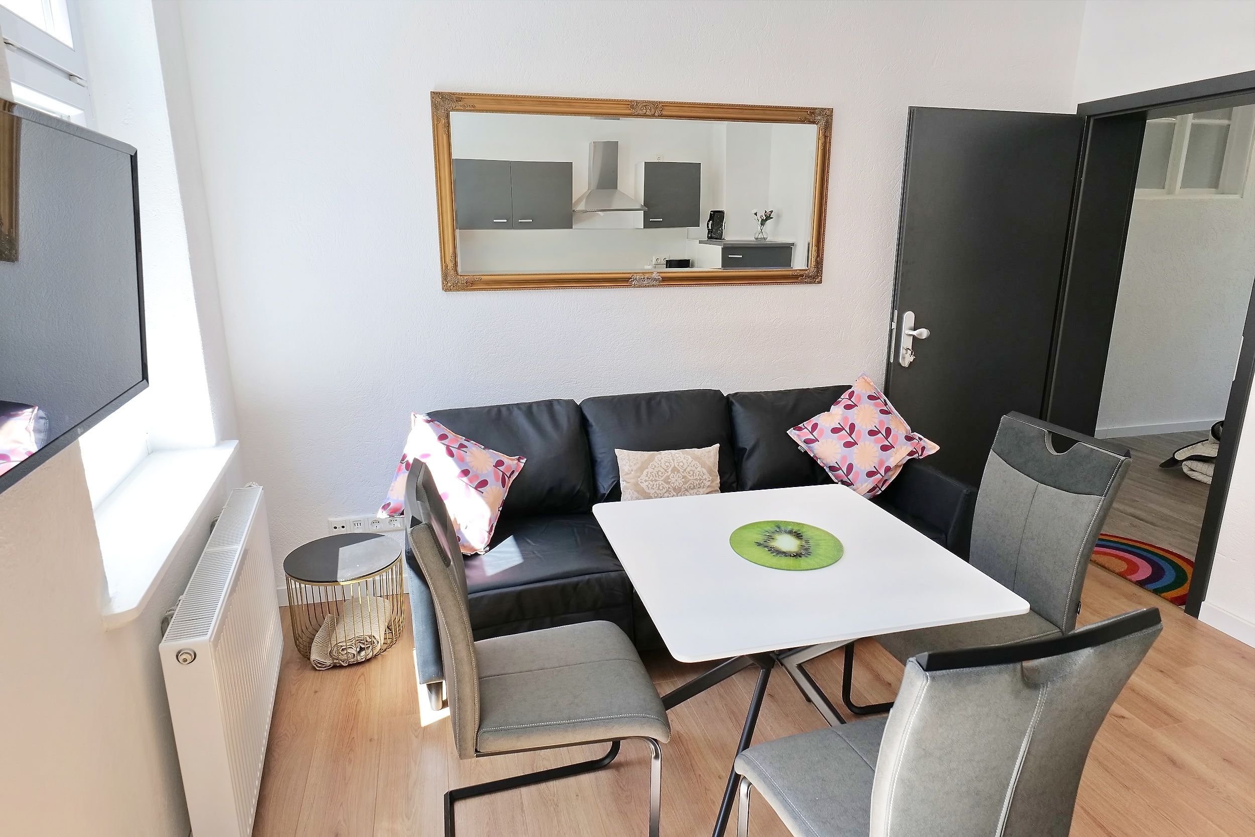 - 1 Wohnzimmer mit offener Küche, Couch, Flat-TV (Fernsehen über Intenet)