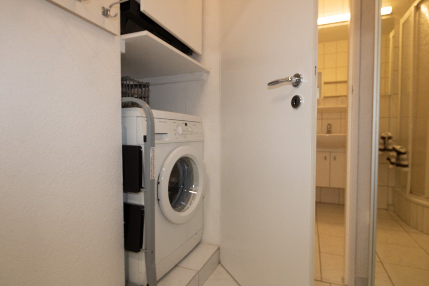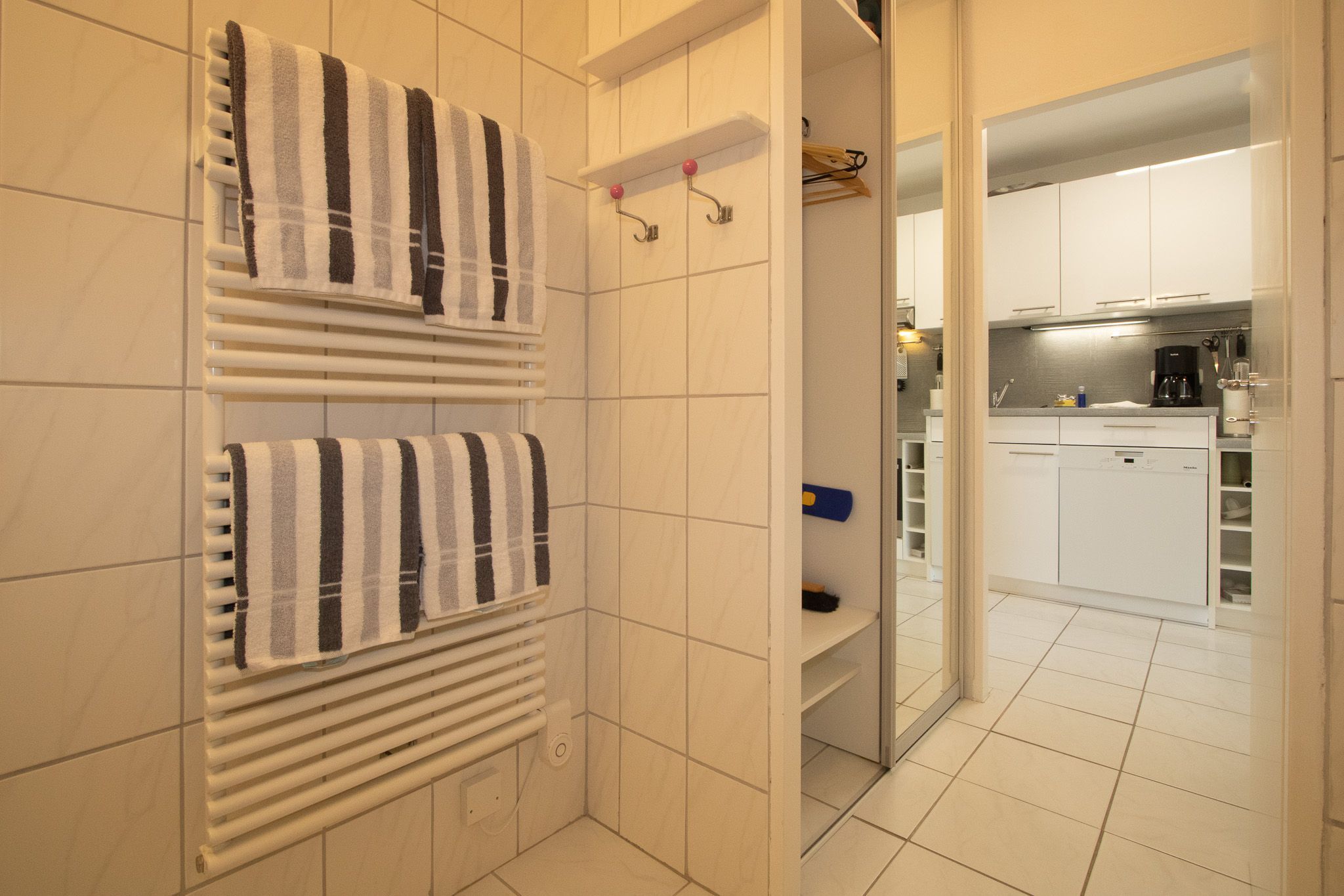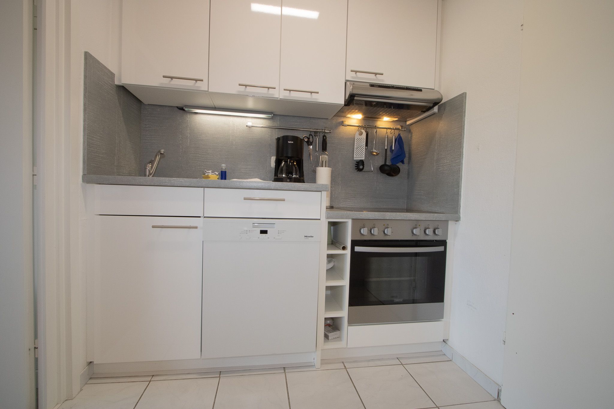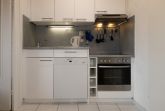 Die Küchenzeile ist komplett ausgestattet und enthält neben Cerankochfeld und Backofen auch einen Geschirrspüler. Im angrenzenden Flur befindet sich auch eine Waschmaschine.