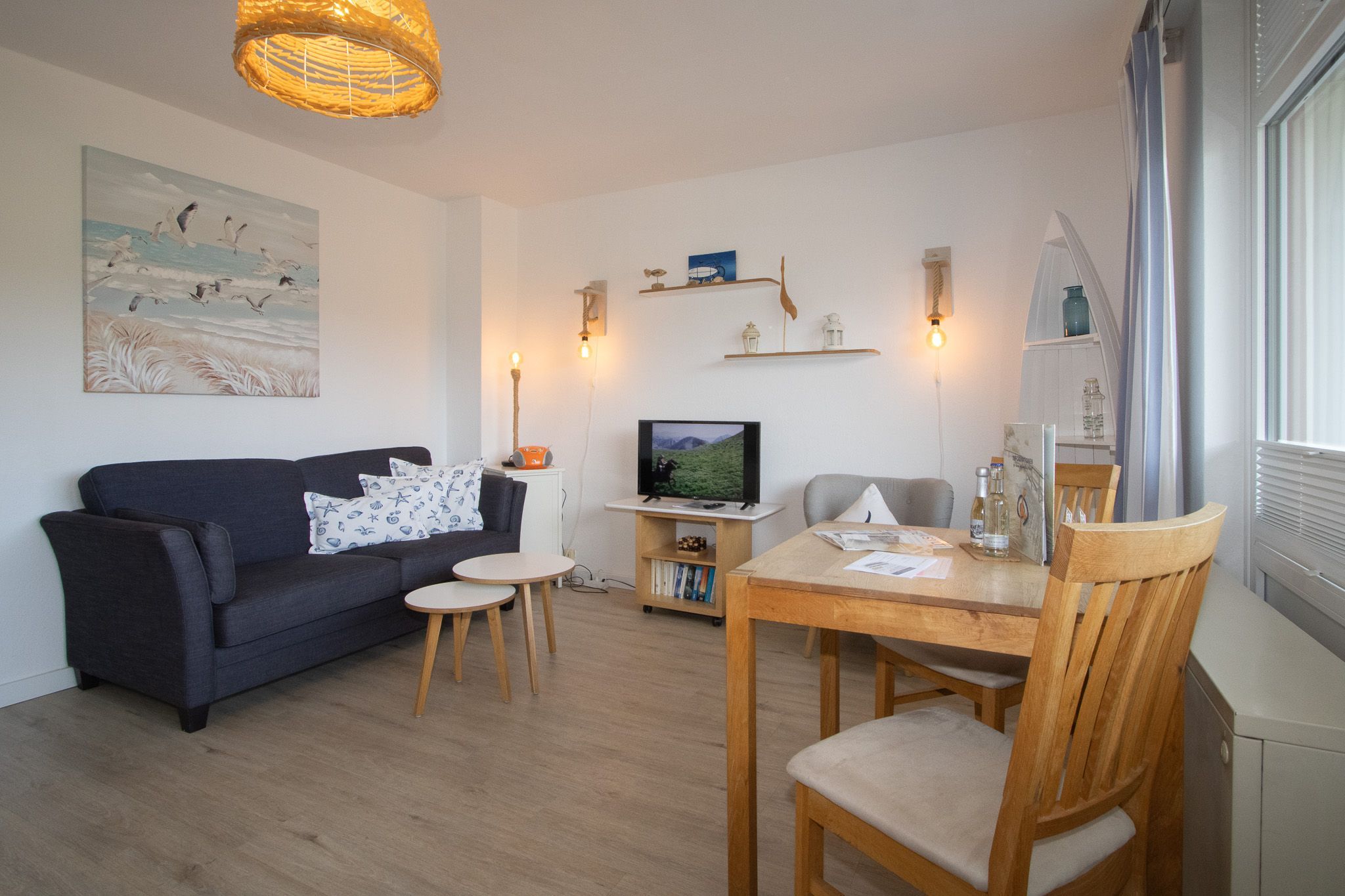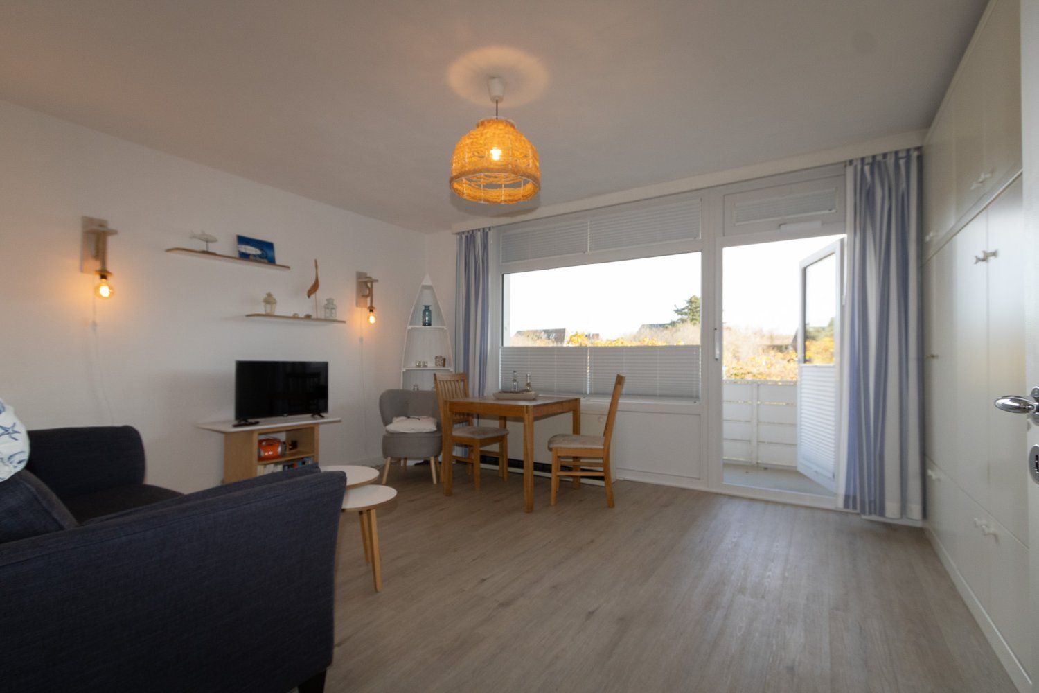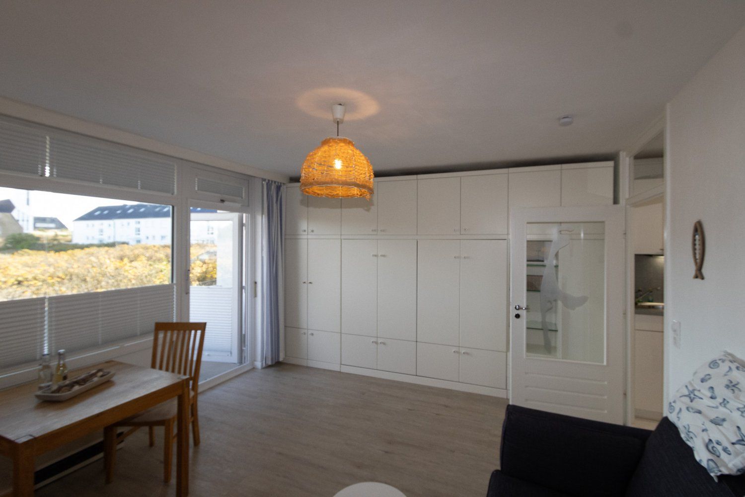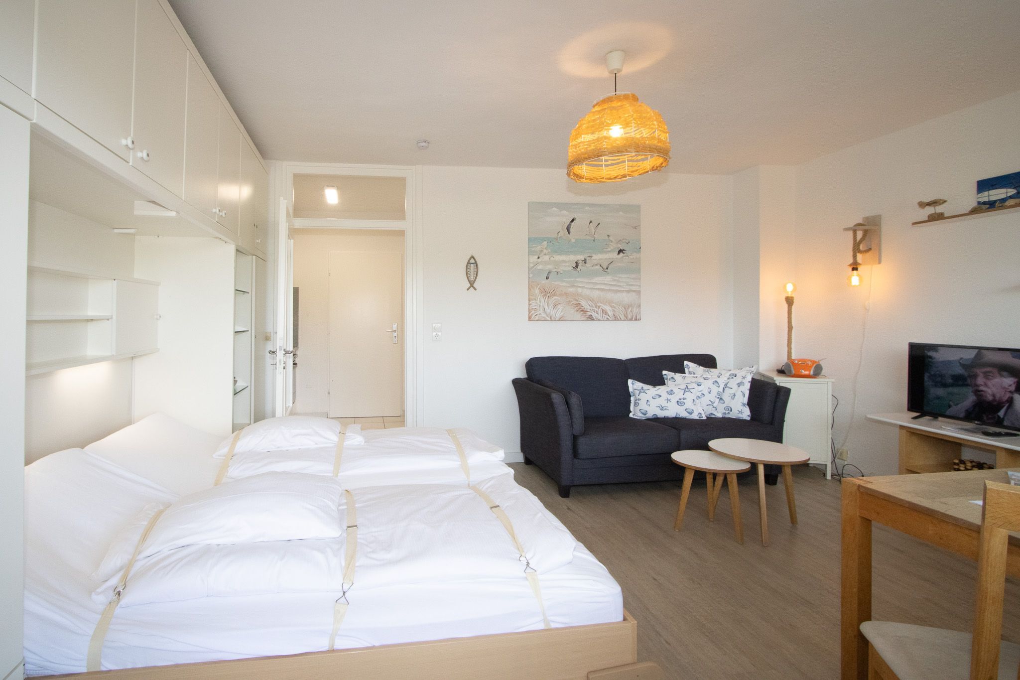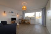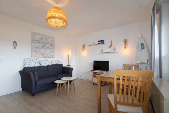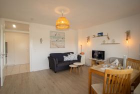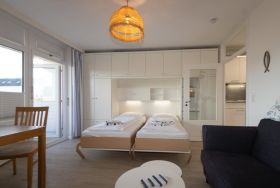 Bei der Einrichtung der Wohnung wurde auf Komfort und Wohnqualität sehr viel Wert gelegt. Das komfortable Schrankbett kann tagsüber ganz schnell verschwinden und der Wohnraum mit Esstisch wirkt wunderbar groß. Mit großem Flachbildschirm und WLAN, lässt diese Wohnung keine Urlaubswünsche offen.