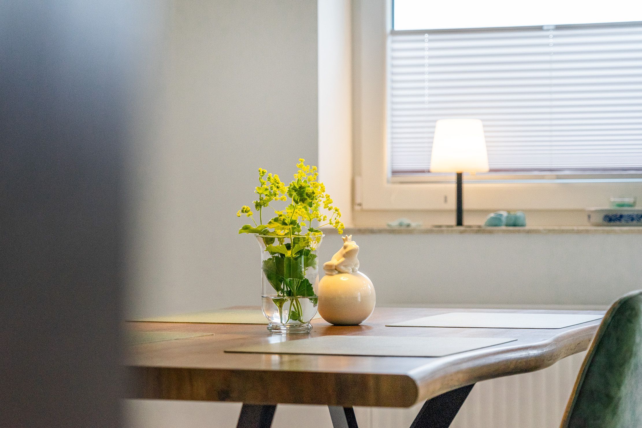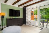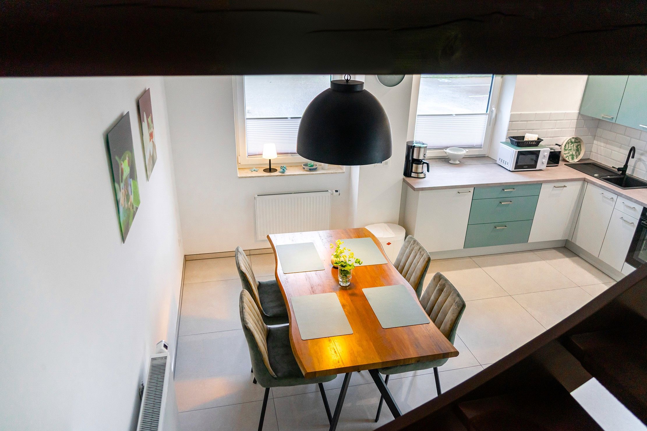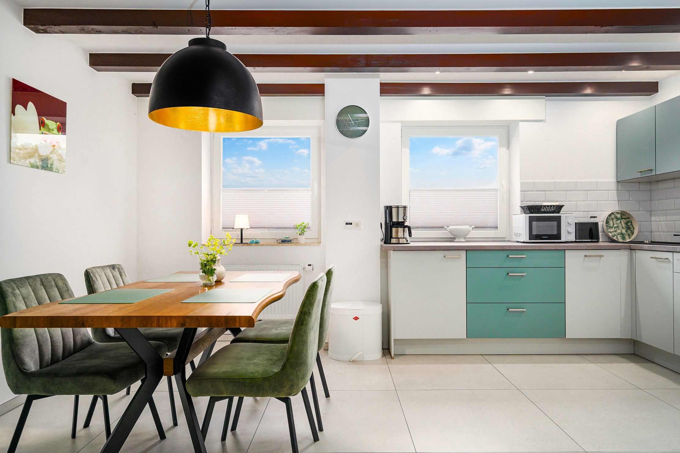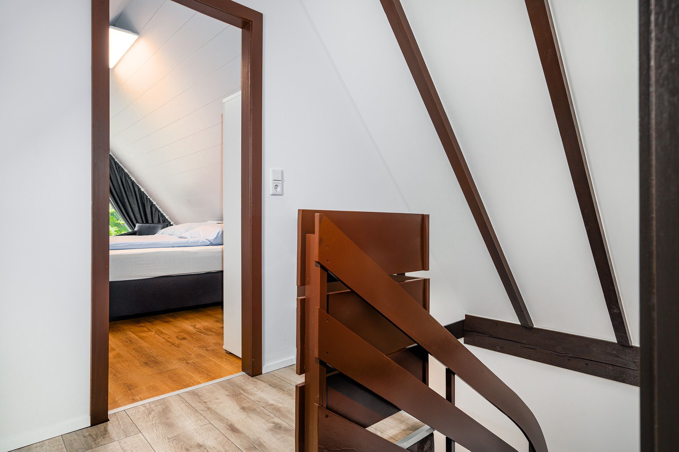 Das Ferienhaus „Kleine Hütte“ ist modern und gemütlich eingerichtet und gestaltet sowie sehr gut ausgestattet. Es gibt zum Beispiel eine Küche mit Geschirrspülmaschine und eine große Terrasse am Wohnzimmer mit direktem Gartenzugang und ein großzügiges Badezimmer.