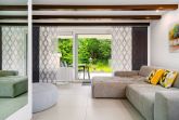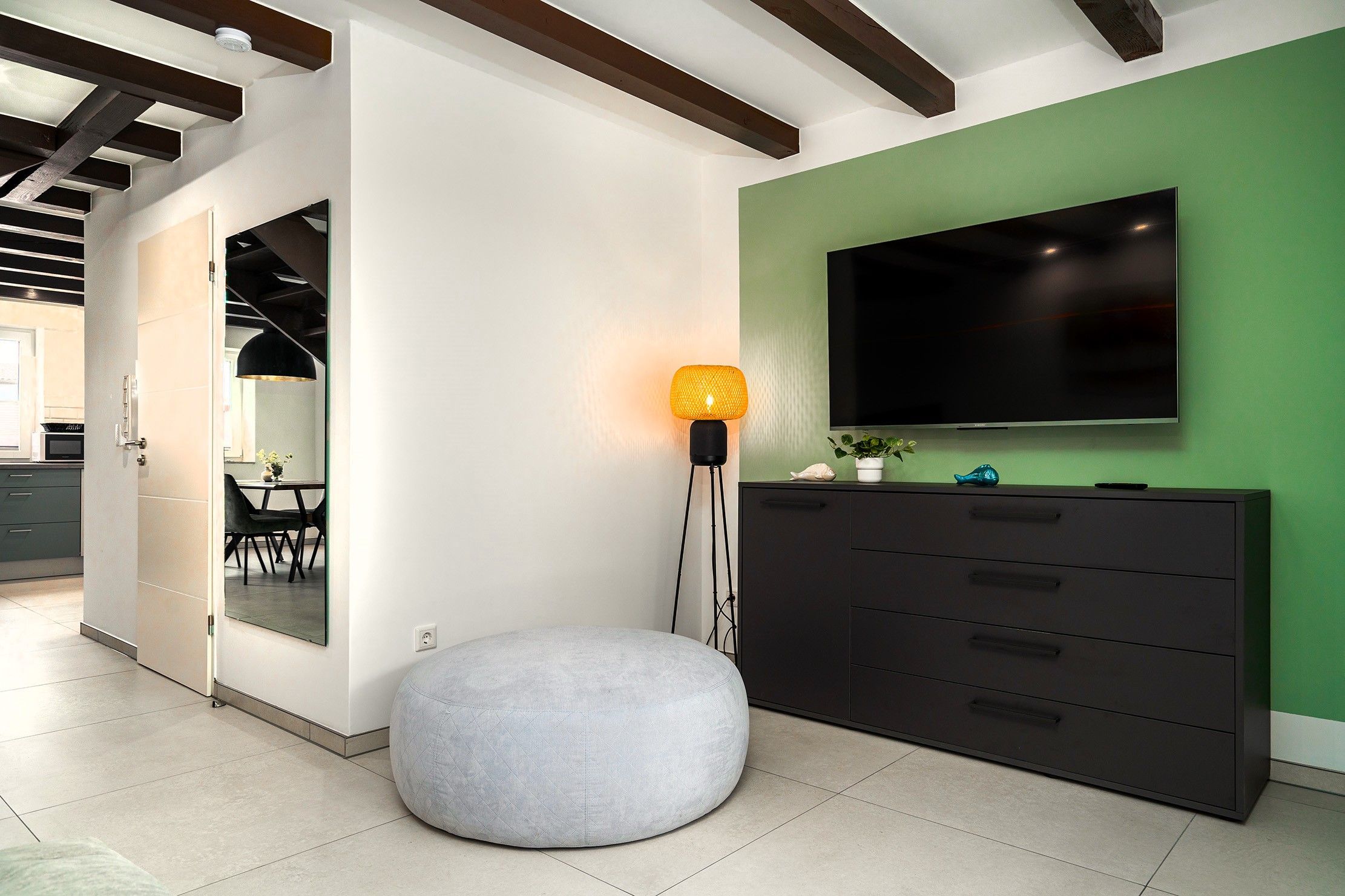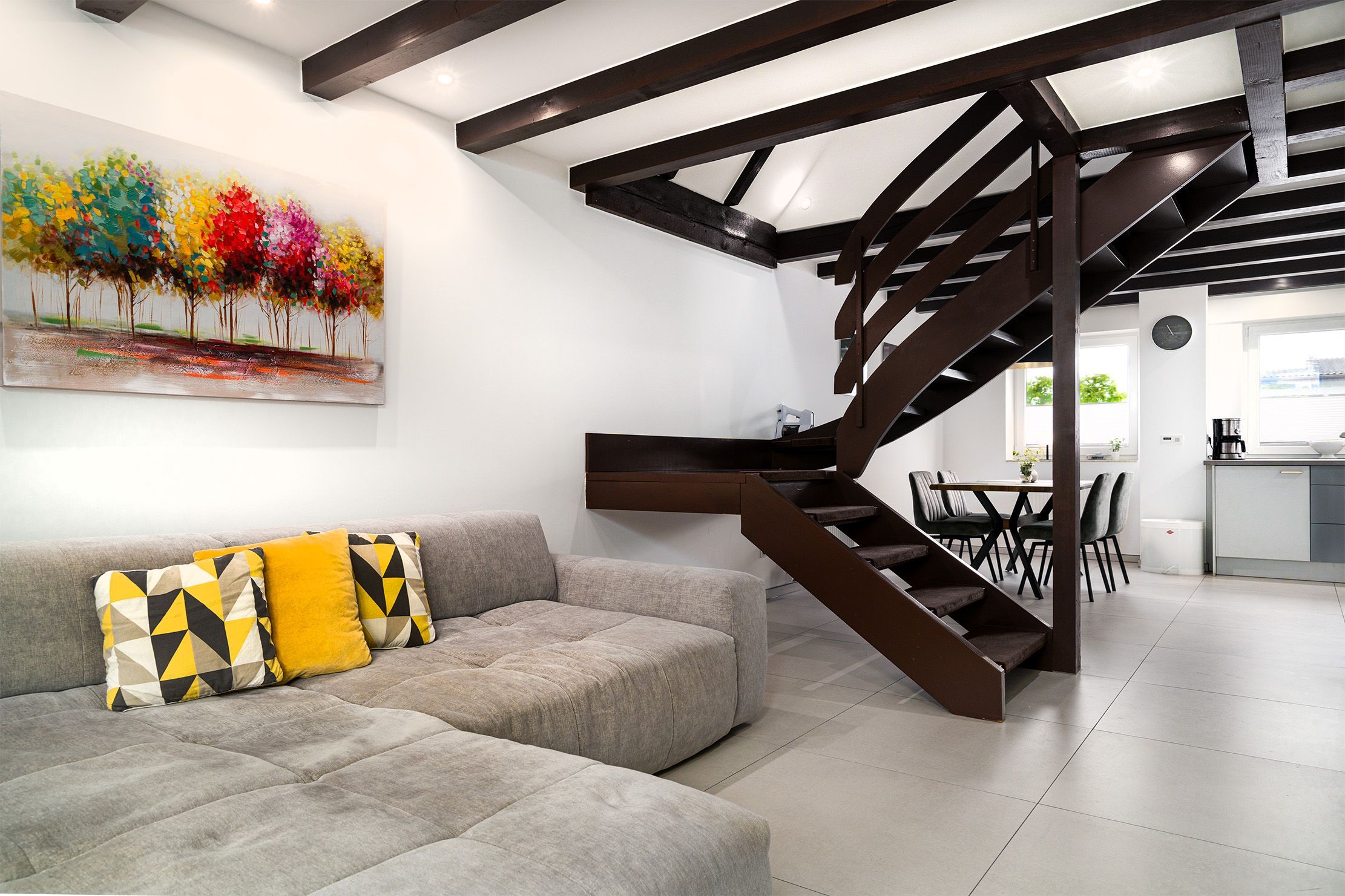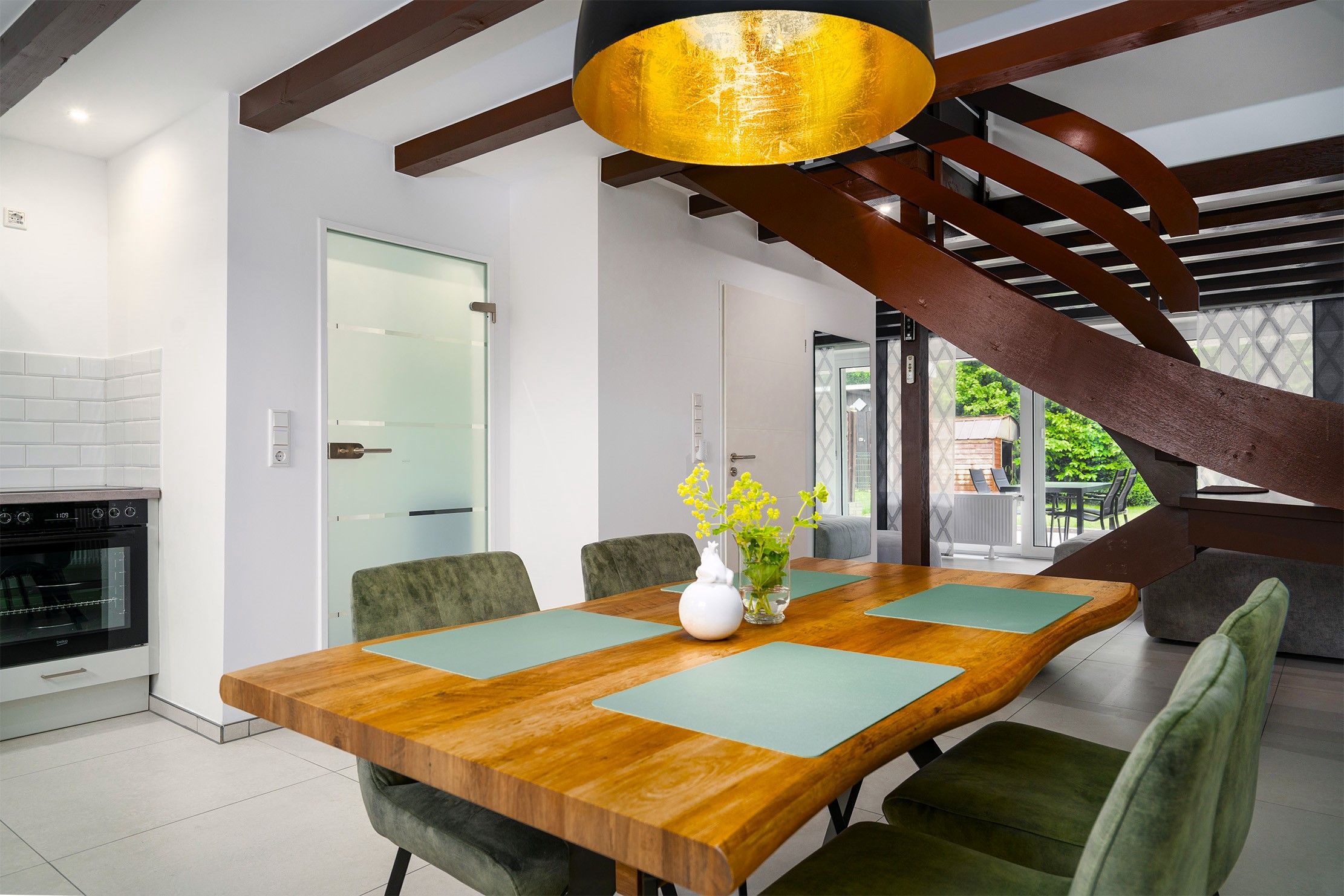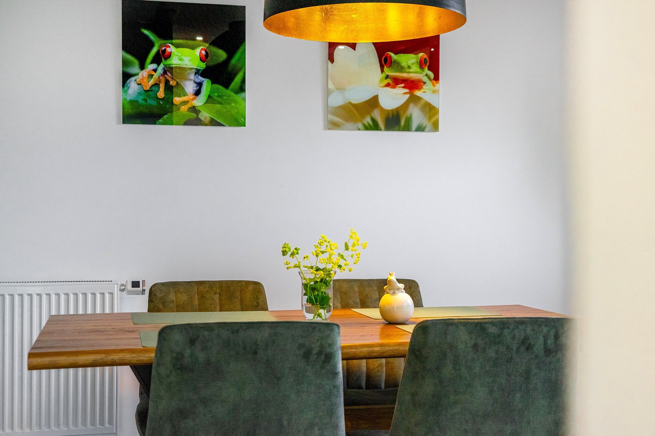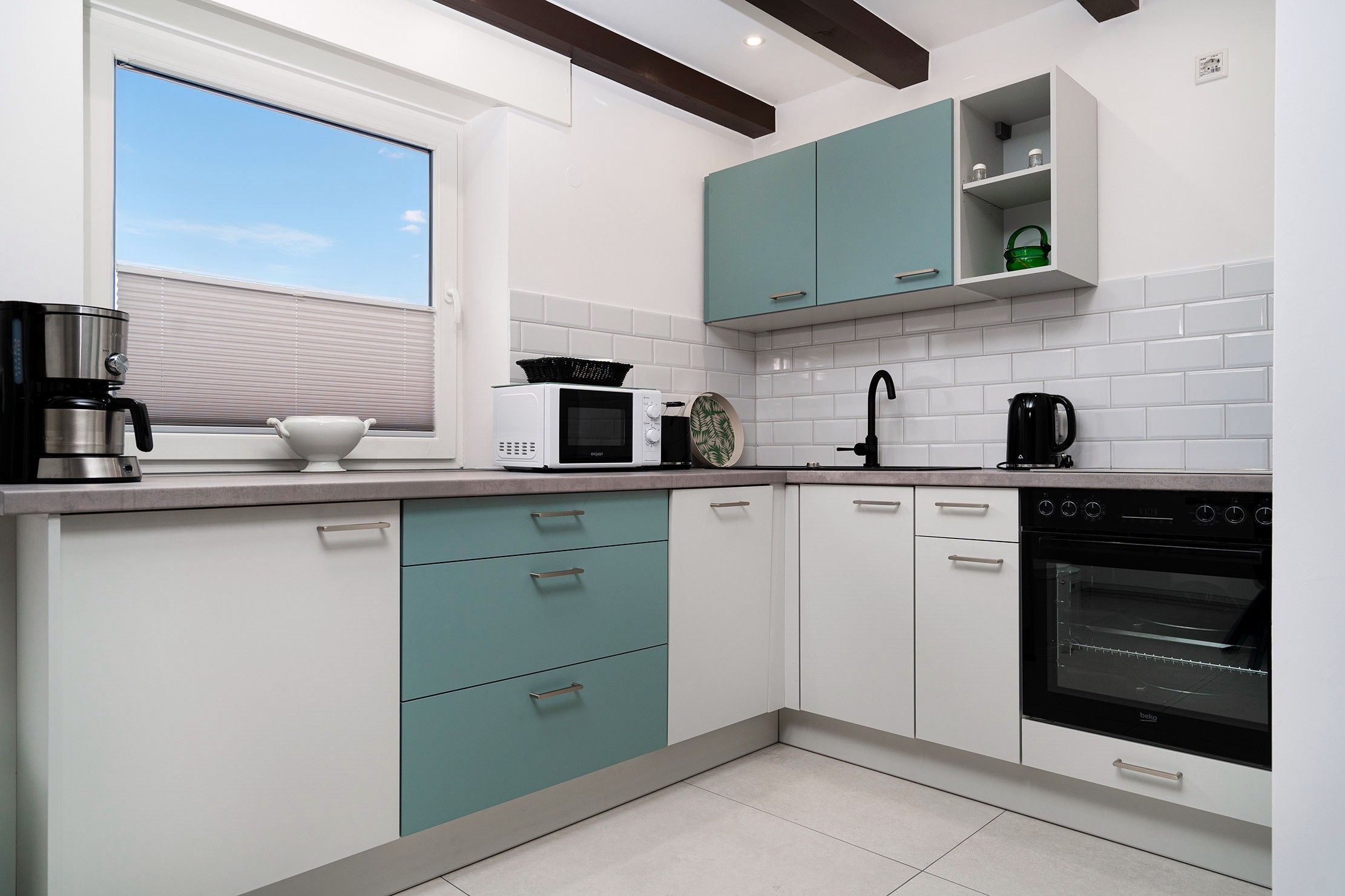 Das Ferienhaus „Kleine Hütte“ ist modern und gemütlich eingerichtet und gestaltet sowie sehr gut ausgestattet. Es gibt zum Beispiel eine Küche mit Geschirrspülmaschine und eine große Terrasse am Wohnzimmer mit direktem Gartenzugang und ein großzügiges Badezimmer.
