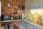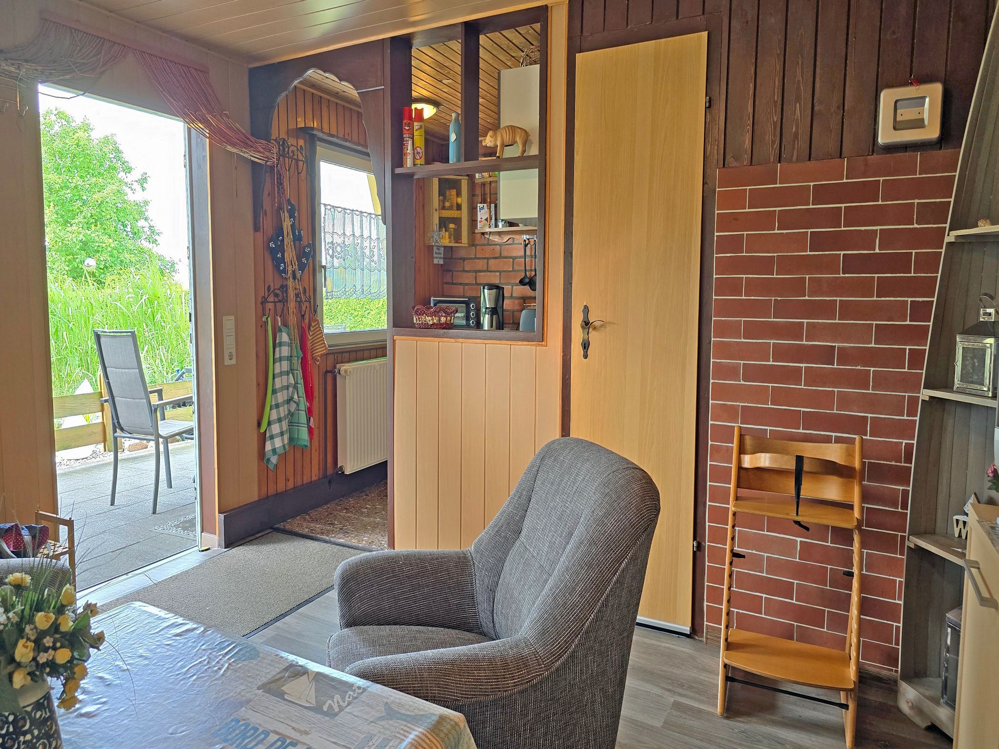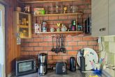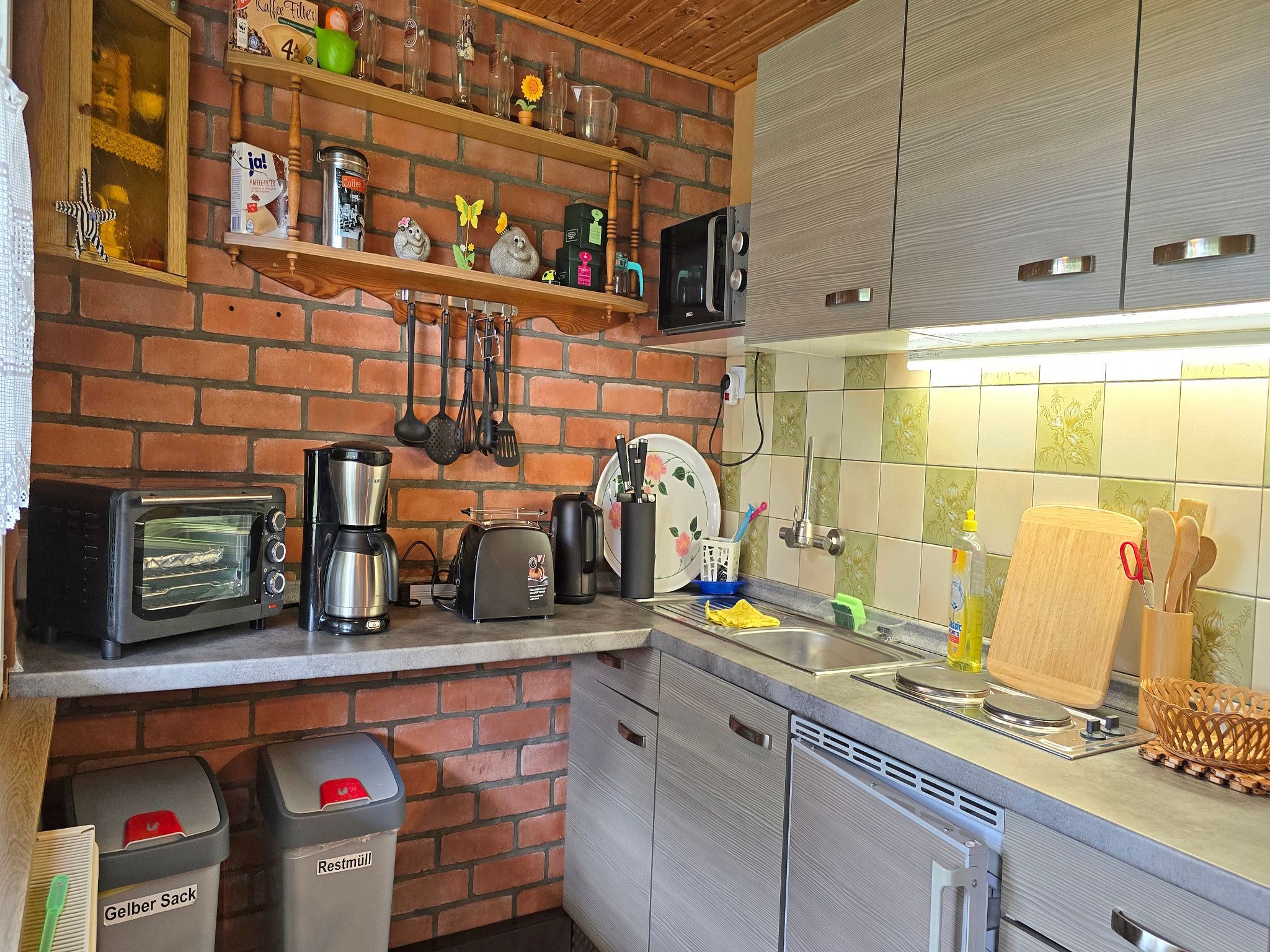 Die Küche ist offen zum Wohnbereich und bietet einen 2-Plattenherd, Mini-Backofen, Mikrowelle, Kühlschrank mit Tiefkühlfach, Toaster, Kaffeemaschine und Wasserkocher.