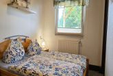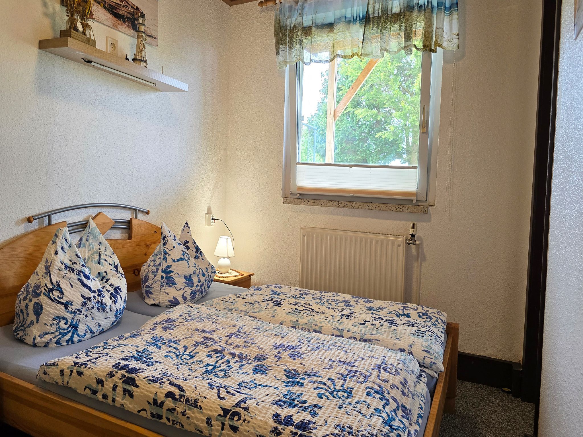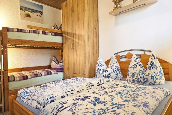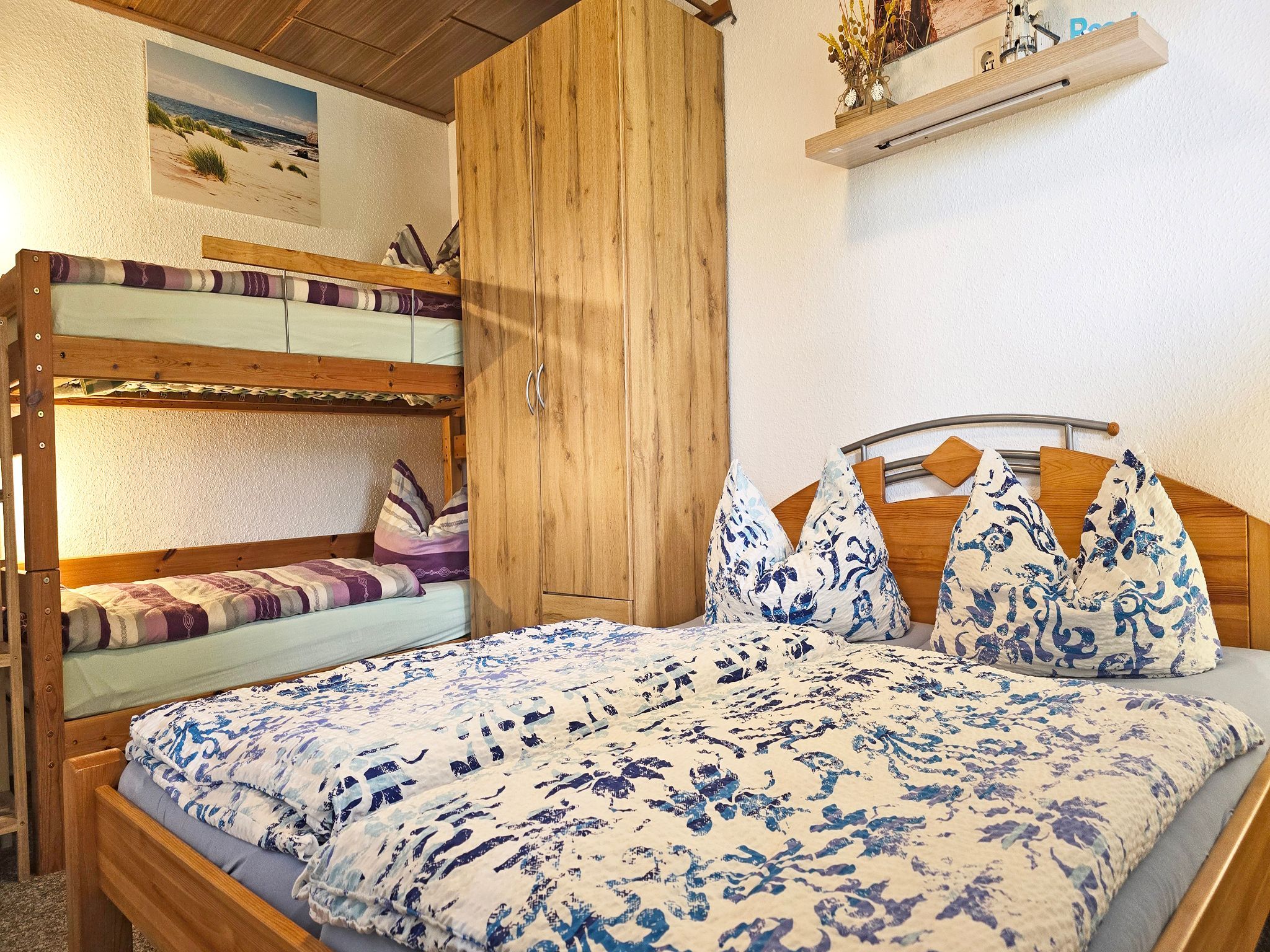 Ein separates Schlafzimmer mit Doppelbett und einem Etagenbett.