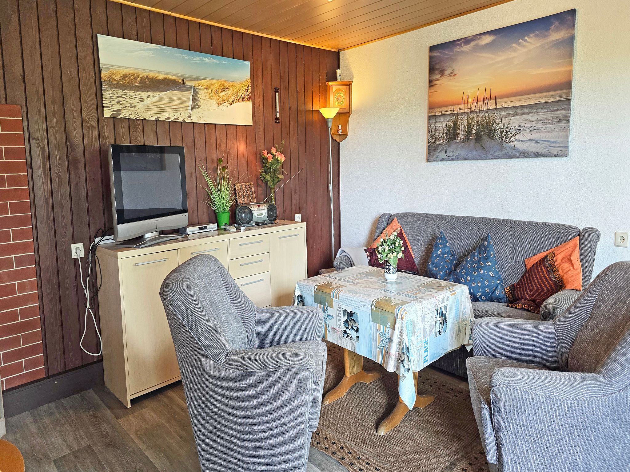 Wohnzimmer mit Couchgarnitur, Flachbild-TV und Radio.