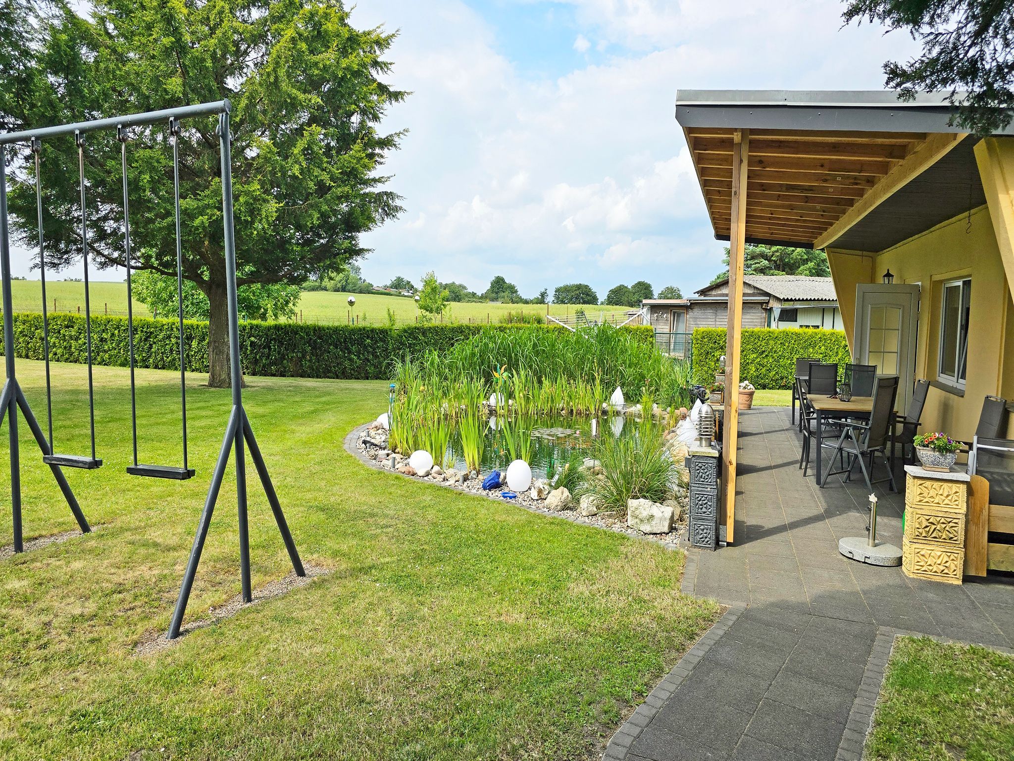 Der großzügige Garten mit Doppelschaukel und ein Teich mit Goldfischen lädt zum verweilen ein. Weiterhin im Garten nutzbar ist eine Wäschespinne, ein Federballspiel und eine Unterstellmöglichkeit für Fahrräder.