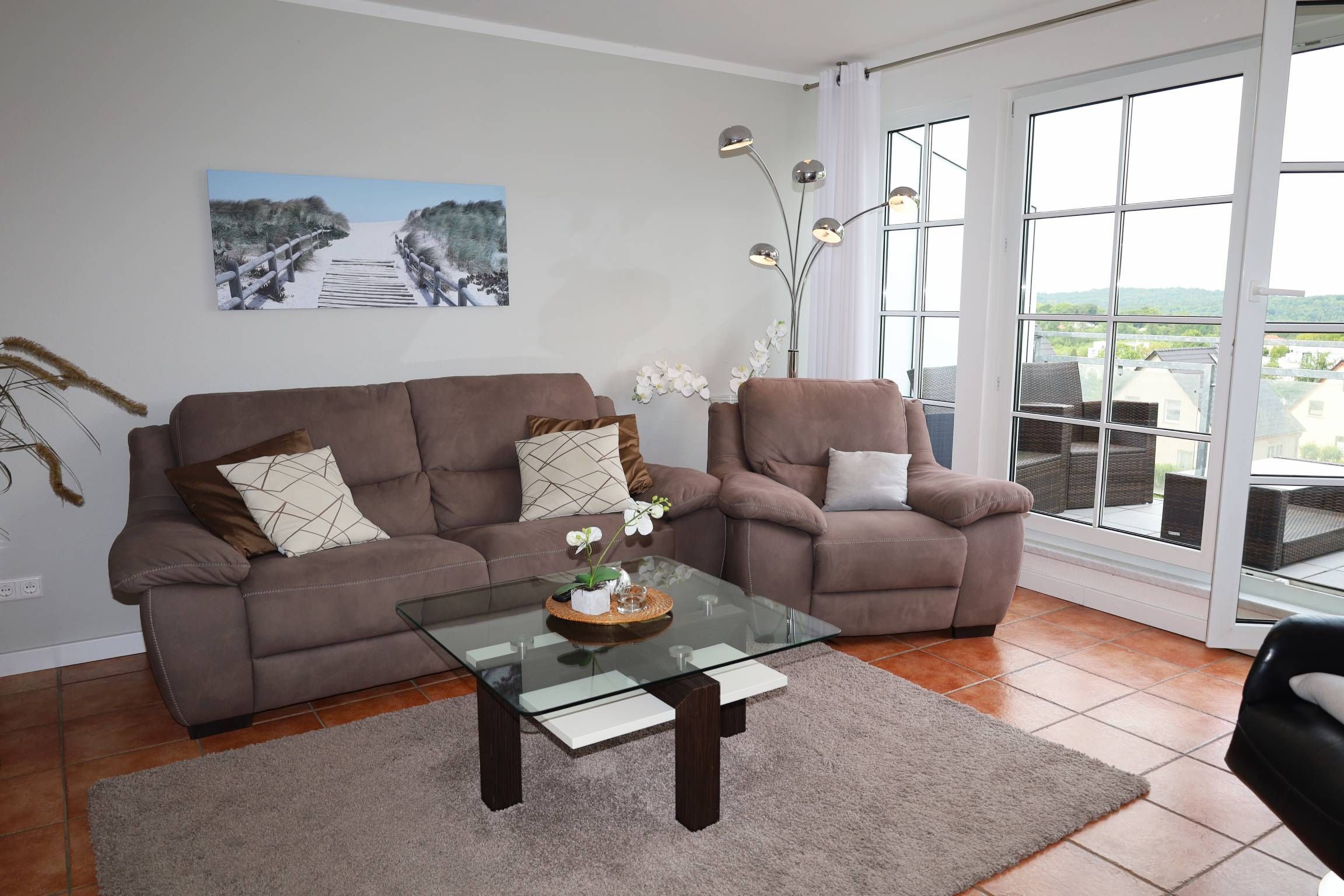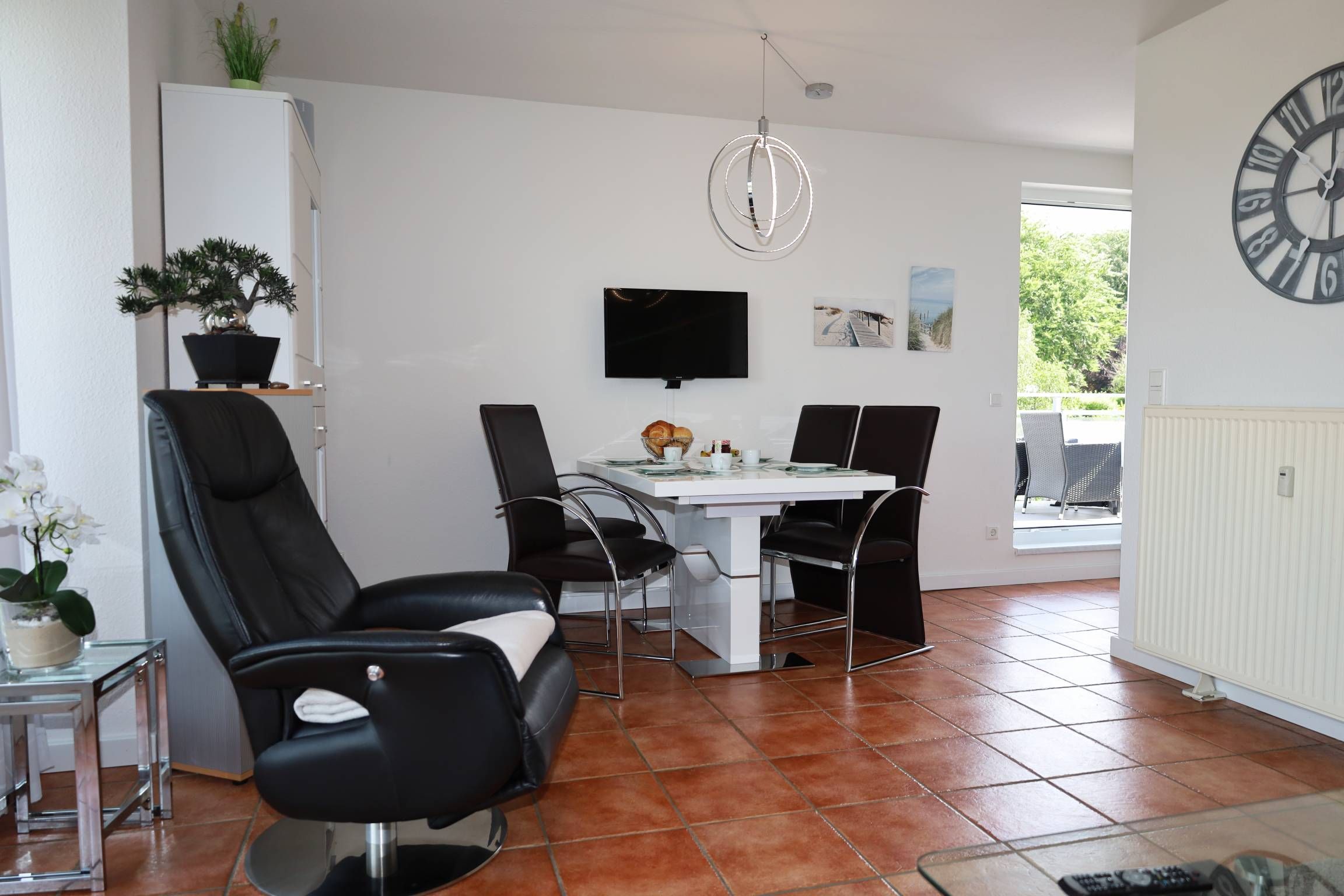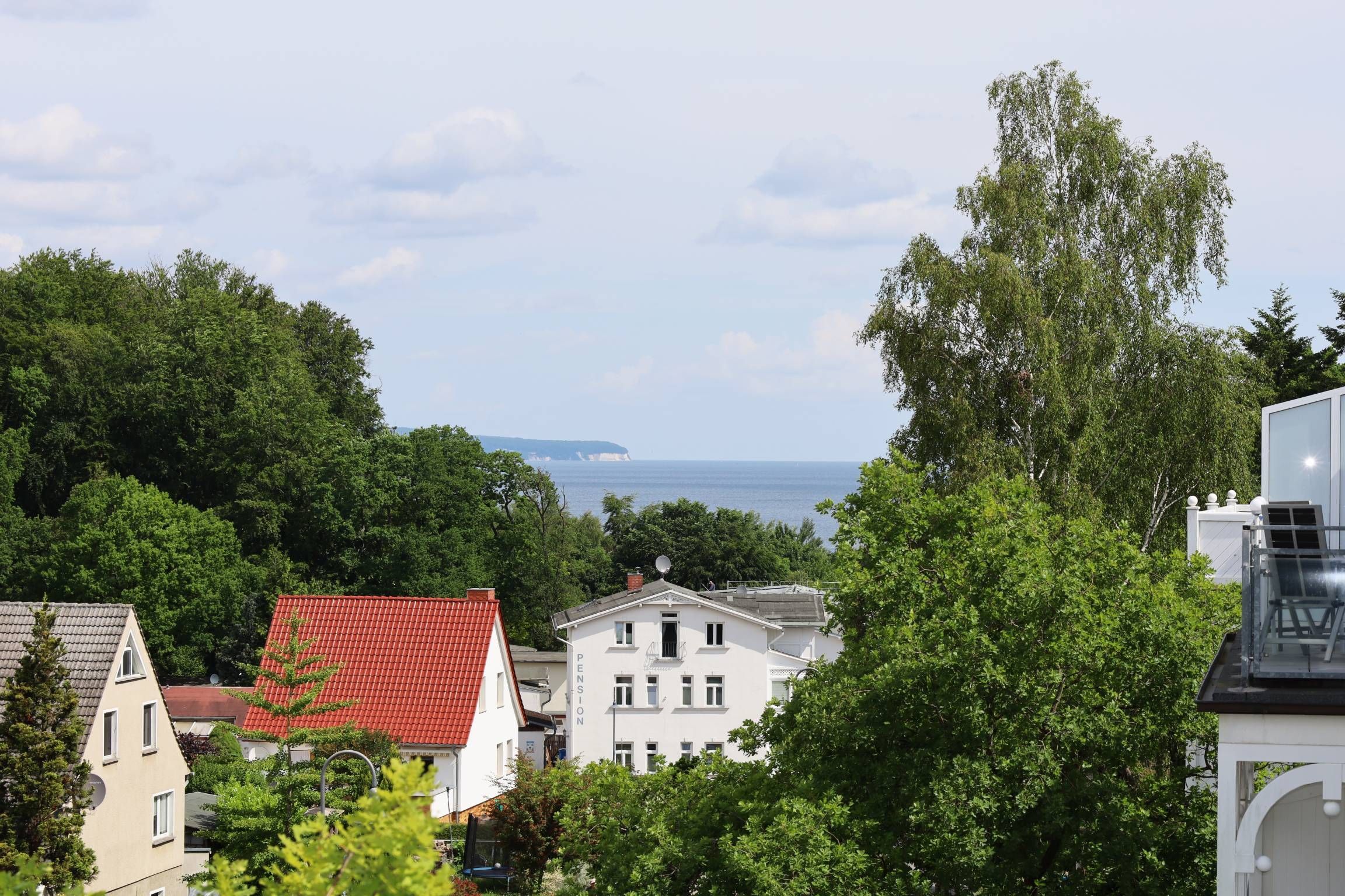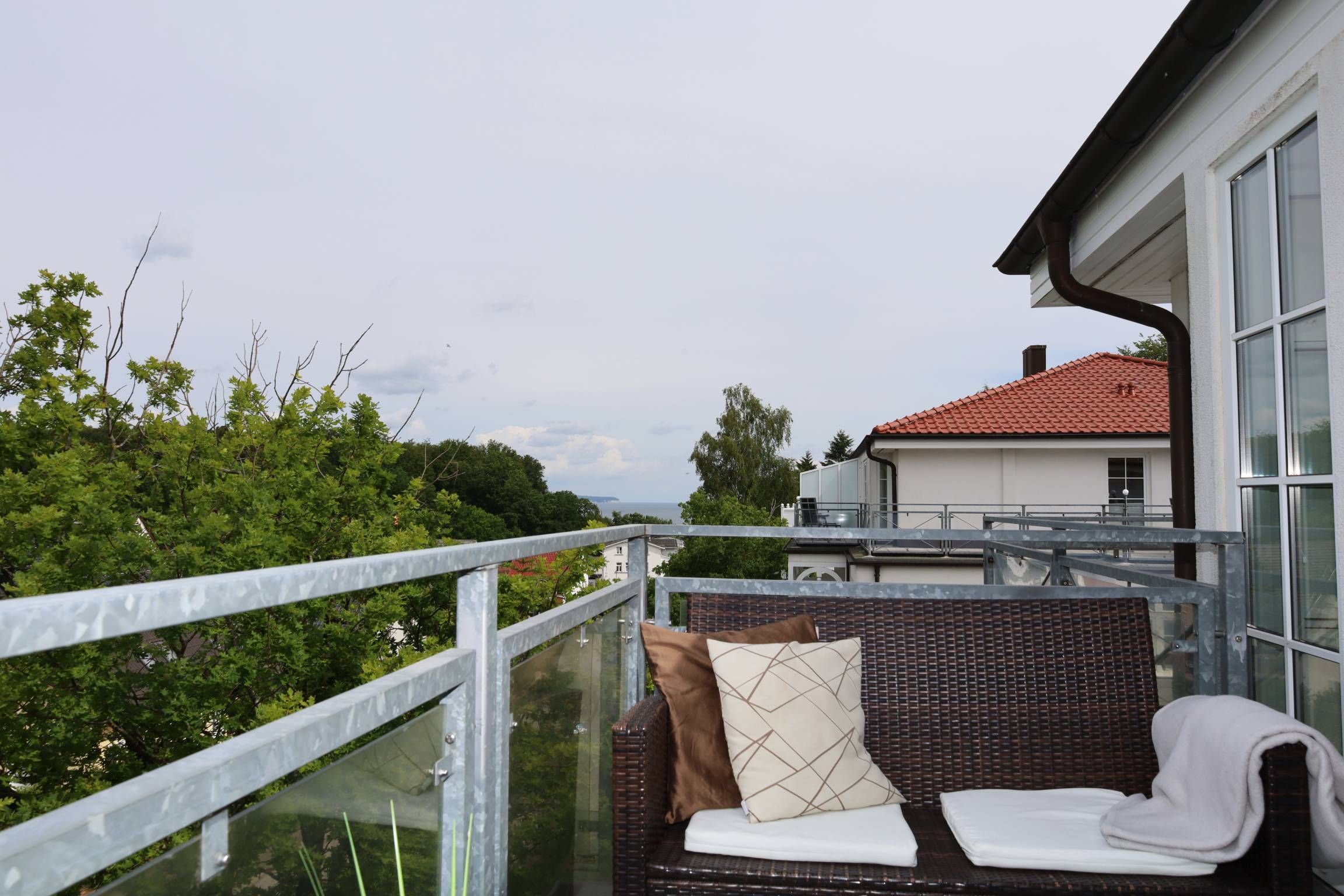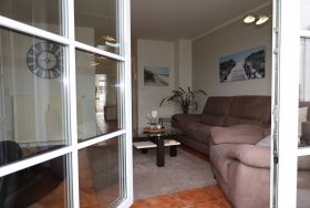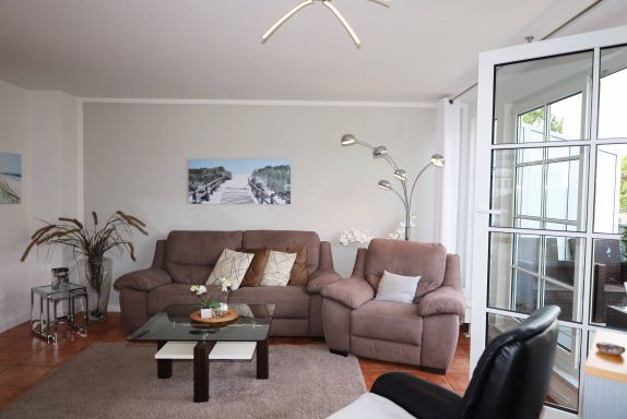 Der Wohnbereich ist mit eienm gemütlichen Sofa und zwei Relaxsesseln sowie einem TV ausgestattet. Sie gelangen vom Wohnbereich aus auf den Balkon, der einen herrlichen Ausblick über Binz bietet.