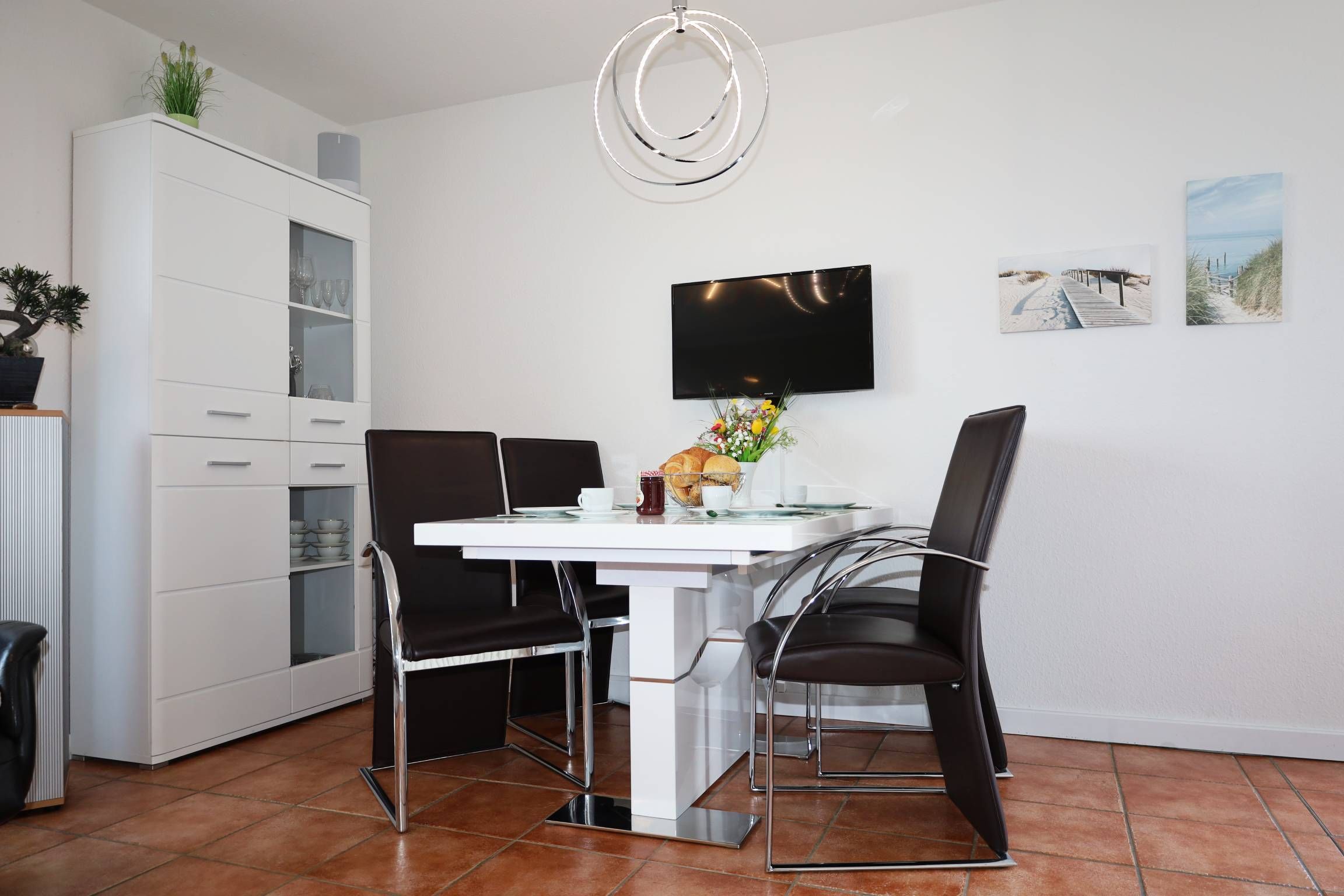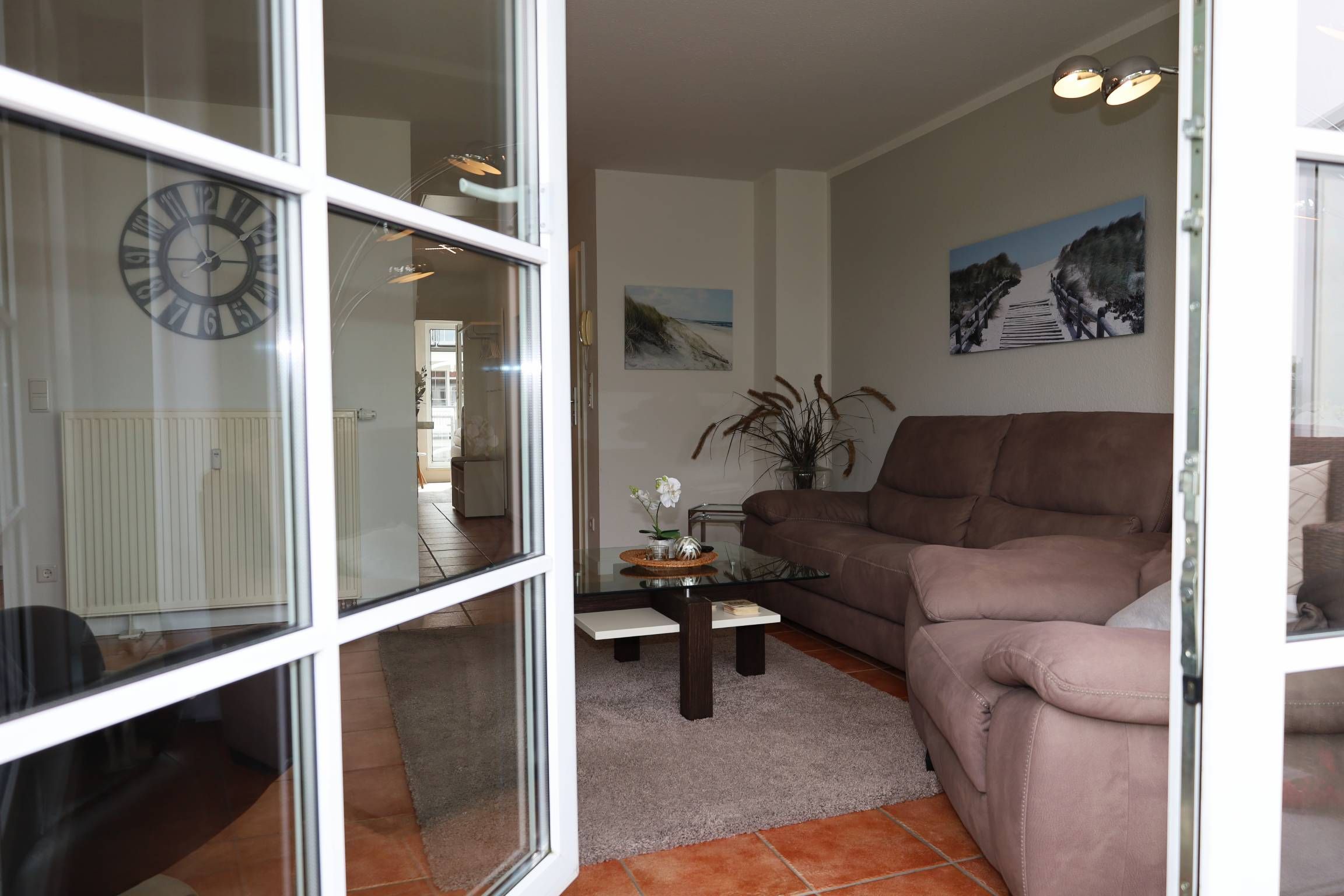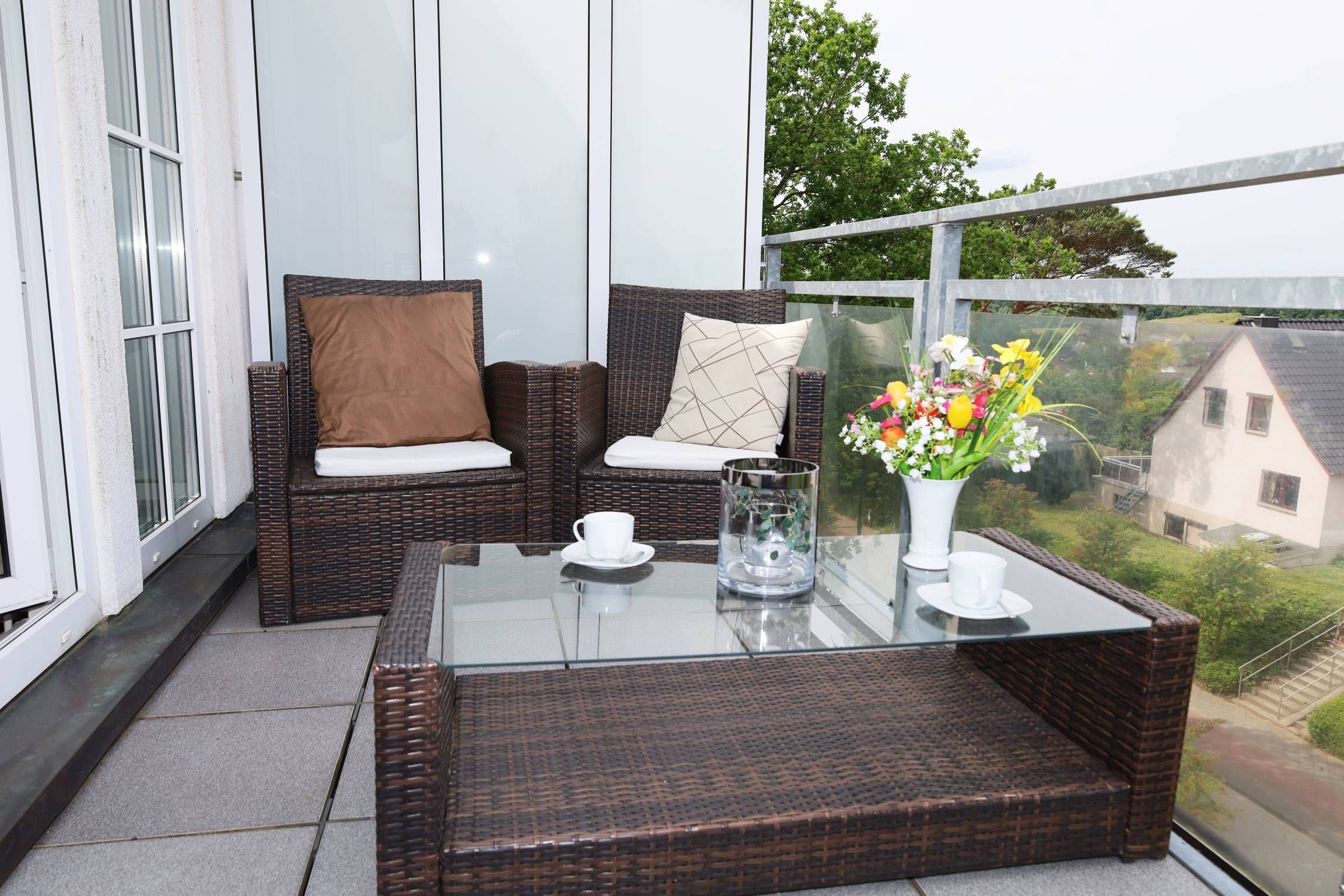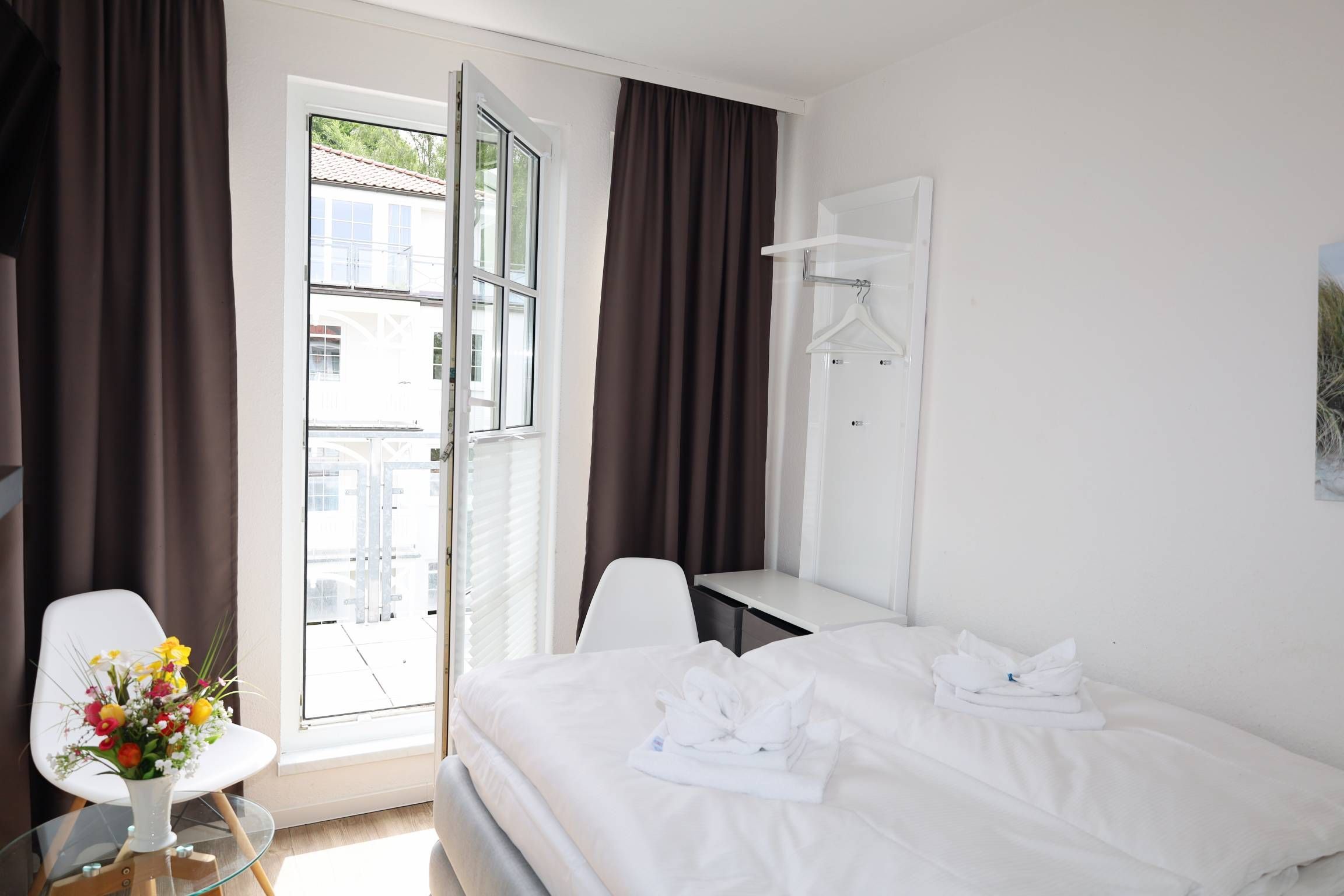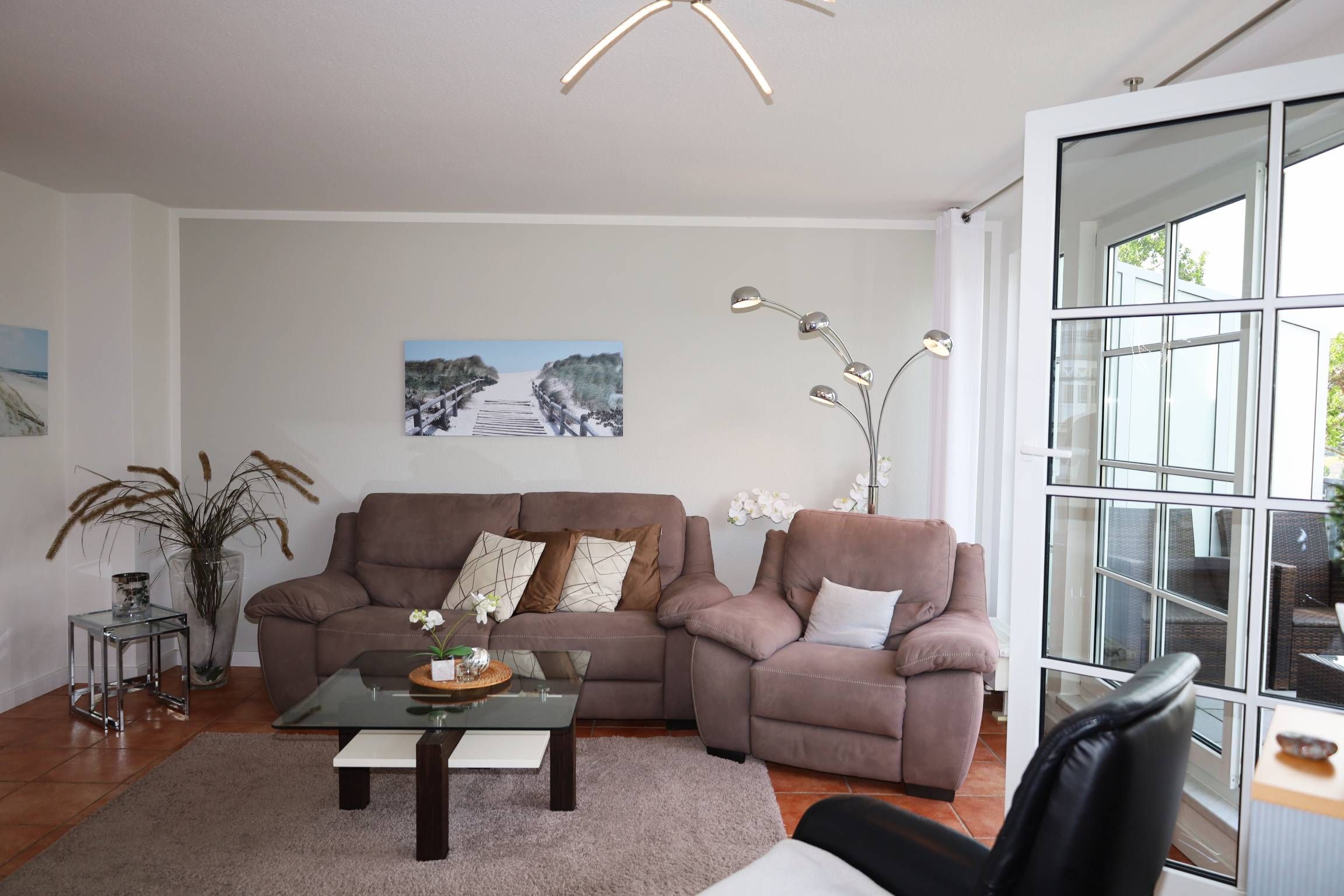 Der Wohnbereich ist mit eienm gemütlichen Sofa und zwei Relaxsesseln sowie einem TV ausgestattet. Sie gelangen vom Wohnbereich aus auf den Balkon, der einen herrlichen Ausblick über Binz bietet.
