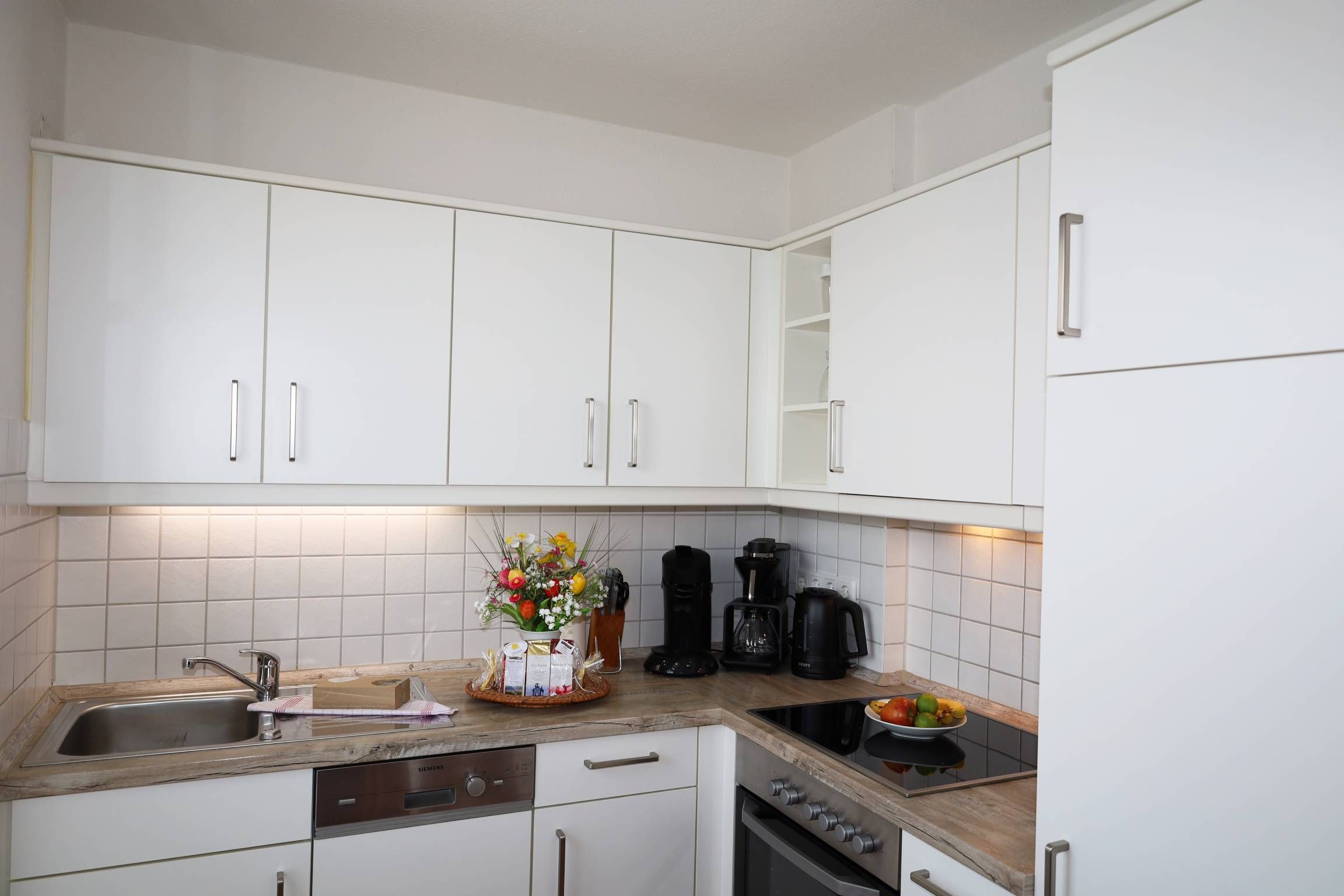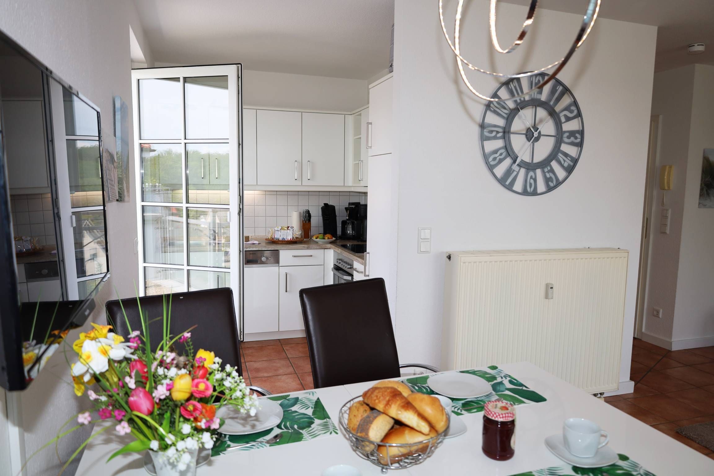 Die Wohnung verfügt über einen lichtdurchfluteten Wohn- und Essbereich mit offener Küche. Die Küchenzeile ist komplett ausgestattet mit Geschirrspüler, Ceran-Back-Herd und weiteren nützlichen Geräten wie Kaffeemaschine, Toaster, Wasserkocher und bietet alles für ein gemeinsames Schlemmern mit den Lieben.