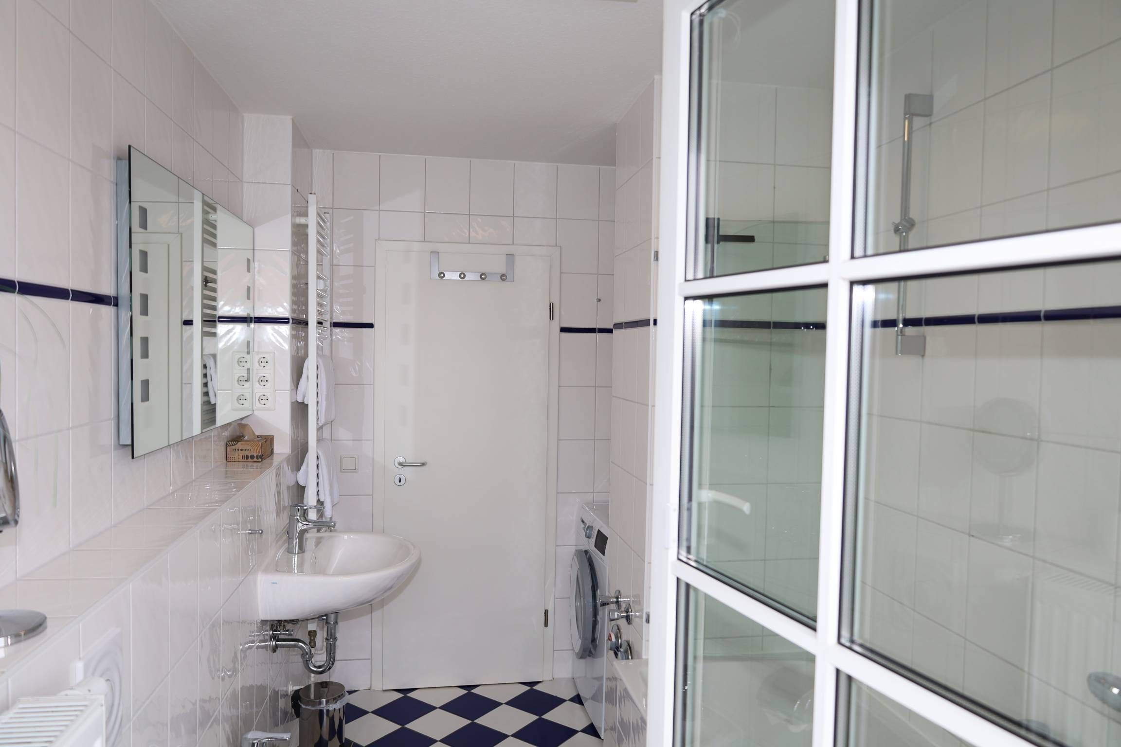 Das Badezimmer ist mit einer Badewanne und Bidet ausgestattet. Es ist mit hellen Fliesen versehen. Eine Waschmaschine steht Ihnen direkt im Appartement zur Verfügung. Ein Fön ist ebenfalls vorhanden.