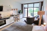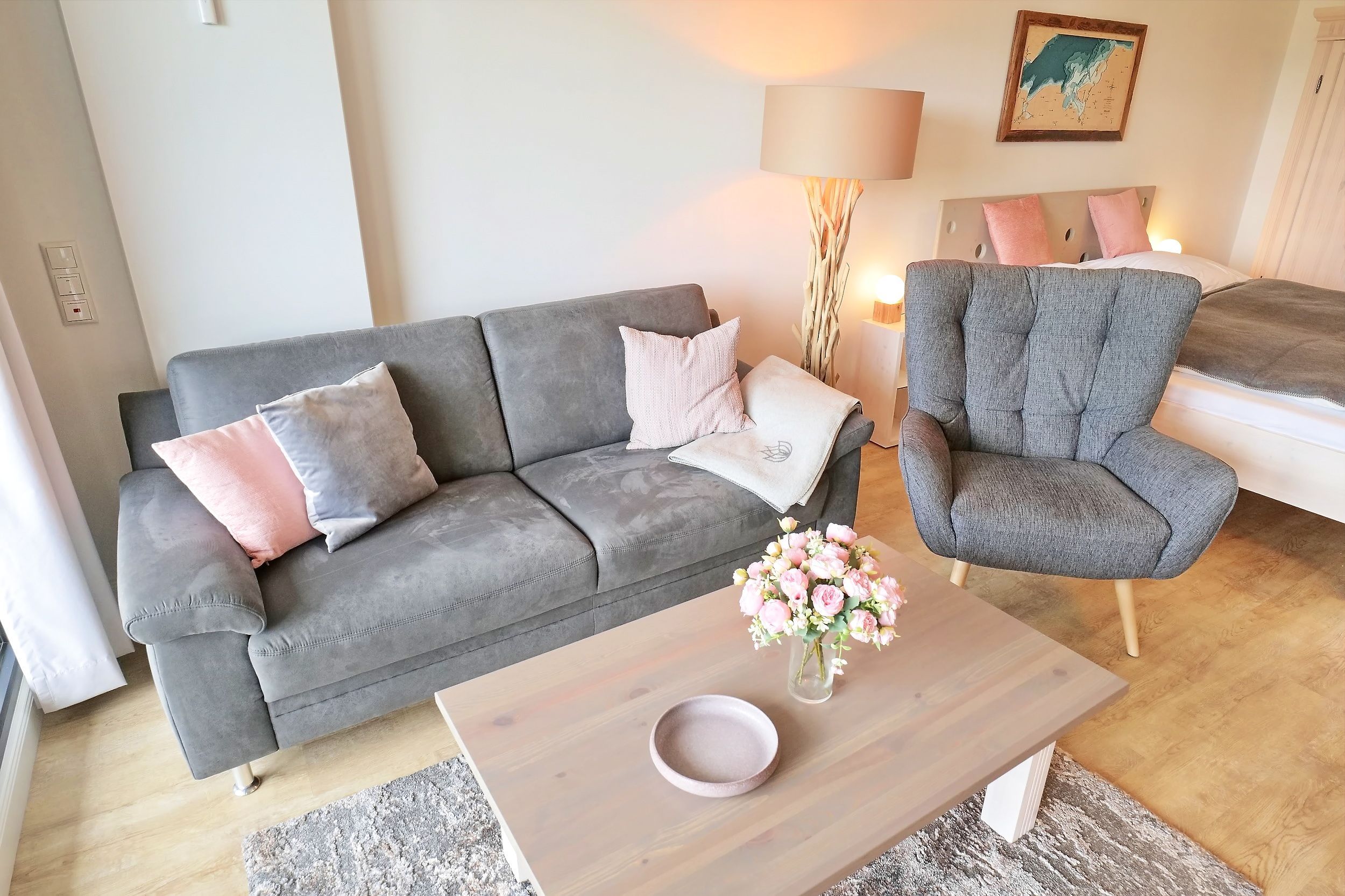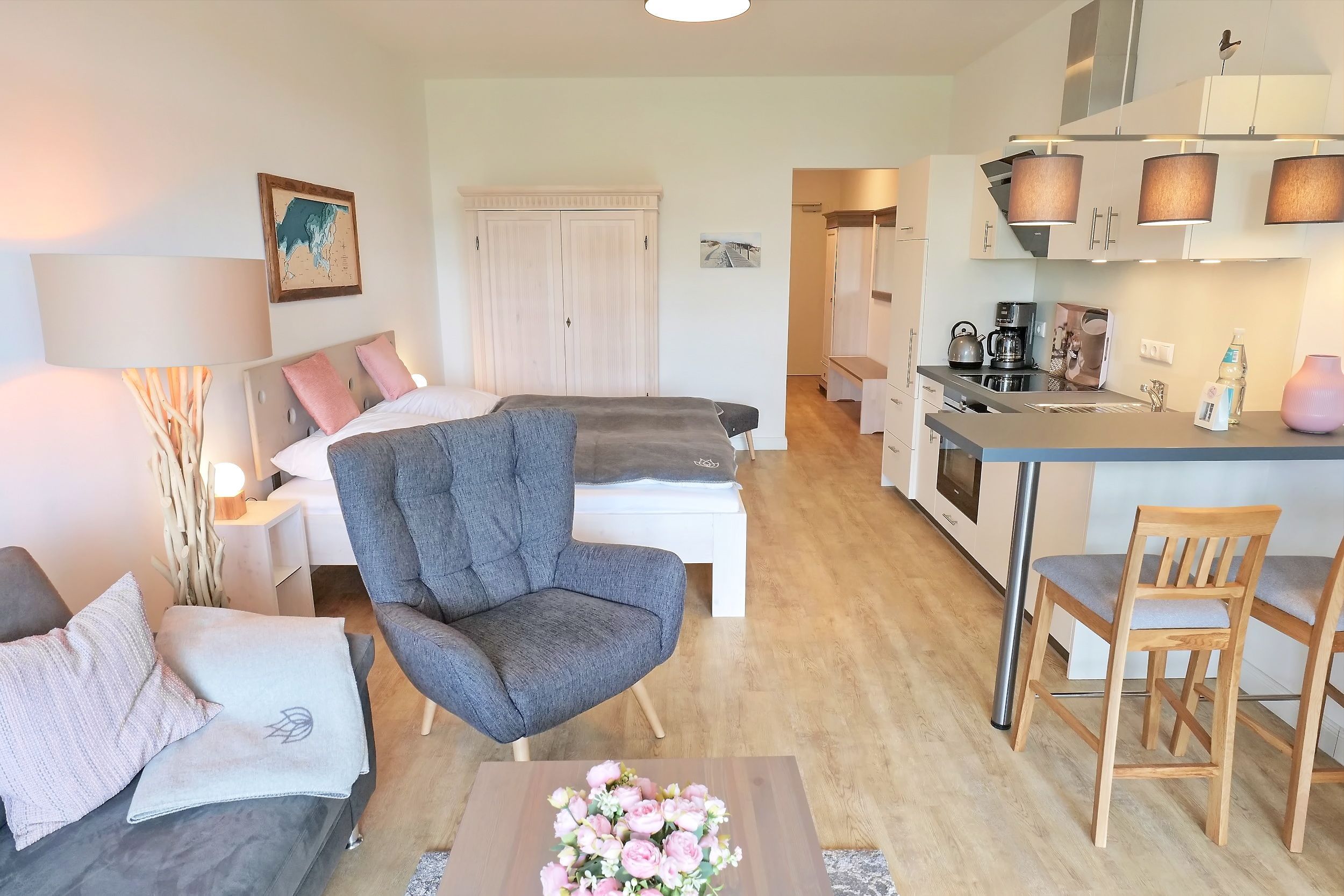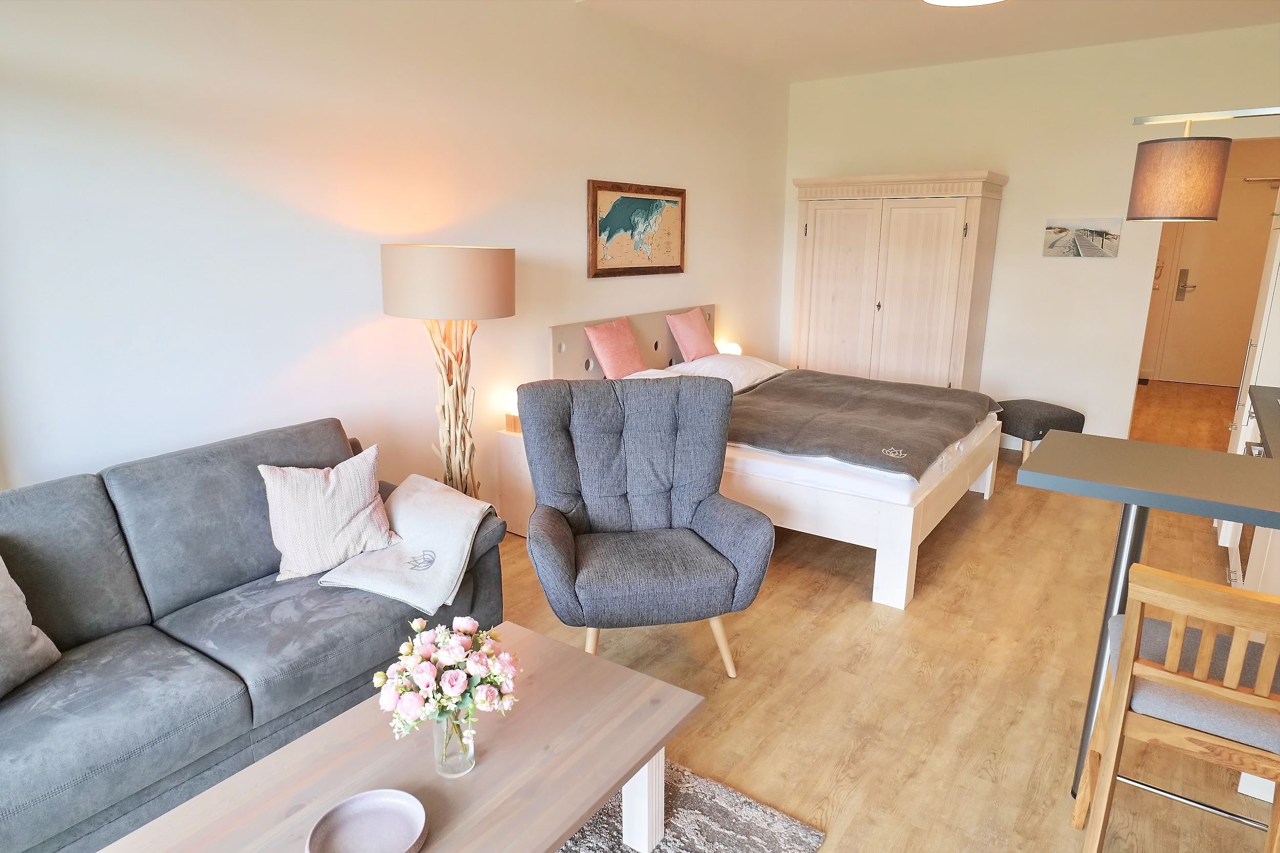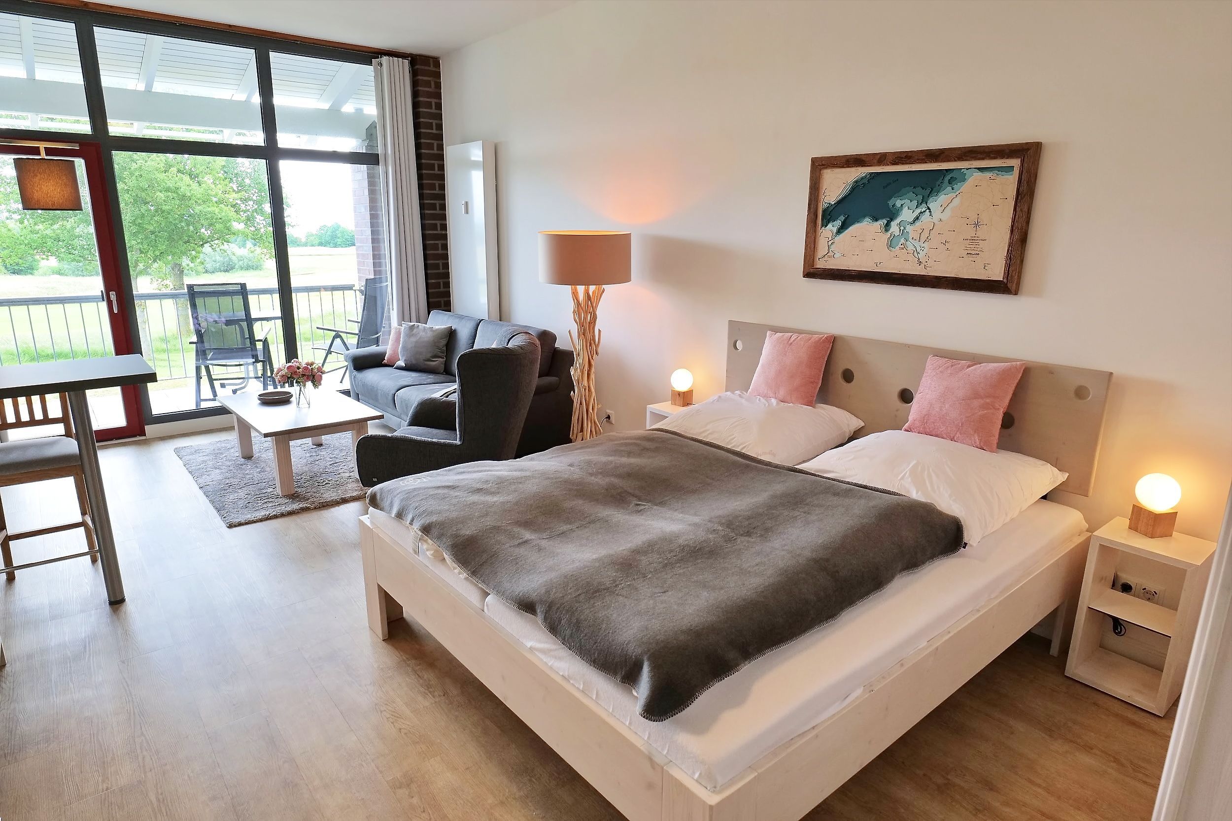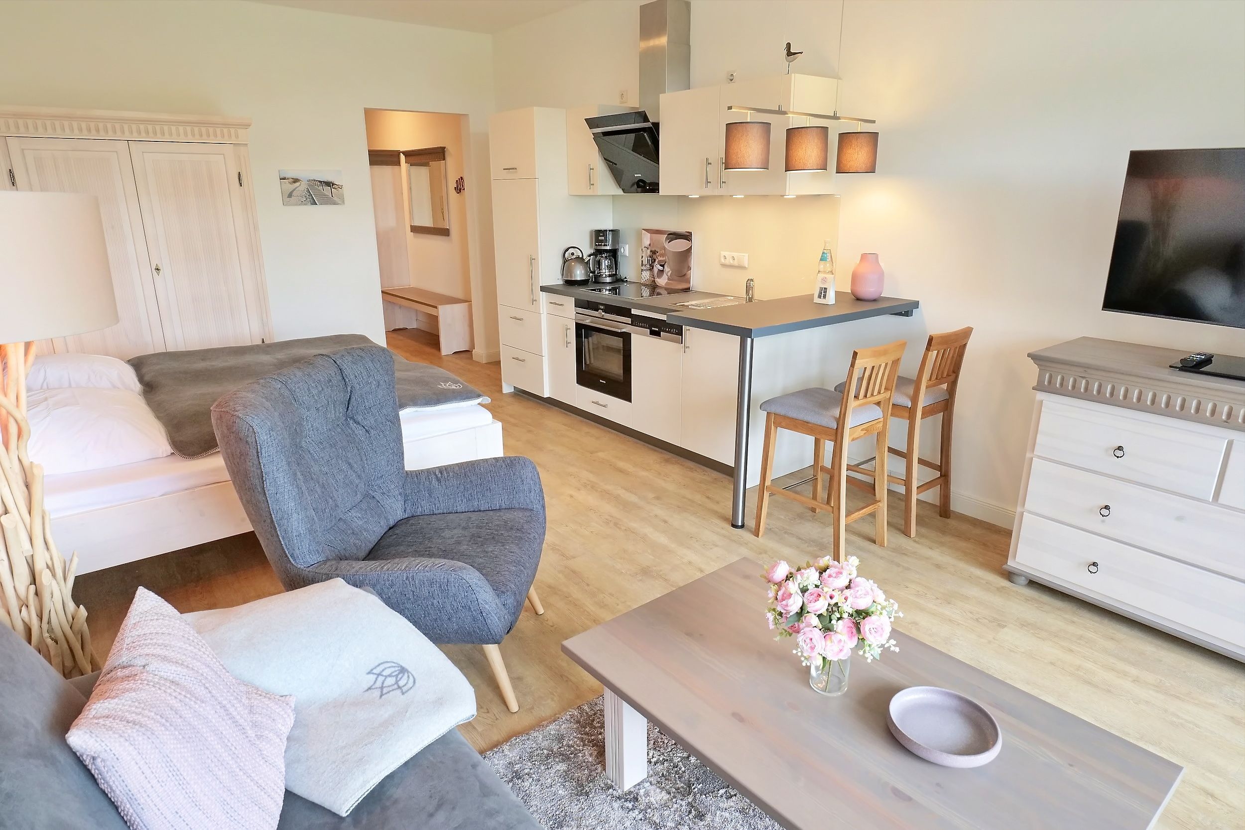 Erholsame Zeit zu zweit. Das 1-Zimmer-Komfort-Appartement Huk's No. 22, schenkt Ihnen eine erholsame Auszeit nahe zur Ostsee. Mit einer Wohnfläche von 40qm ist dieses Feriendomizil ideal geeignet für eine Belegung mit zwei Personen. Das Appartement befindet sich im 1. Obergeschoss des Hauses und besitzt eine, saisonal möblierten Balkon in östliche Richtung. Der helle und freundliche Wohn-/Essbereich empfängt Sie stilvoll möbliert mit einem Sofa, Beistelltisch sowie