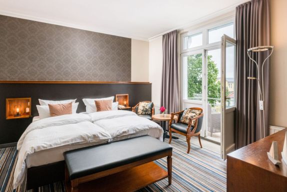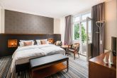 geräumige Doppelzimmer, ausgestattet mit Boxspringbetten, Schreibtisch mit Sessel, teilweise Balkon mit Gartenblick, Minibar, größtenteils separates WC, Bad mit Dusche oder Wanne.