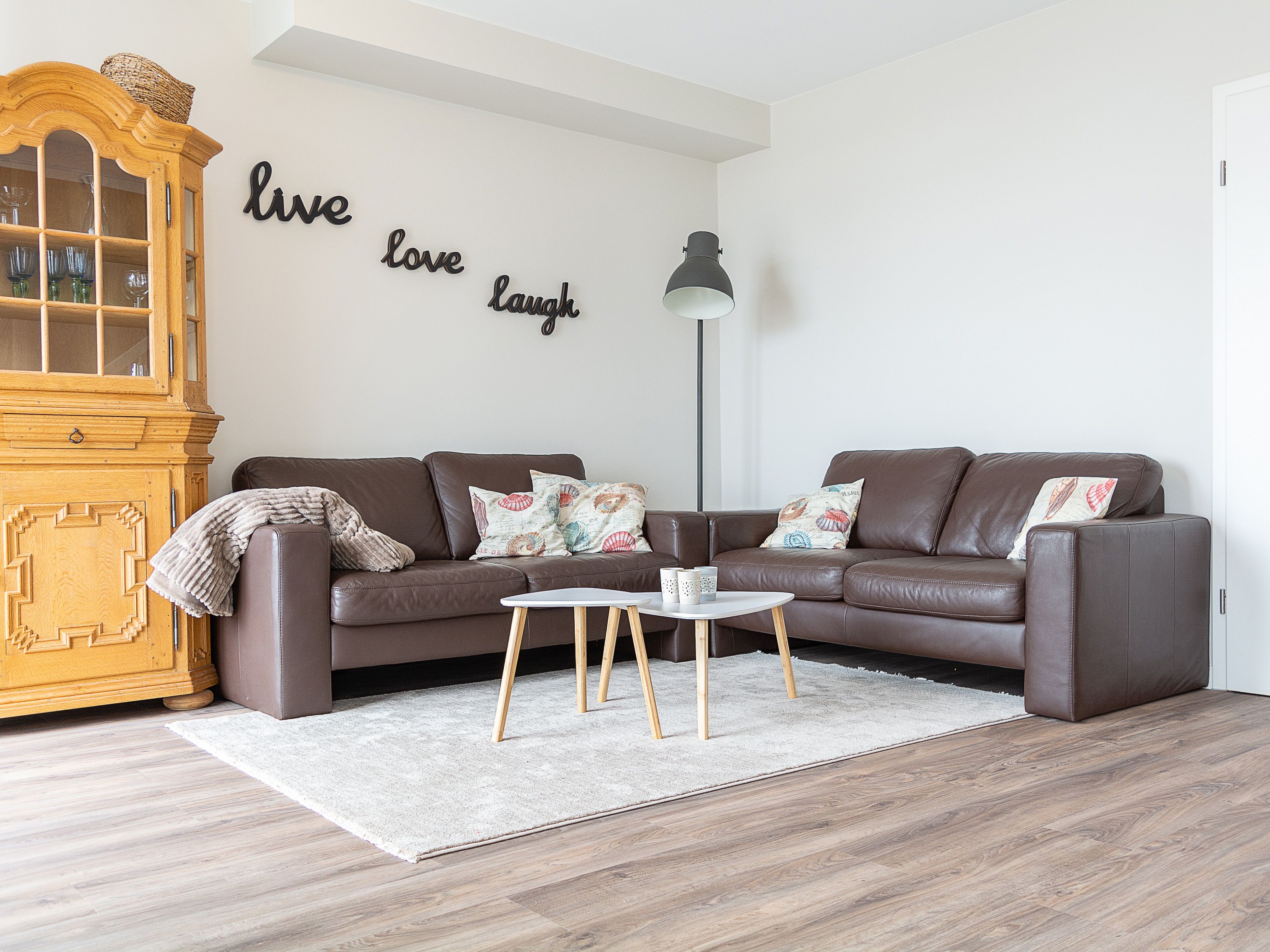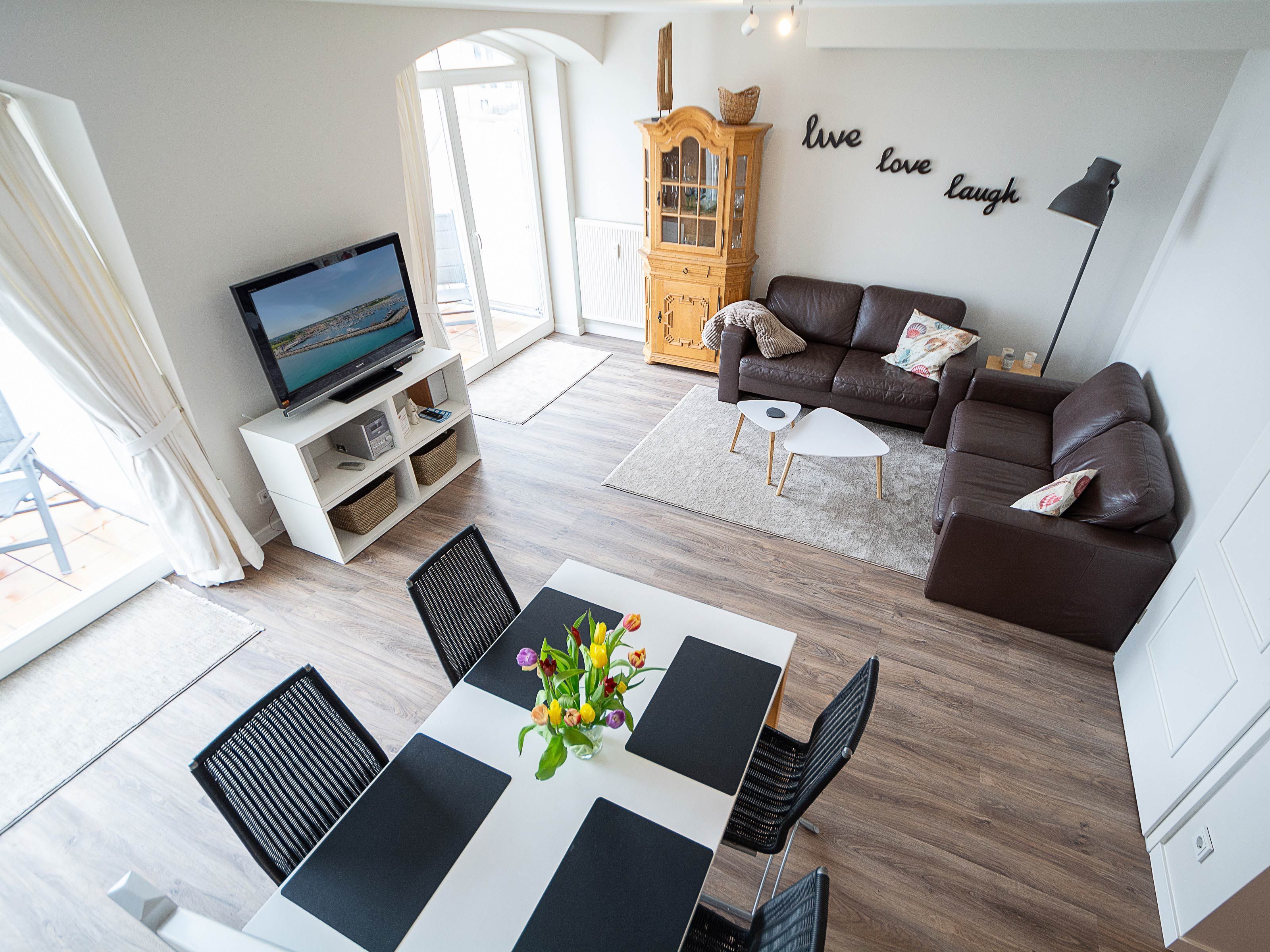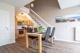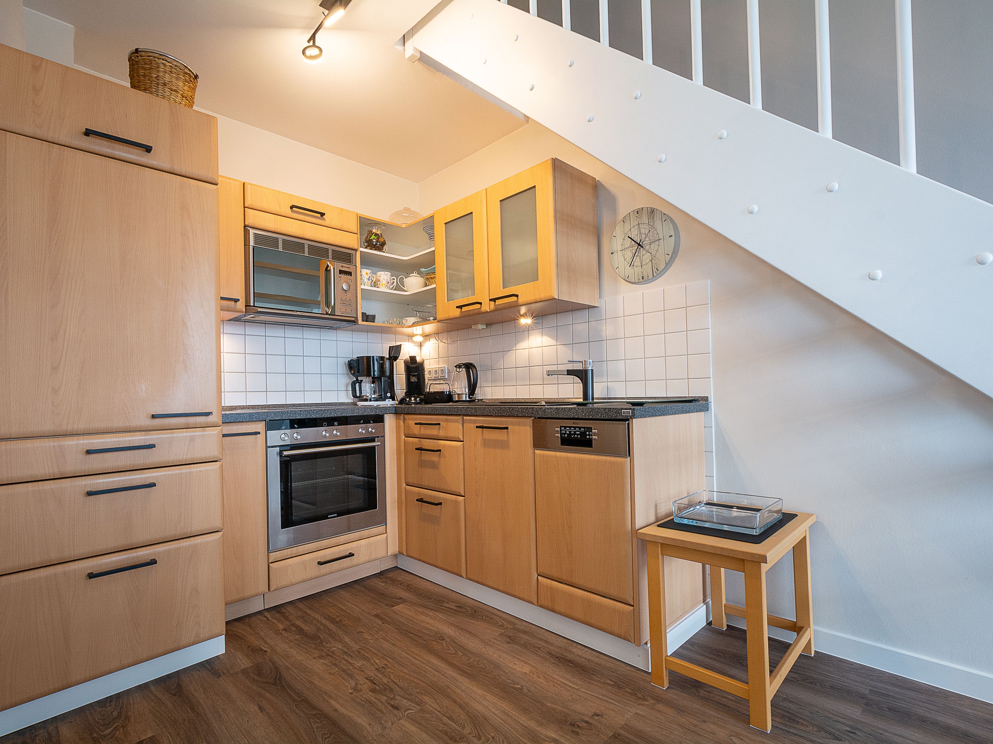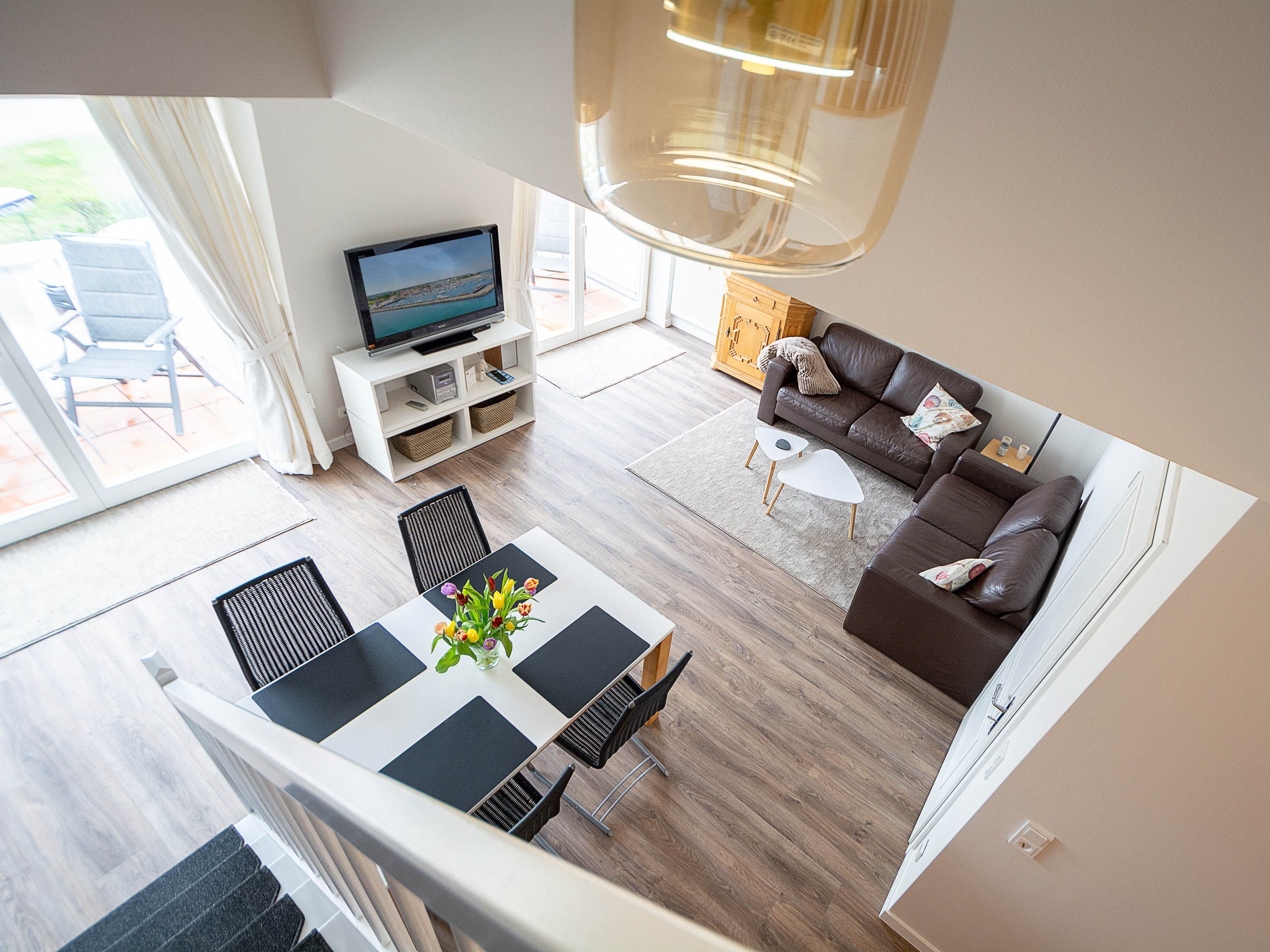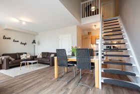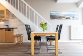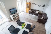 Der mit hochwertigen Möbeln eingerichtete Wohnbereich ist mit einer gemütlichen Couchgarnitur und einem 65-Zoll Flatscreen-TV eingerichtet. Die beiden Echtleder Couches bieten bequemen Sitzkomfort. Der angrenzende Essbereich bietet Ihnen reichlich Platz für gemeinsame Mahlzeiten. Die offene Küchenzeile hält für Sie alle wichtigen Küchengeräte und -utensilien bereit, die Sie für Ihr perfektes Dinner benötigen: Ein 4-Zonen-Cerankochfeld, ein Backofen und eine Einbau-Mikrowelle in bequemer Stehhöhe, ein Geschirrspüler sowie ein Kühlschrank mit Gefrierfach befinden sich in der Küche. Eine Kaffeemaschine, ein Wasserkocher und ein Toaster sowie genügend Koch- und Essgeschirr vervollständigen die Kücheneinrichtung.