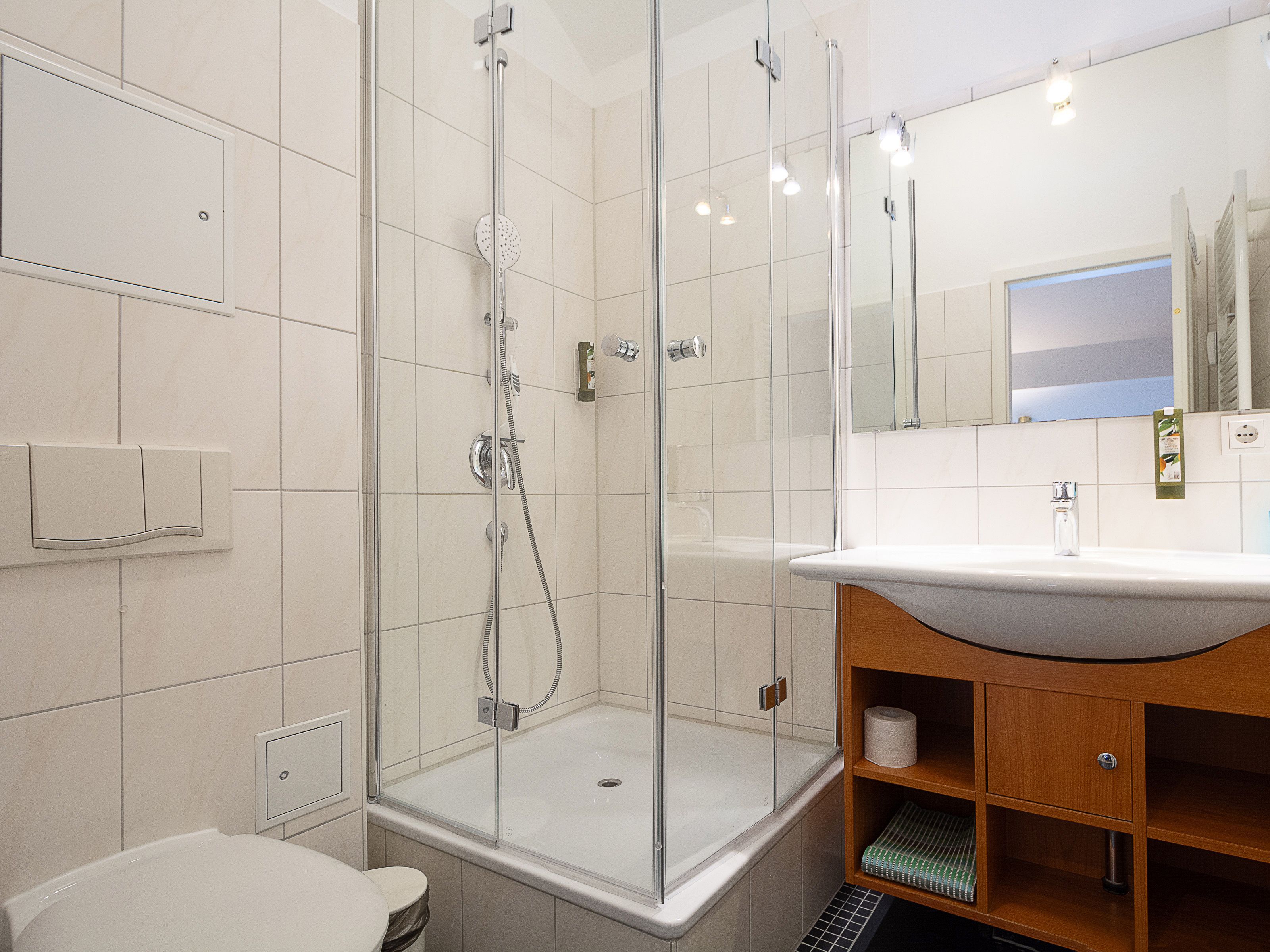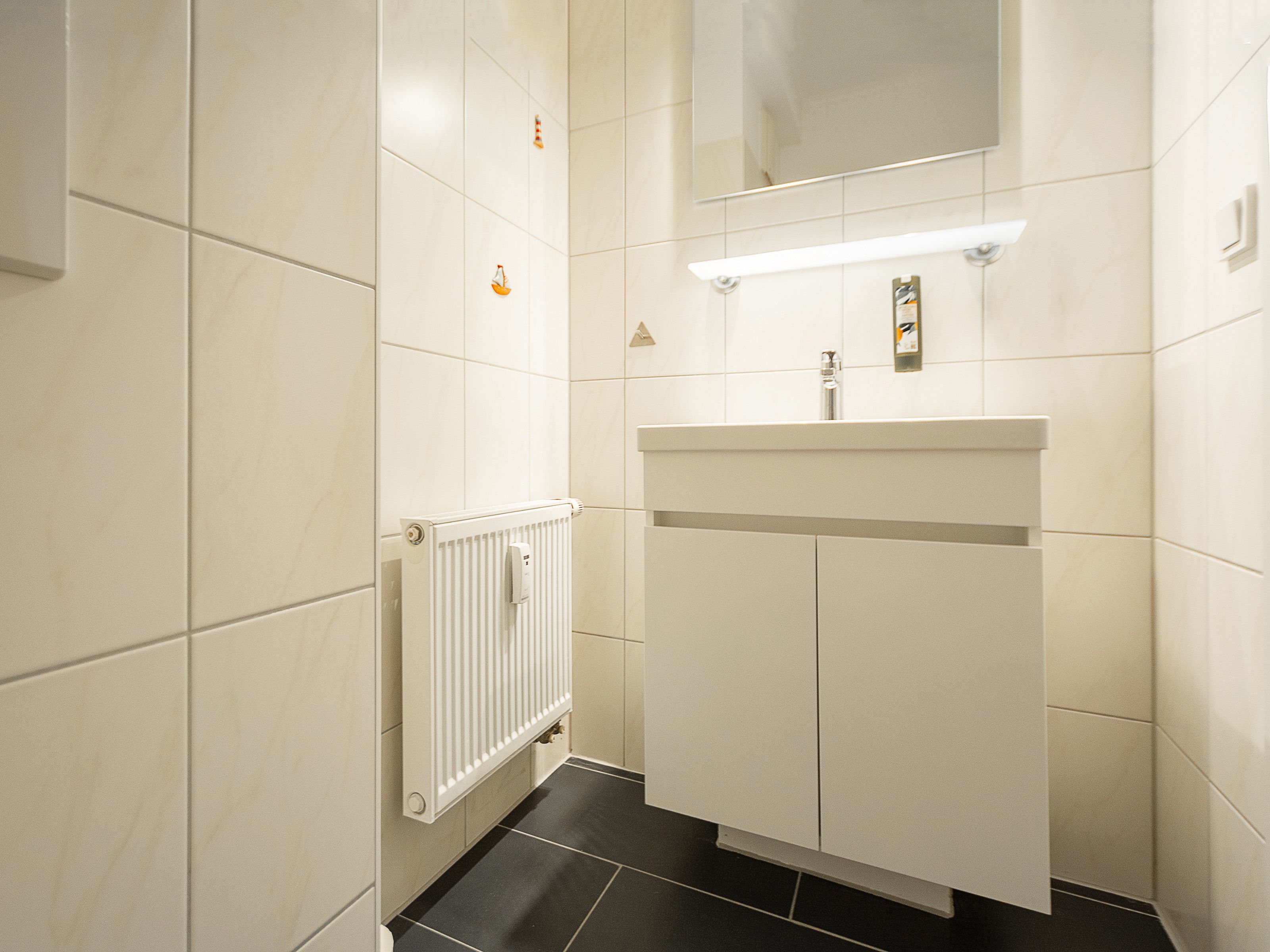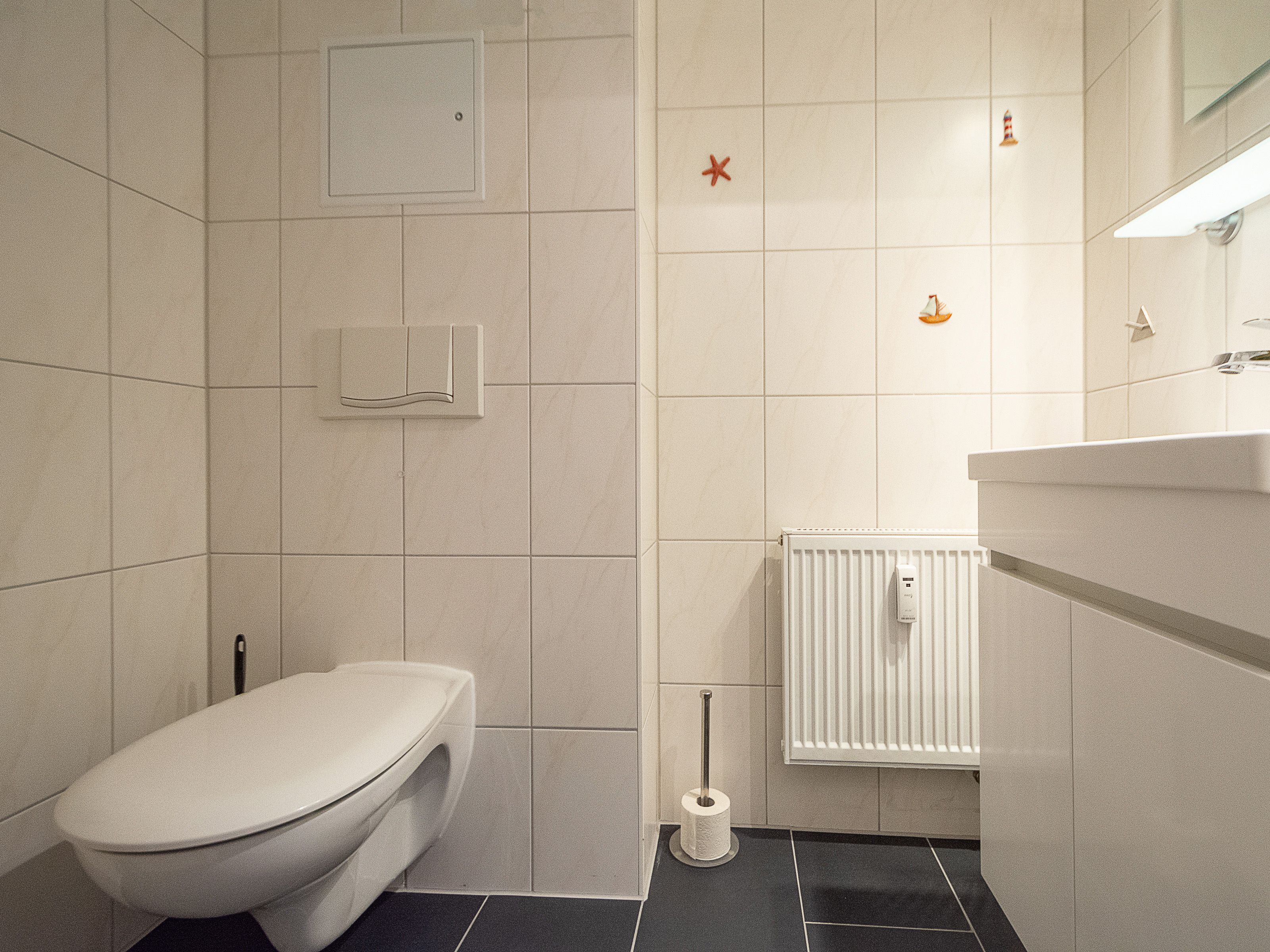 Das Bad mit Dusche, einem großen Waschtisch und Ablagemöglichkeit für Ihre Badutensilien sowie das Gäste-WC runden das Gesamtbild dieser wunderschönen Ferienwohnung ab.