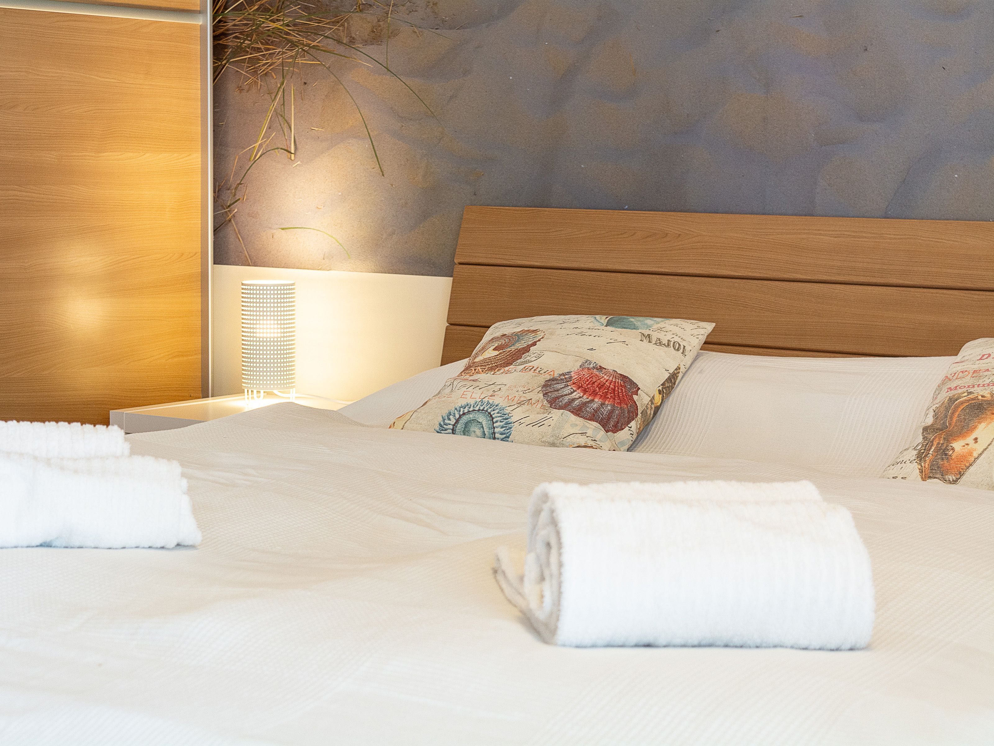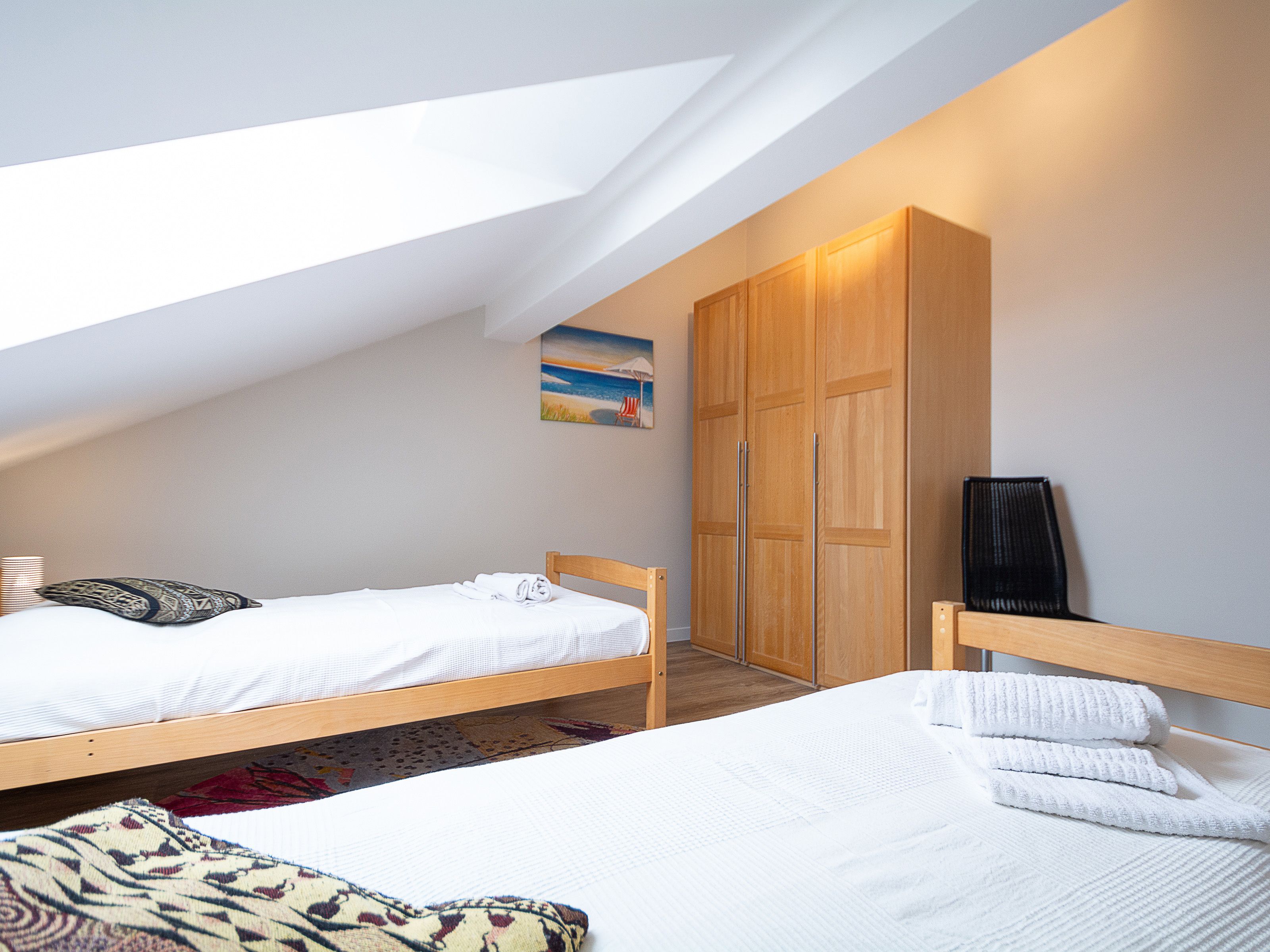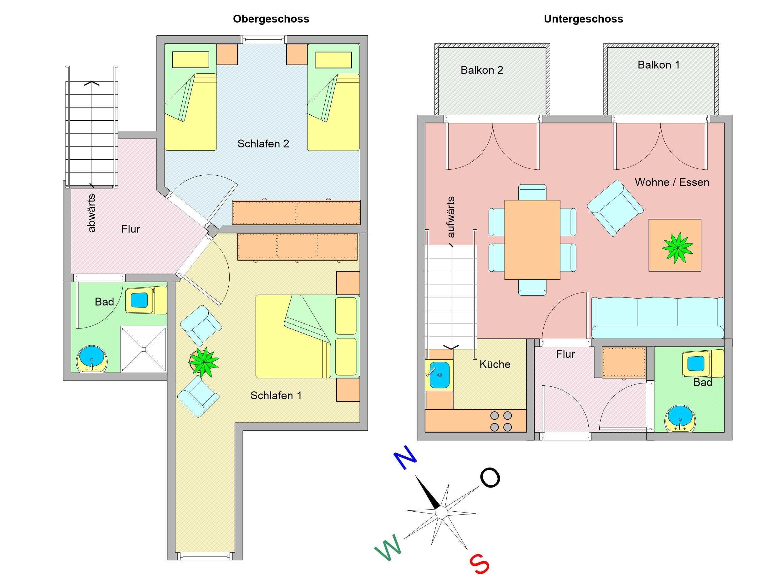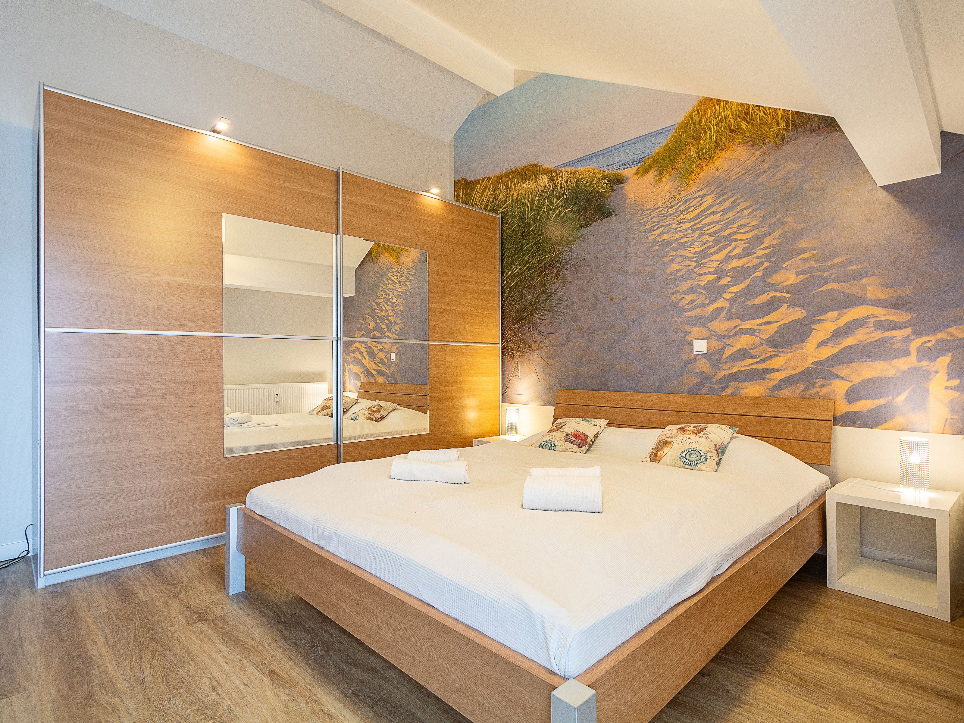 Im oberen Wohnbereich befinden sich die beiden Schlafzimmer und das Duschbad. Im ersten Schlafzimmer lädt Sie ein komfortables Doppelbett (2 x 90 x 200 cm) zur Nachtruhe ein. Der großzügige Kleiderschrank mit Ganzkörperspiegel bietet genügend Platz für Ihre Urlaubsgarderobe. Das zweite Schlafzimmer ist ausgestattet mit zwei Einzelbetten (jeweils 90cm x 200cm). Als Sichtschutz bzw. zum Verdunkeln sind in den Schlafzimmern Plissees an den Fenstern angebracht.