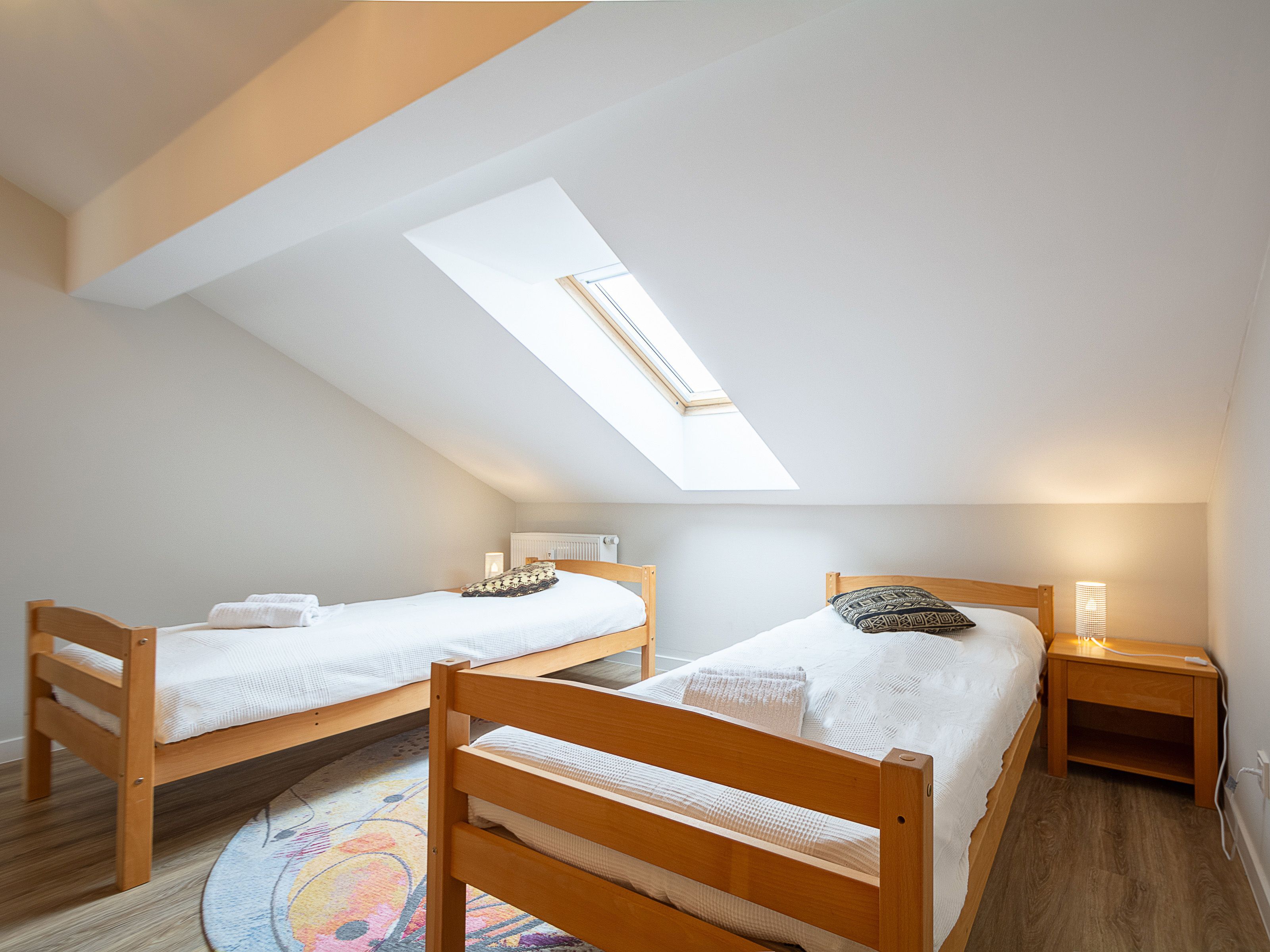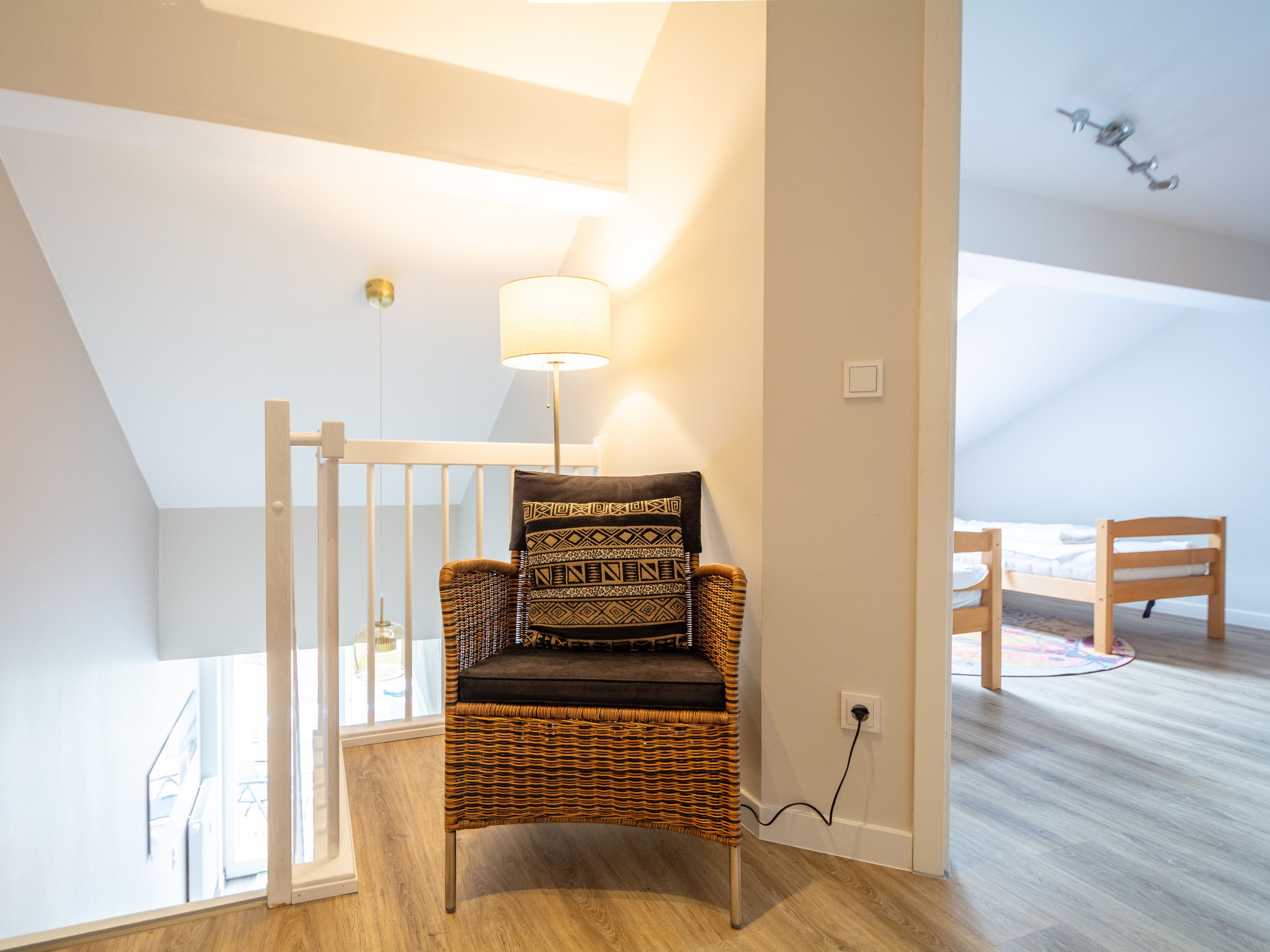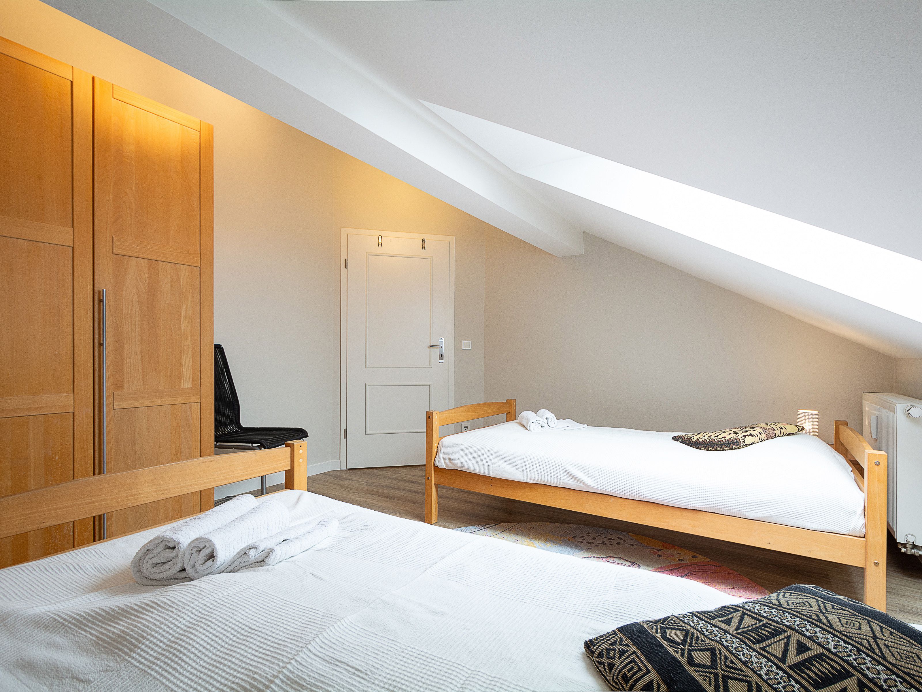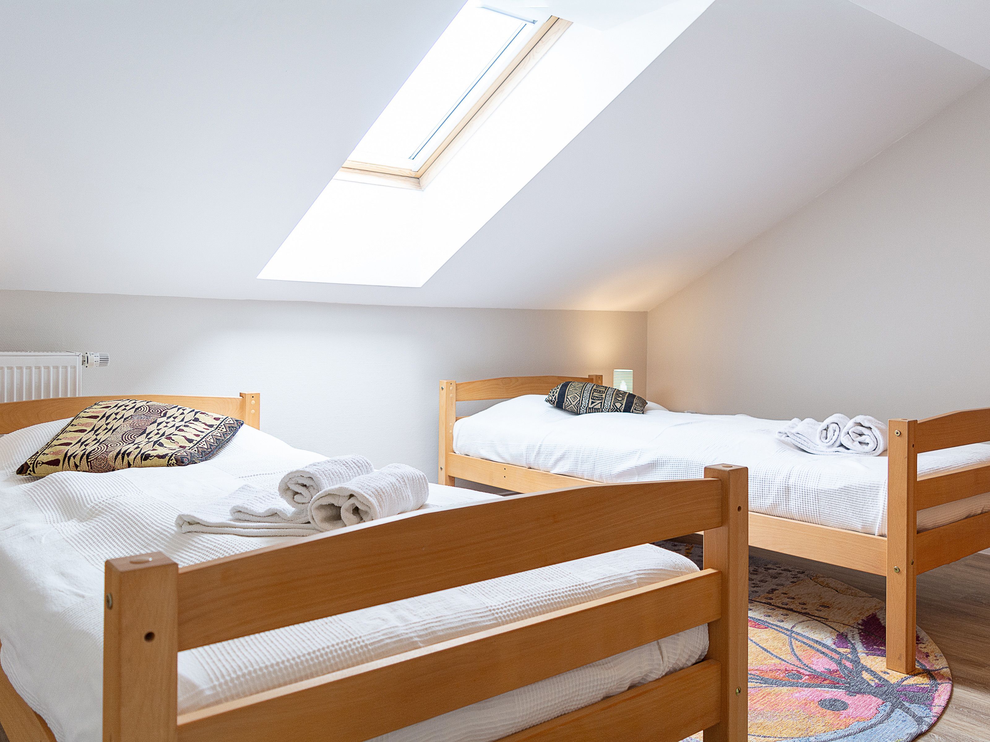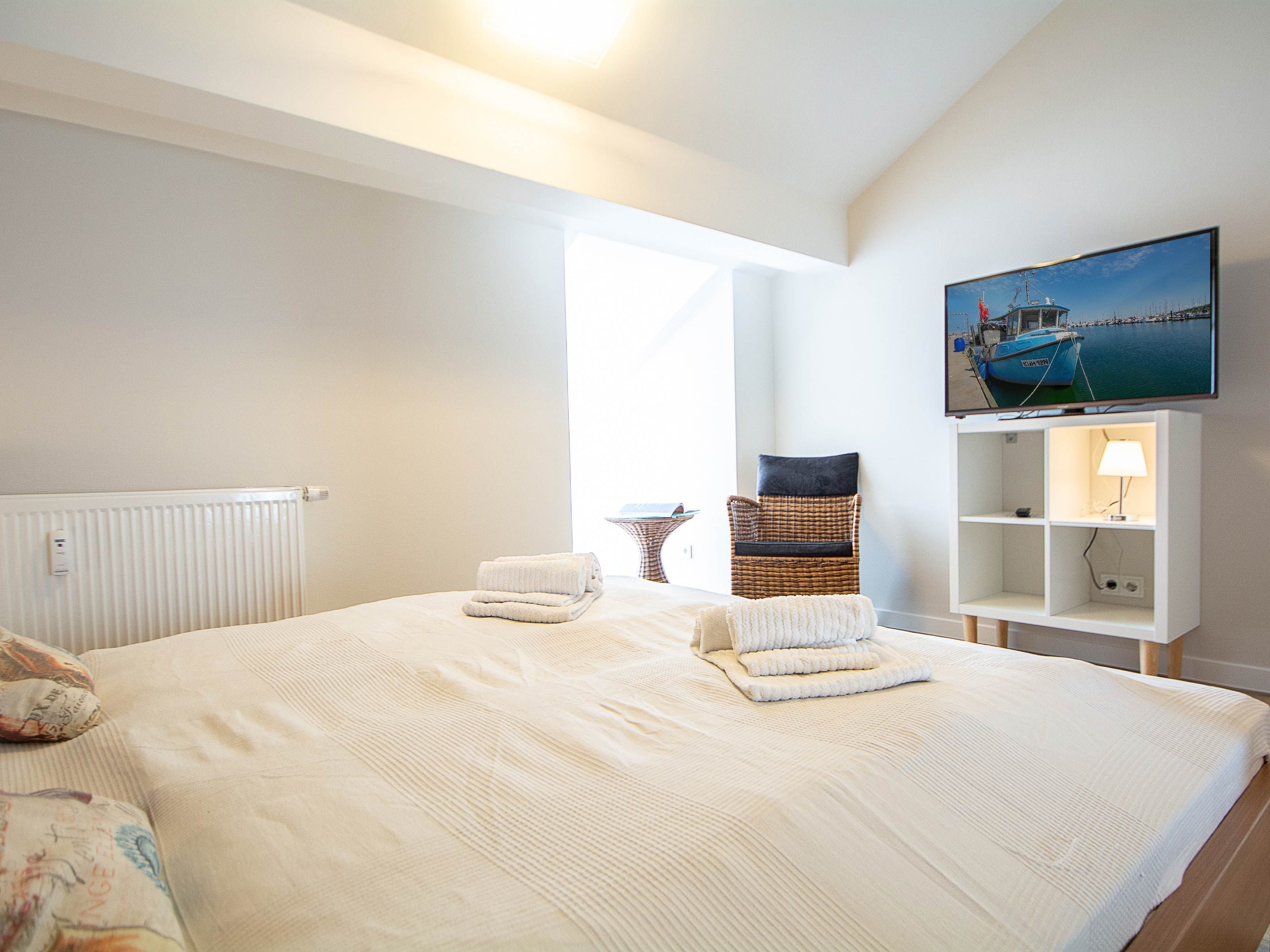 Im oberen Wohnbereich befinden sich die beiden Schlafzimmer und das Duschbad. Im ersten Schlafzimmer lädt Sie ein komfortables Doppelbett (2 x 90 x 200 cm) zur Nachtruhe ein. Der großzügige Kleiderschrank mit Ganzkörperspiegel bietet genügend Platz für Ihre Urlaubsgarderobe. Das zweite Schlafzimmer ist ausgestattet mit zwei Einzelbetten (jeweils 90cm x 200cm). Als Sichtschutz bzw. zum Verdunkeln sind in den Schlafzimmern Plissees an den Fenstern angebracht.