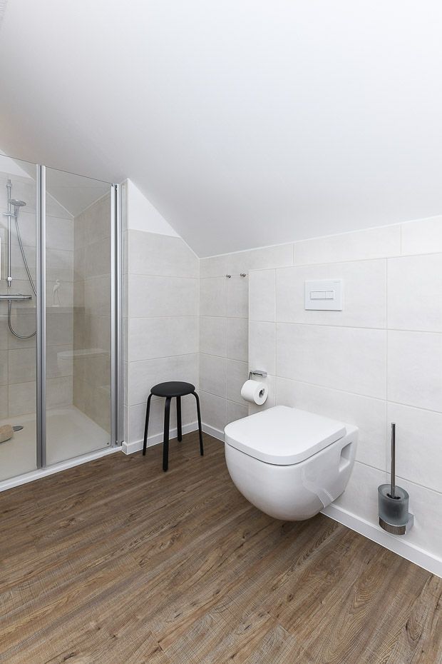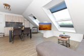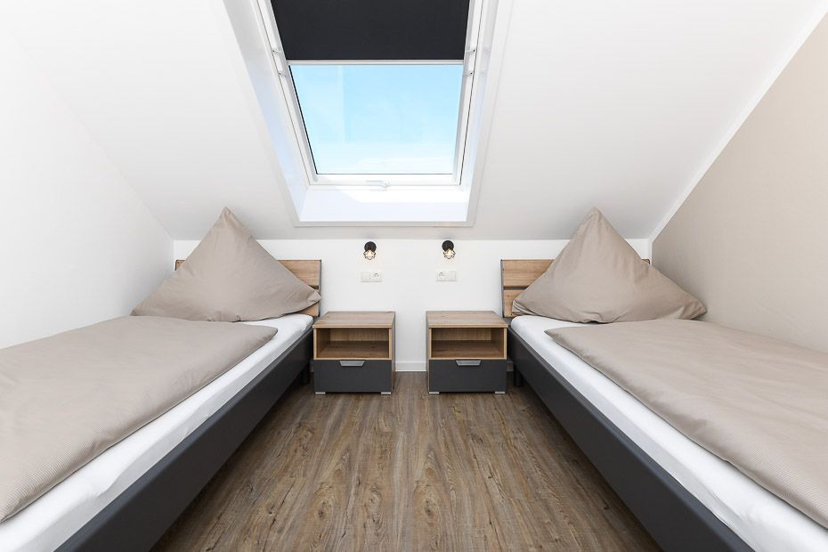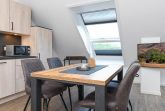Größe ca. 50 Quadratmeter. Wohnraum mit integrierter Küche. Schlafzimmer, zweites, separates Schlafzimmer, Badezimmer mit Dusche, Waschtisch und WC, Obergeschoss, optimal für 1 bis 4 Personen.