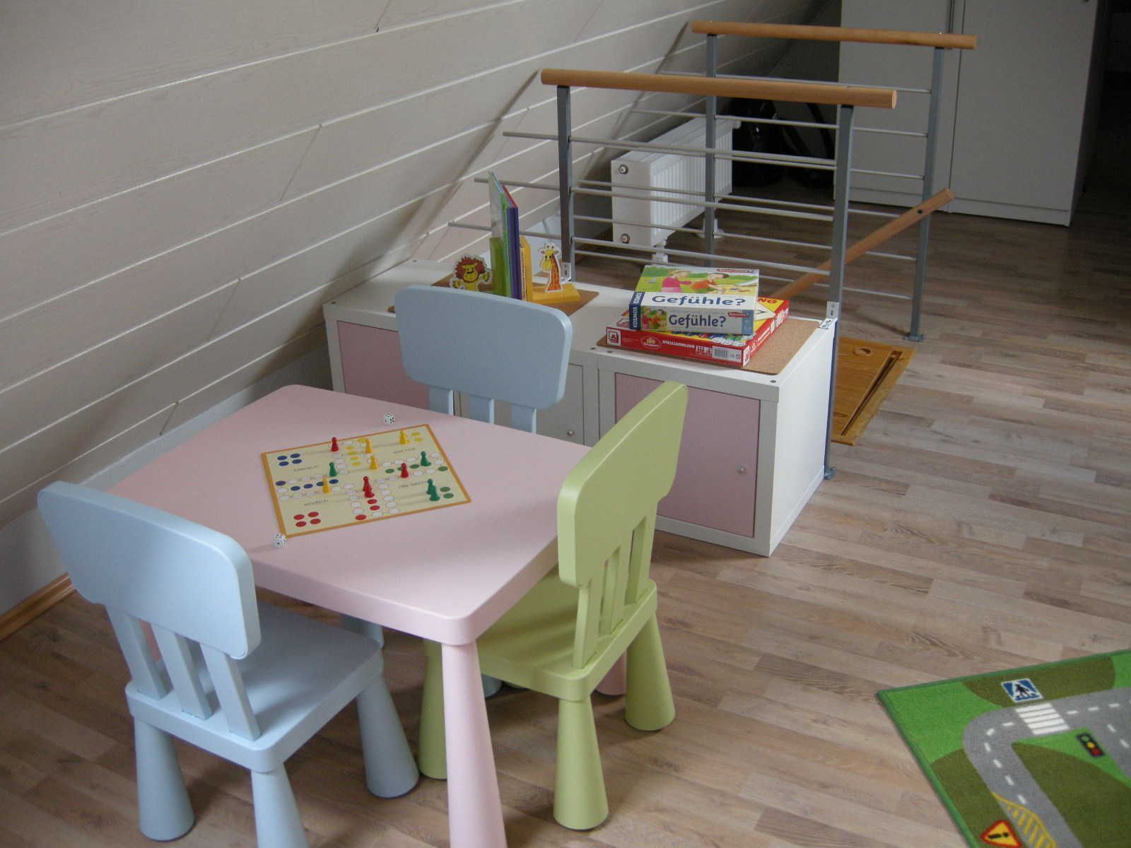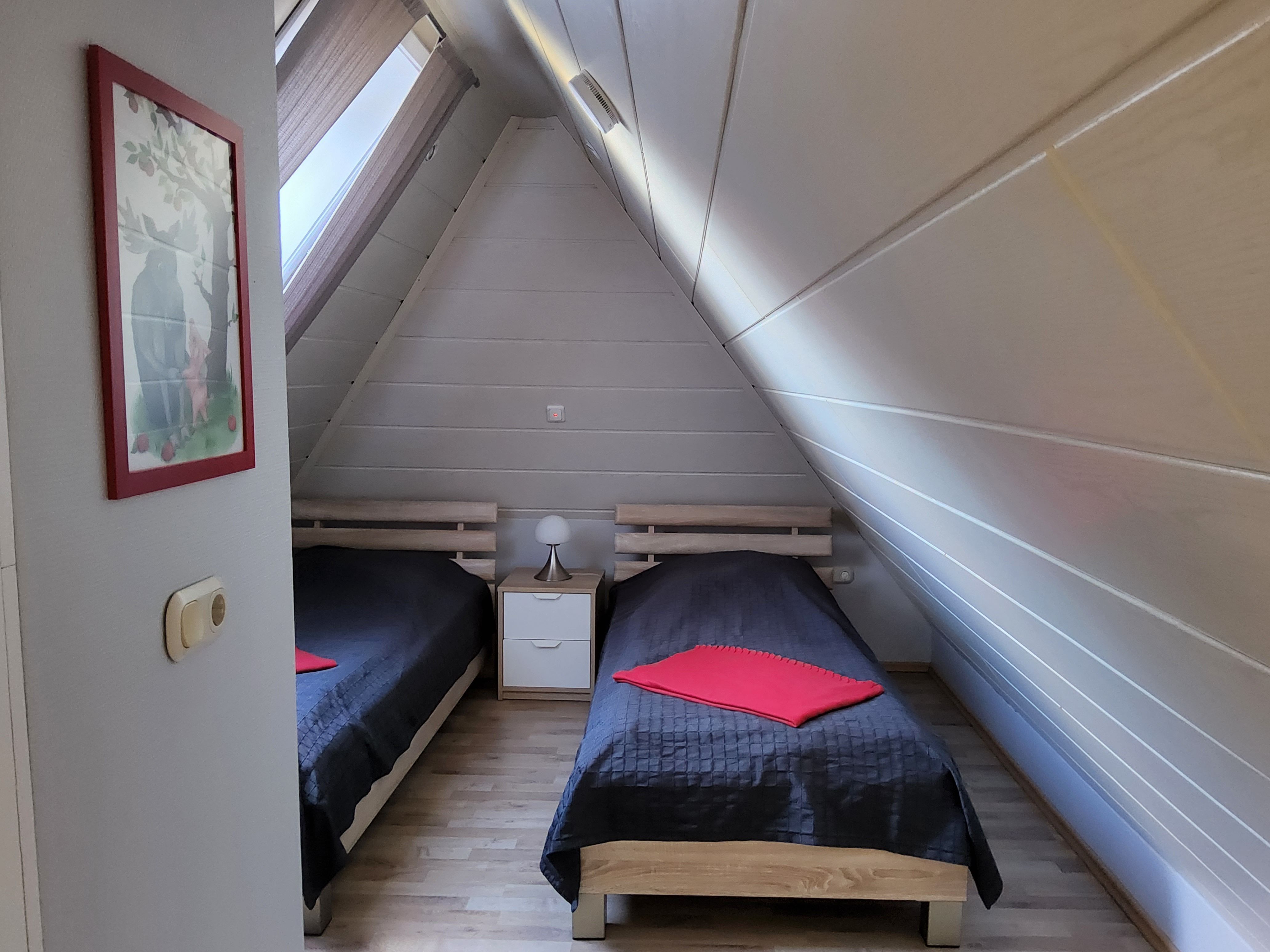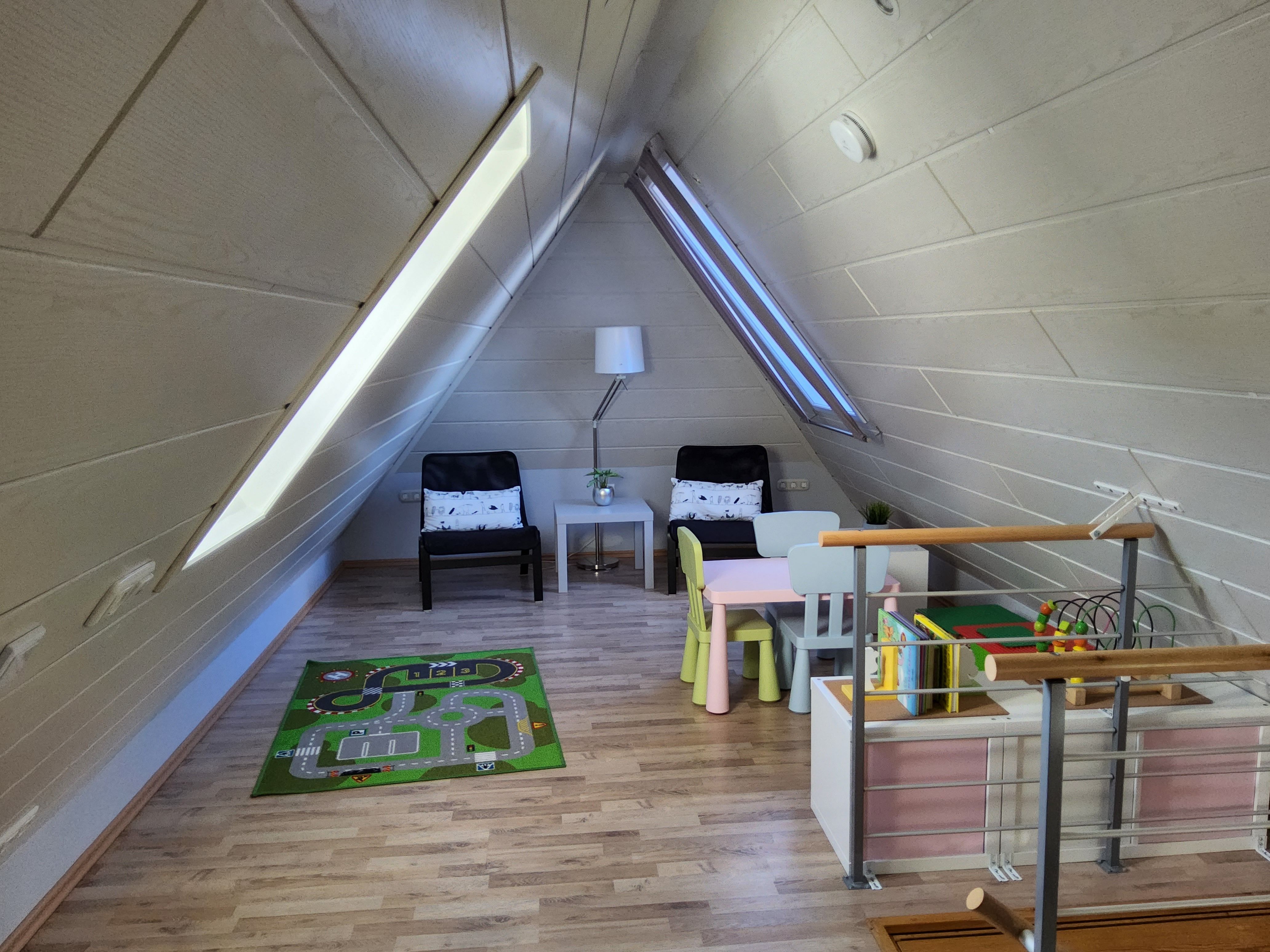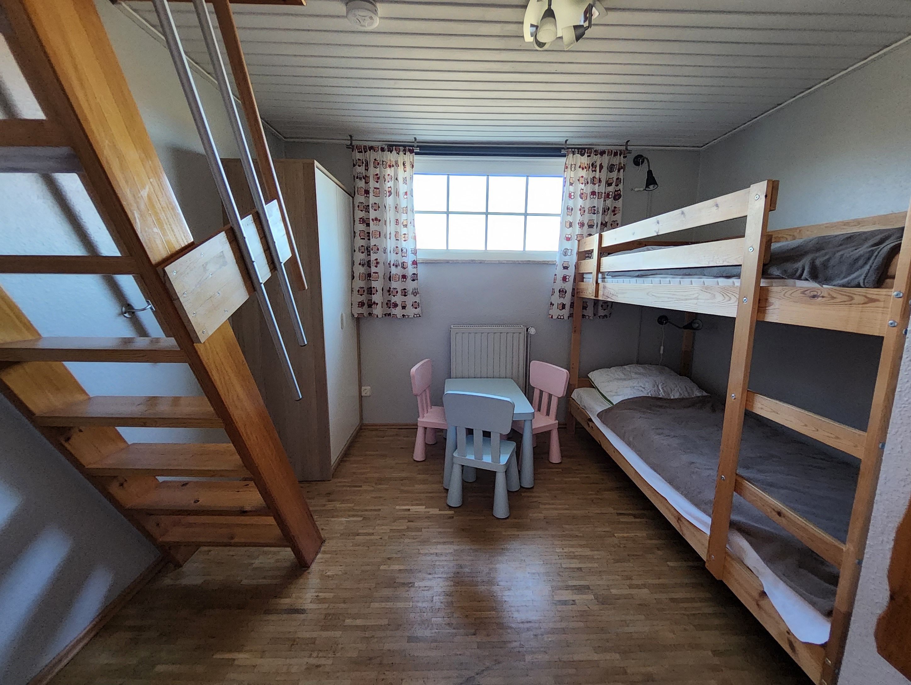 Eine Holztreppe führt in das ausgebaute Dachgeschoss mit zwei weiteren Schlafplätzen (Einzelbetten je 0,90 x 2m), einer gemütlichen Leseecke sowie einem Spielbereich für Kinder (diverse Spiele vorhanden). Hier lässt sich spielend auch mal ein Regentag überbrücken.