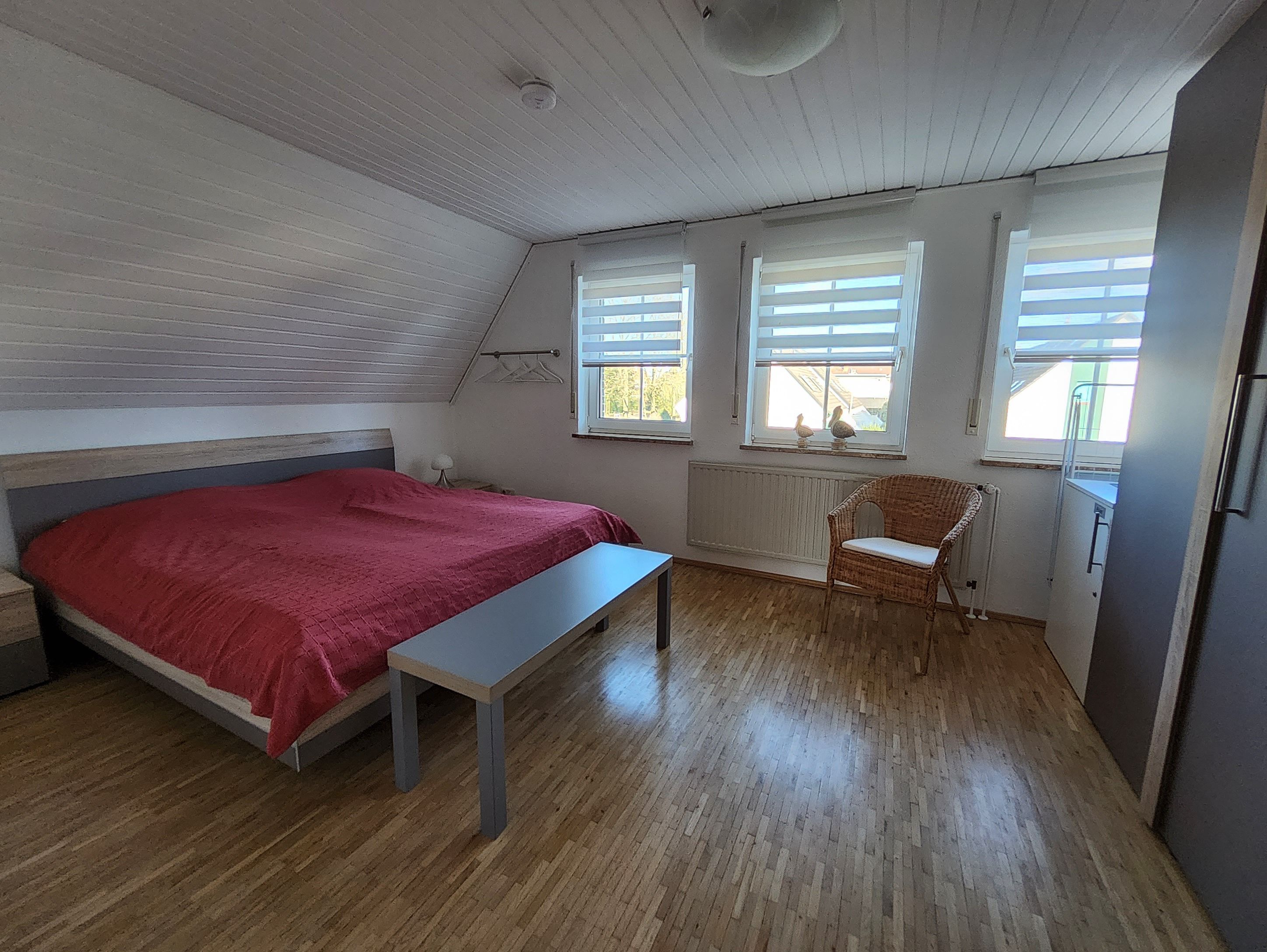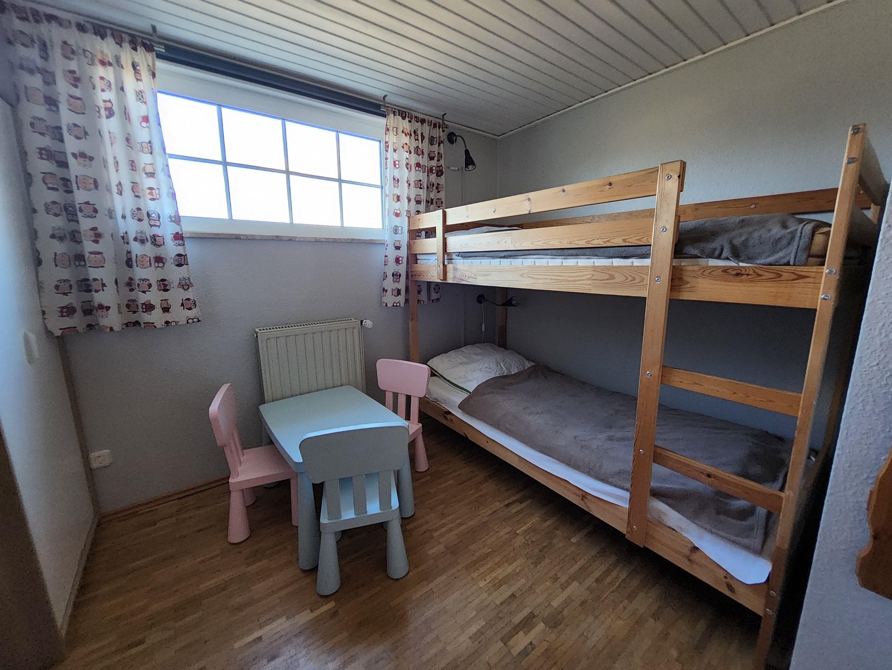 Auf der gleichen Etage befinden sich das Duschbad mit WC, ein großes Schlafzimmer mit Doppelbett (1,80 x 2m) sowie ein weiteres Schlafzimmer bis Ende Oktober 2025 mit Etagenbett, ab November 2025 mit Einzelbett.