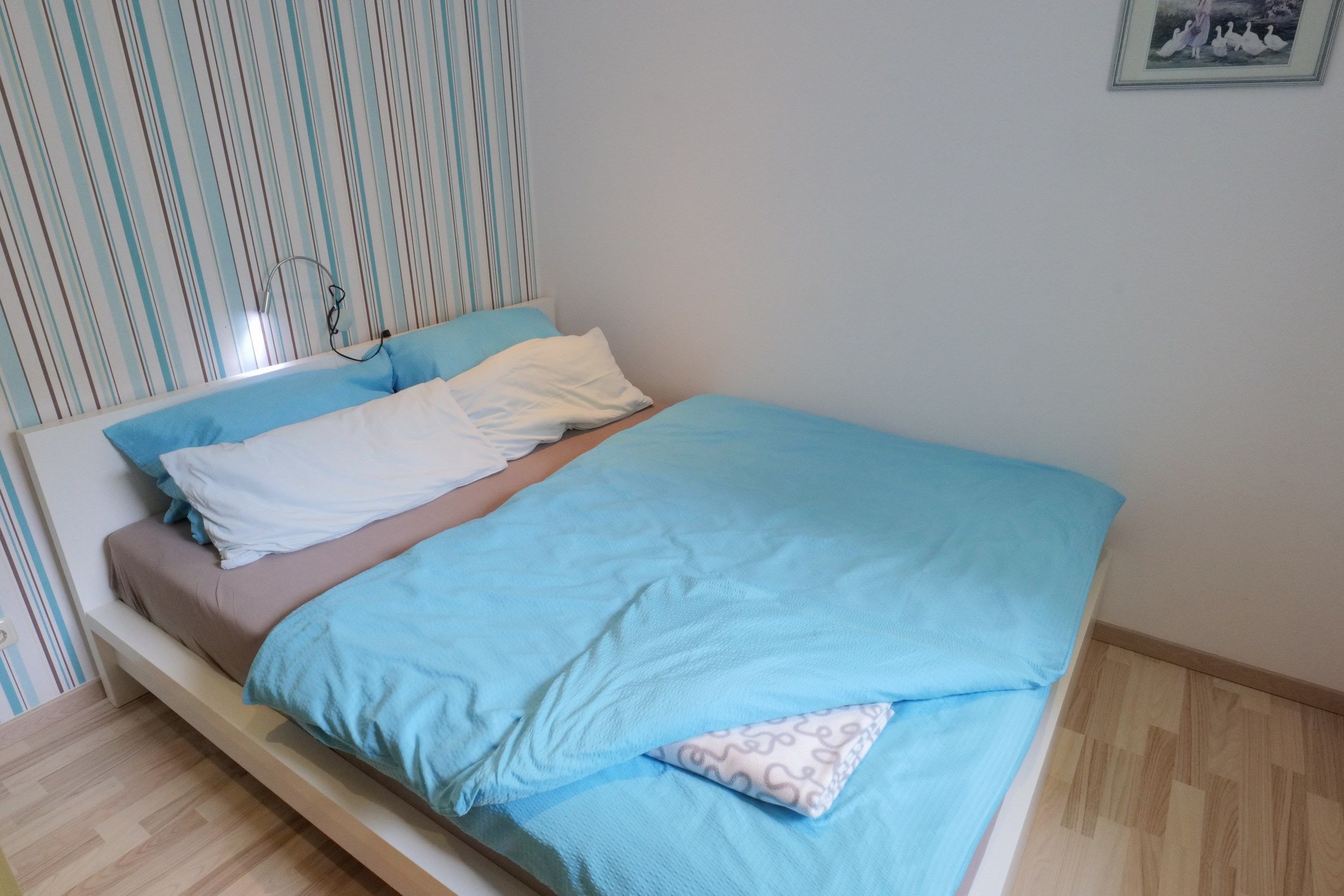 Das Schlafzimmer verfügt über einen großzügigen Kleiderschrank und ein gemütliches Doppelbett