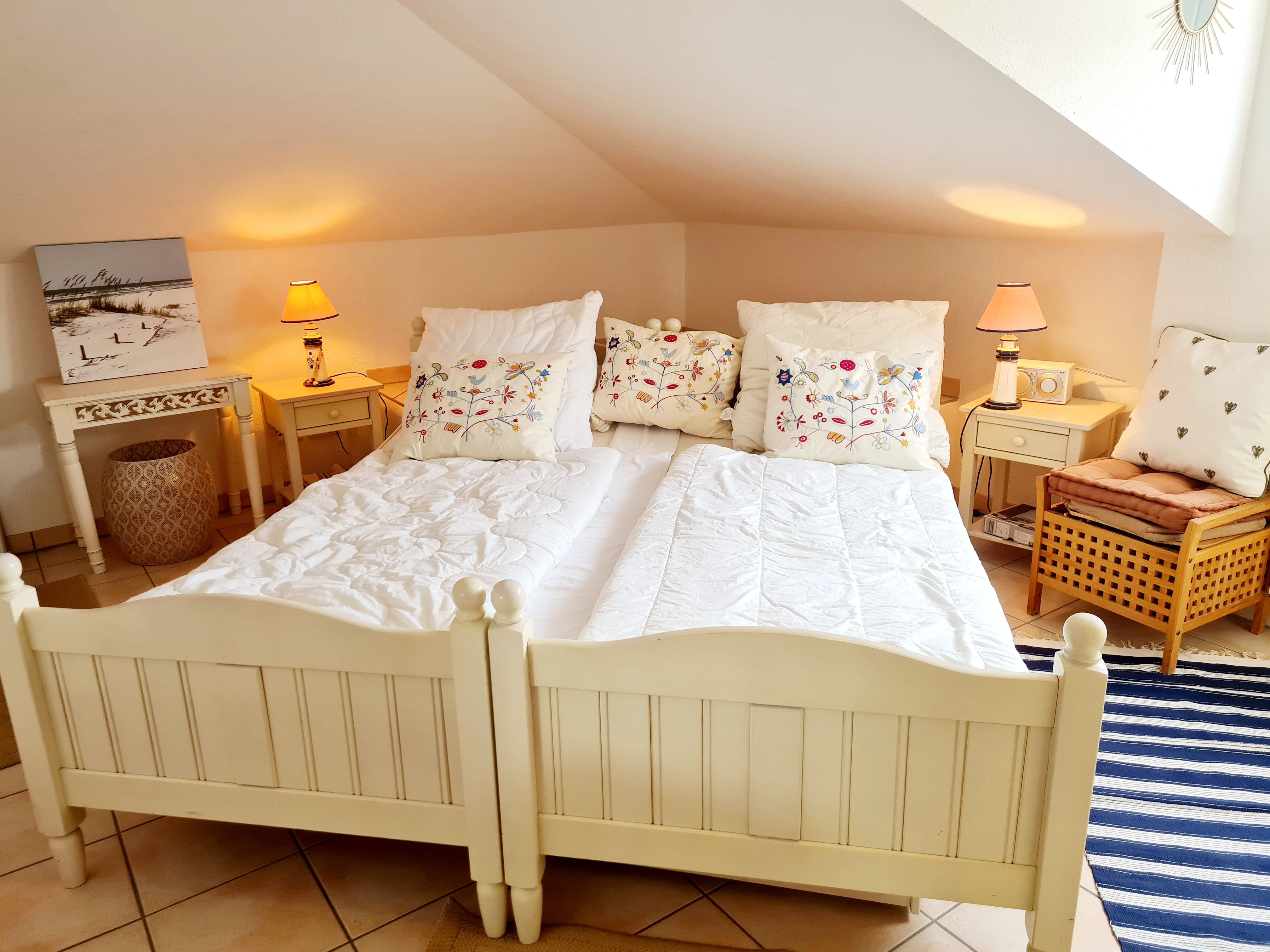 • Schlafzimmer: 2 Einzellbetten von 90x200cm, 2 Nachttische mit Nachttischlampen, Kleiderschrank, Faltrollo-Plissees